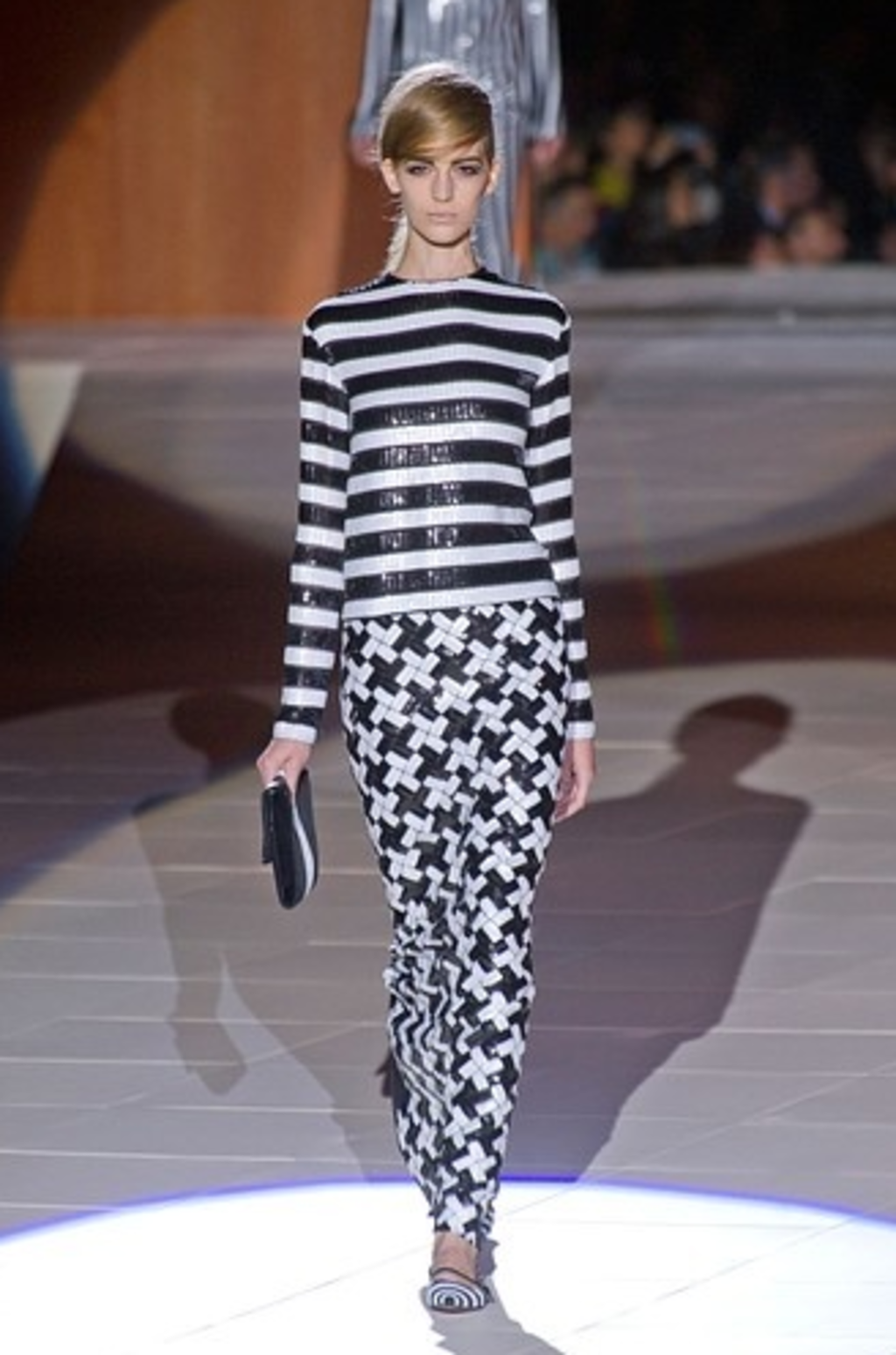 If you really want to have fun with this style, try accenting it with an additional color or a varying fabric. Starting with a basic, like black and white, adding a pop of color is very simple. Or by adding a fabric like leather you can really add a modern sheen to this old-school style. Marc Jacobs stepped the look up with sequins instead of a traditional fabric and mixed a wide striped top with a modern-herringbone/giant-x skirt.