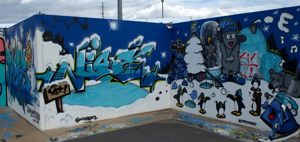 It’s no surprise that the X-Men Krew showed up to paint at the amazing Snowball event. This entire piece is three panel collaborative mural created by Chris Haven, Tristan Mintan aka Royal Stain, and Nice Beats. It has all the movement, color, and excitement that you expect from each of the artists. Their styles blend seamlessly.