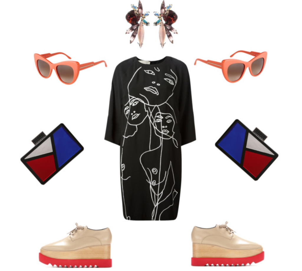 Gabrielle Earrings: $143 // Red Sunglasses: $300 // Stella McCartney Dress: $1553 // Les Petits Joueures Clutch: $897 // Platform Brogues: $995