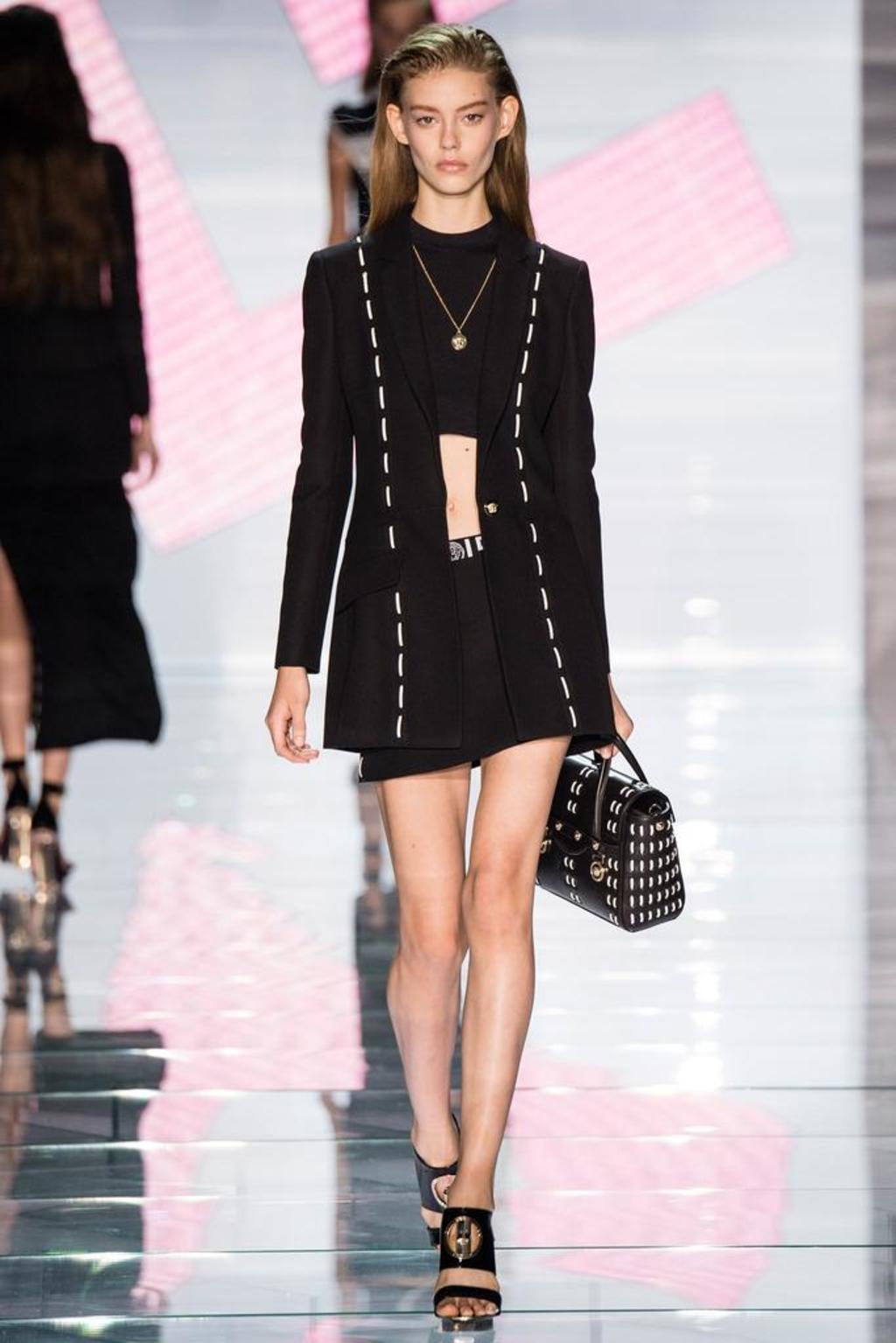 Yet another all black look thats meant for spring, but hey…we’re not complaining. Versace is known for their black and gold looks which are usually flamboyant and heavy in print. This season they took it a bit easier with a black and white blazer skirt combo thats classic yet sexy. The crop top underneath the long jacket is an extremely Italian look for the new age. A matching black and white bag gives to that classic feel while a gold shimmer on the heels gives the  looks some glamour. Can’t wait for next season to sport this look? Find the links below.