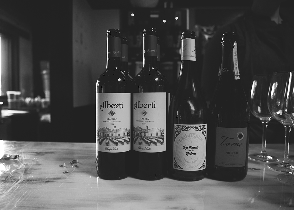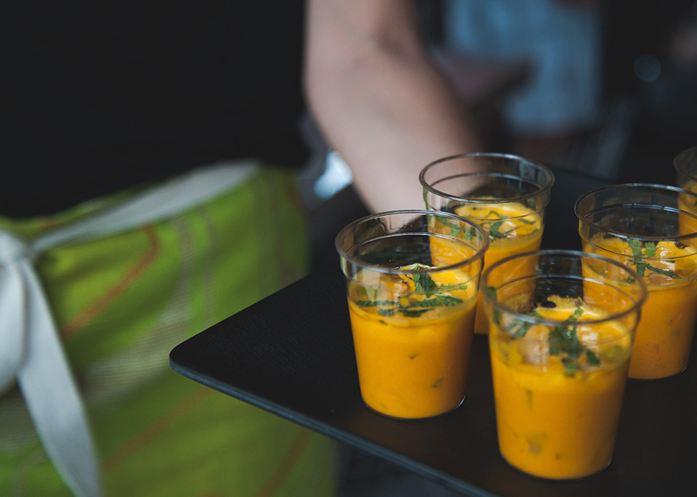 Vital Root’s open and airy space is filled with natural light pouring in from two garage door openings and skylights covered with warm red filters. The decor is a mix of modern and retro-vintage. Cucci’s design sense is evident when looking up into the colorful repurposed paint can spotlights that create an almost exhibit-like light source above an indoor Japanese maple. Painted exposed brick walls of creamy white and dull black are adorned with vintage vegetation prints, while the back patio walls are lined with colorful cafeteria trays highlighting the herbs planted in front of them. The clear, retro resin patio table tops are filled with green grass and little plastic insects.