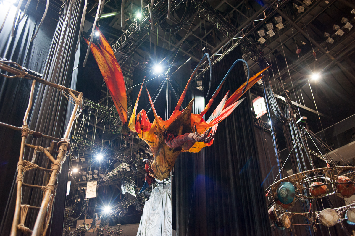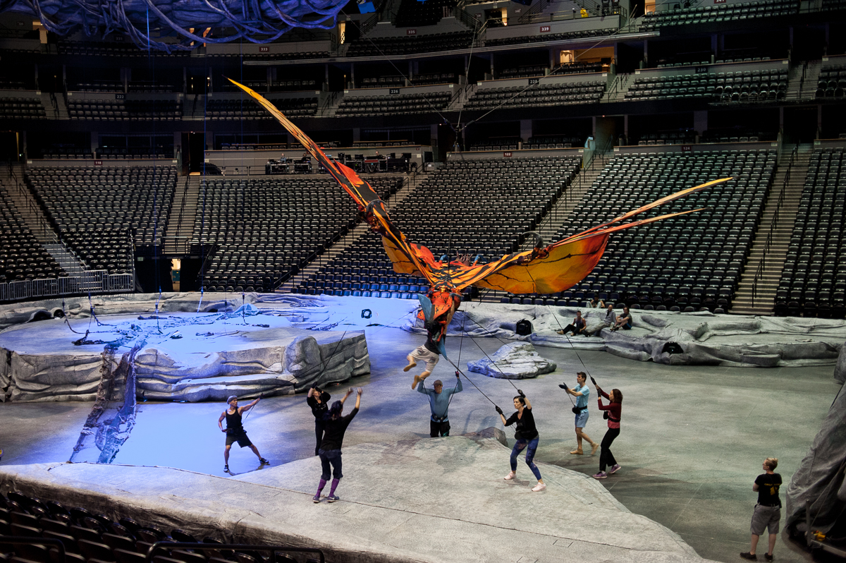 Also, there are a lot of puppets in Toruk. Toruk, a great leonopteryx (a Pandora native predatory animal) is a 40-foot puppet, brought to life by puppeteers. The puppeteers will be in all black and this is the first Cirque show to have them.