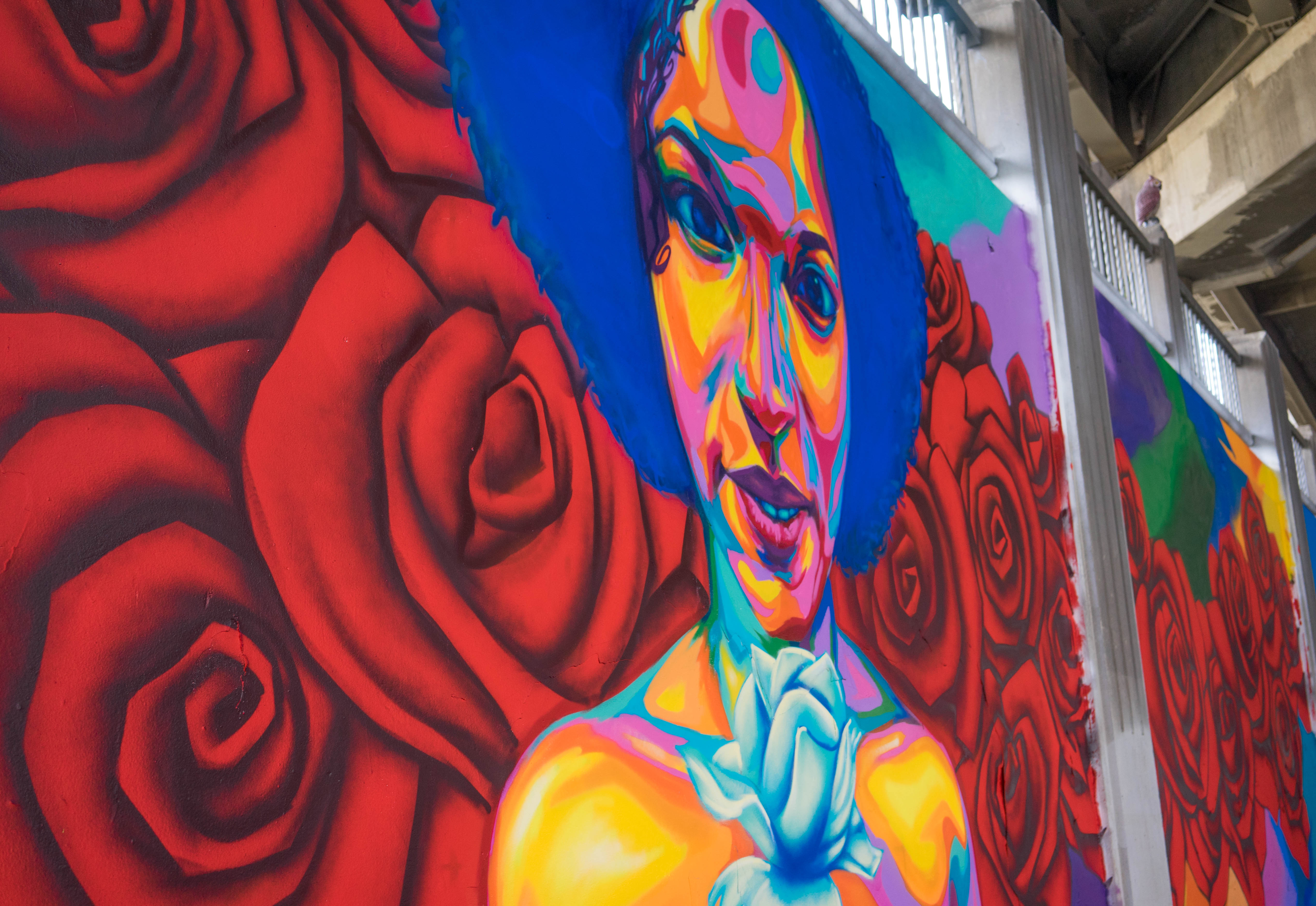 The murals, some as large as 15 feet tall, span the stretch of road between Brighton Boulevard and York Street near 46th street. The works feature everything from floral and geometric designs to one made by artist Paige Madden, who used found objects from the viaduct to make her piece.