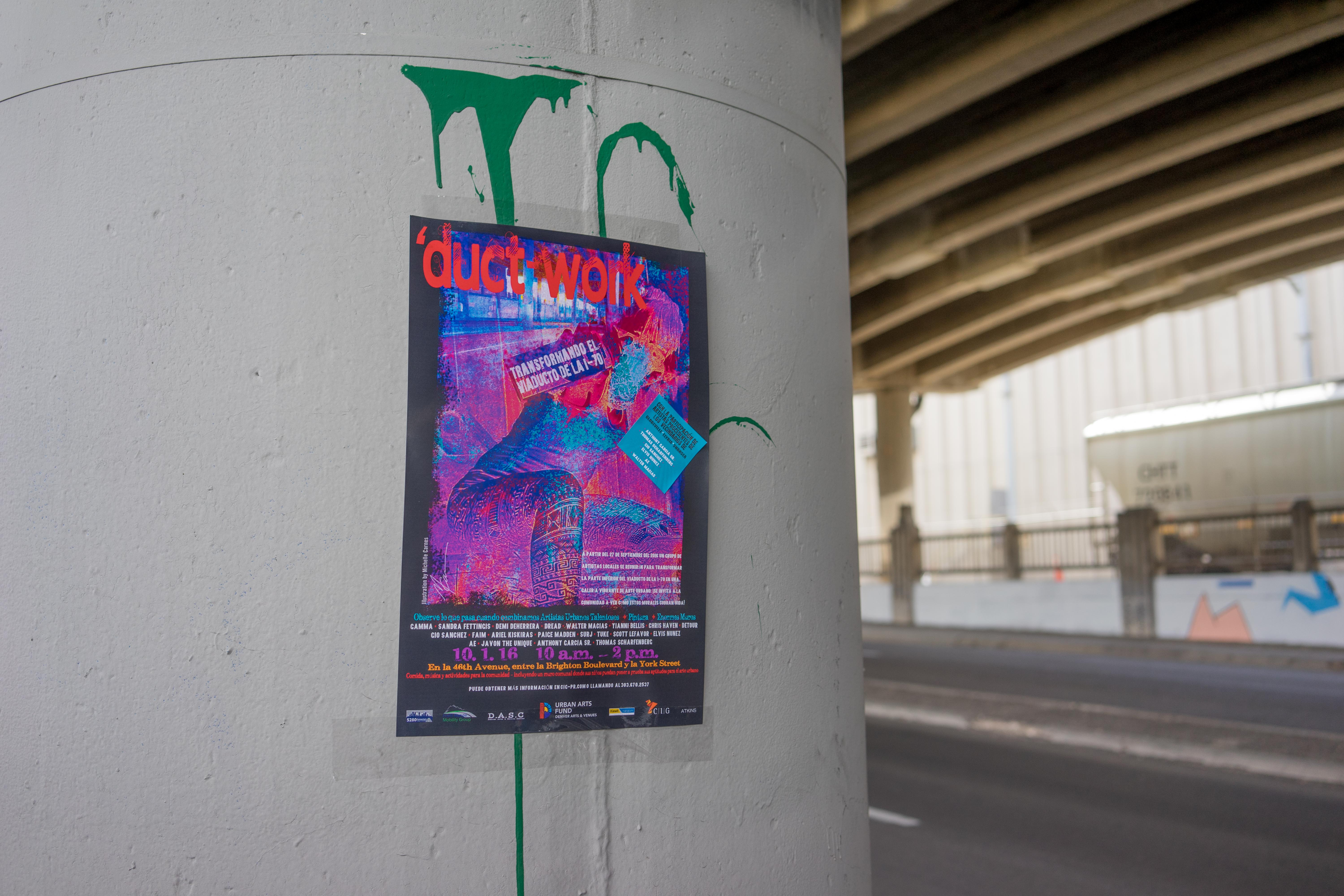 This week, one of the most contested areas in Denver received a makeover. Nineteen local artists, in partnership with the Denver Arts & Venues Urban Arts Fund, came together to beautify the I-70 viaduct before it is demolished in early 2018. The corridor became a point of contention when the state unveiled its plans to expand the section of I-70. Opponents of this measure argue the expansion is a costly, ineffective project that will only cause pollution and displacement of residents in the Globeville, Elyria and Swansea neighborhoods. But those involved with the expansion contest their focus remains on improving the community. The current project, dubbed ‘duct-work, aims to drive that point home.