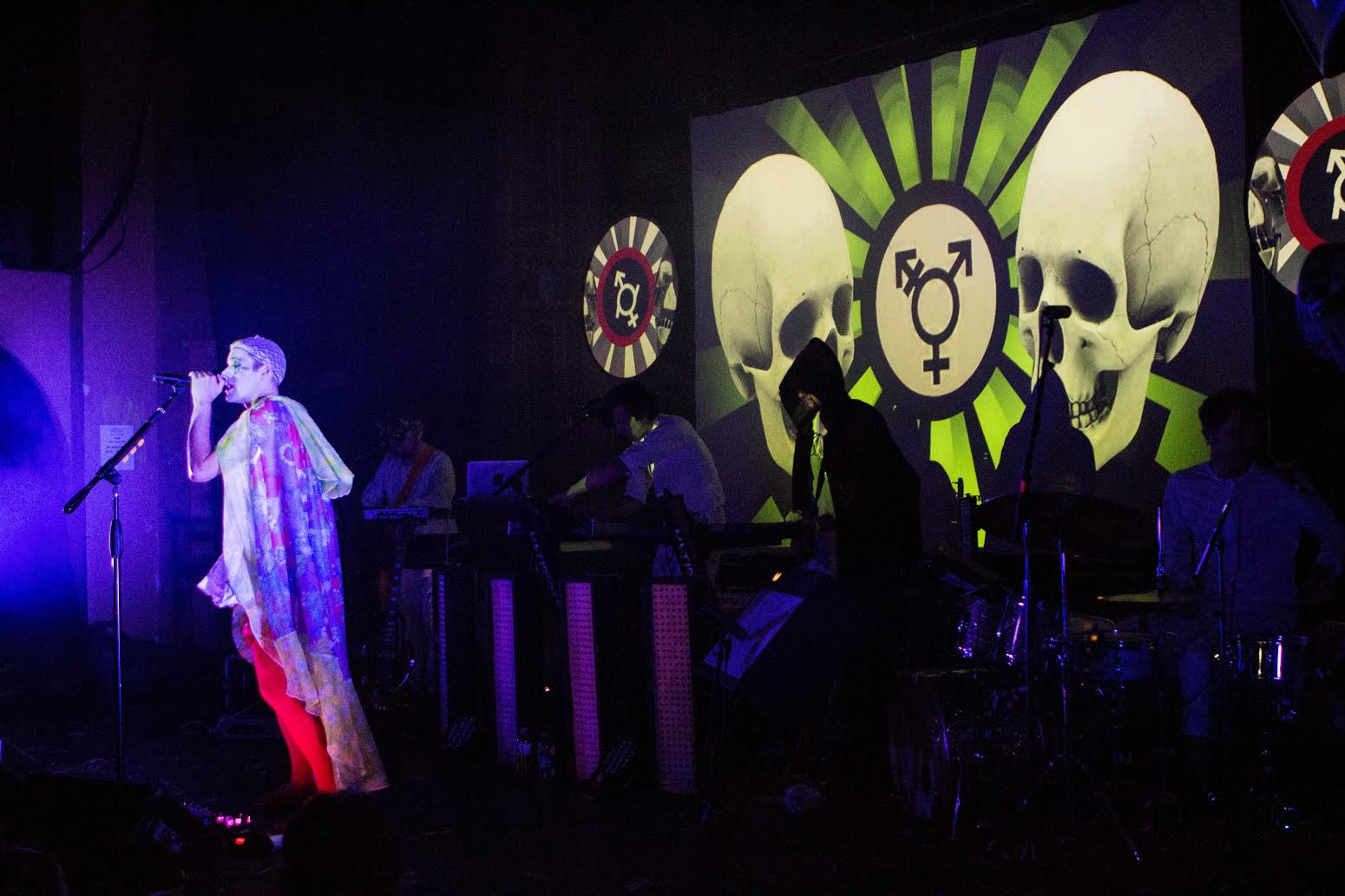 There was screaming and cheers from the packed venue, but the band allowed one moment of silence before everything was set ablaze in a creative, over-stimulating dreamscape. The music began hard and the band members threw their black cloaks to the ground to reveal white ensembles that made them look like sailors. The screen was set aglow with psychedelic visuals and images of hairless cats. Min Riches crooned into the microphone removing his own hood to reveal a beautiful beaded cap and over-the-top makeup.