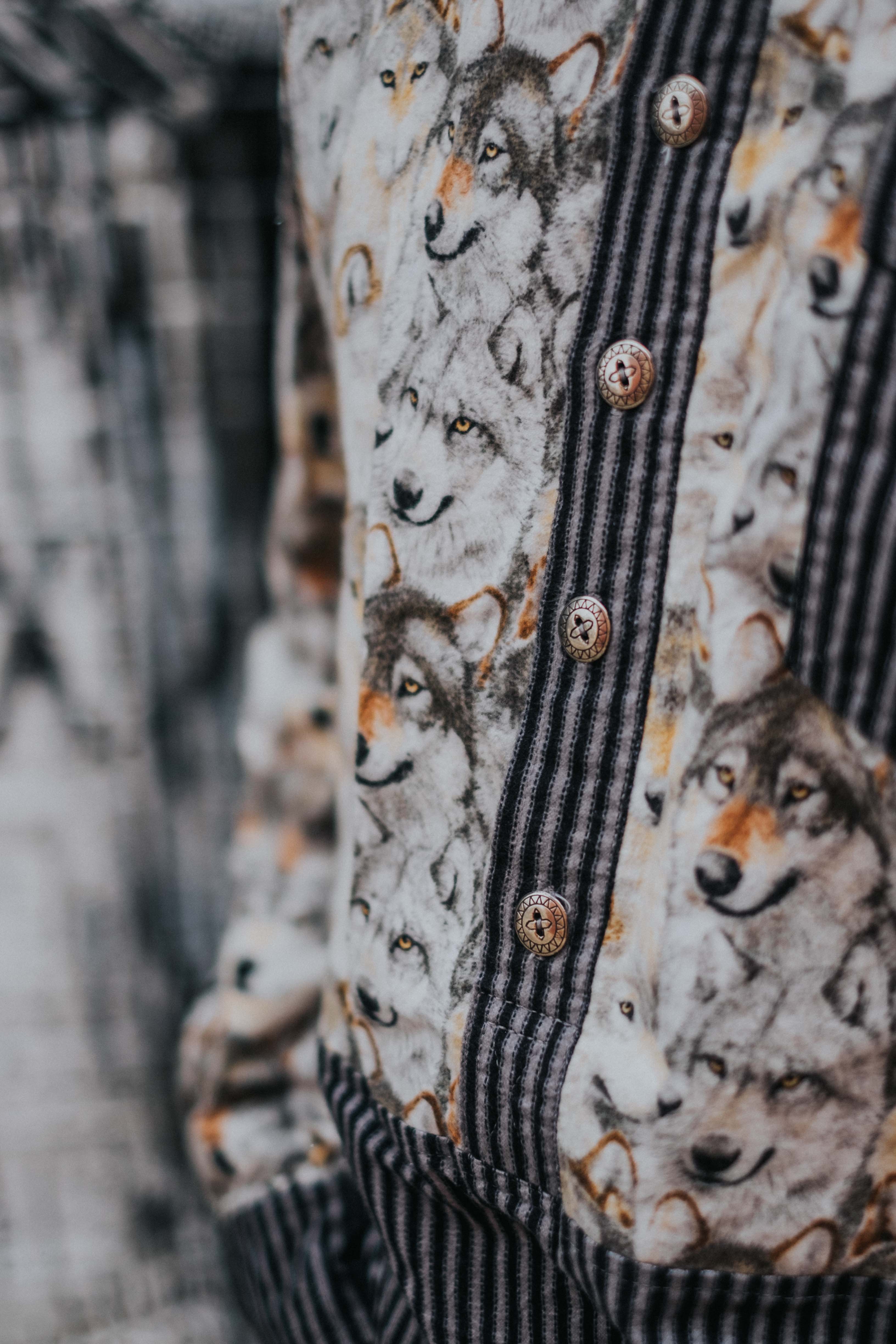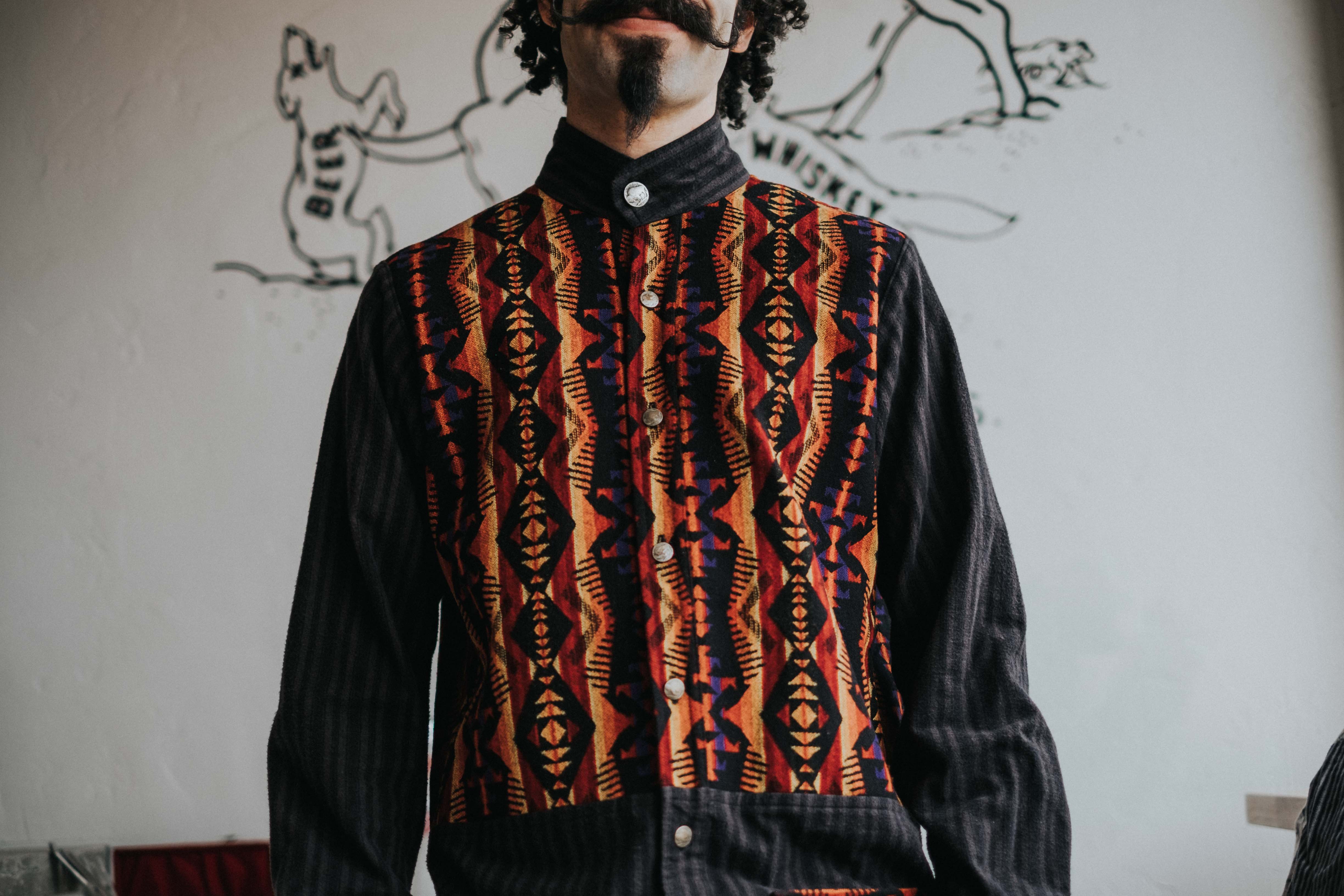MG: These are all recent shirts, within the last year. My mom and I pick up fabrics together. We have one with Pendleton fabric, one with batik fabric, and some flannels. All the shirts are aimed at combining cultures and to have the function of warmth during the winter. When I spotted that awesome wolf print fabric, I thought, “I have to make something with that!”