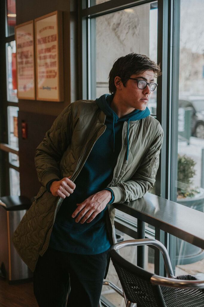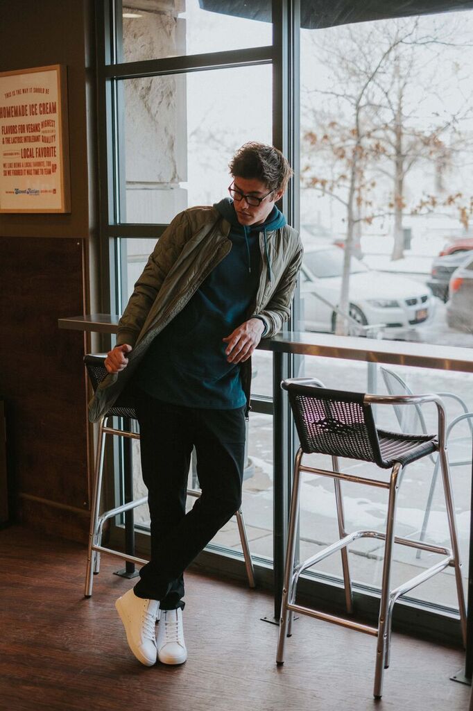 The Lowdown: DVSN WEST is the place for urban looks and must-haves for trendy hipster style. The look above makes relaxed fit stylish with black chino pants, a textured teal hoodie, an army green trench jacket and lace-up white shoes. The eye-catching colors on top nicely complement the neutrals on bottom. This style is urban and on-trend all the way.