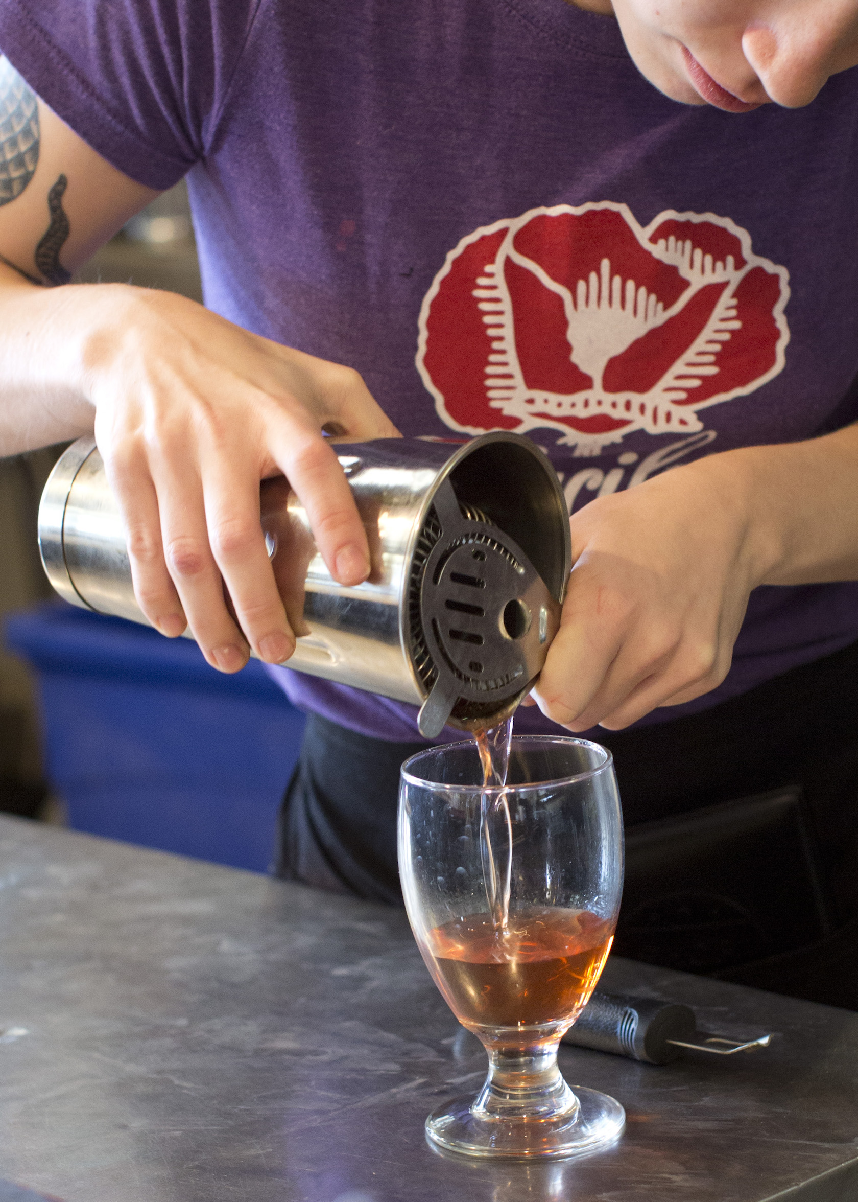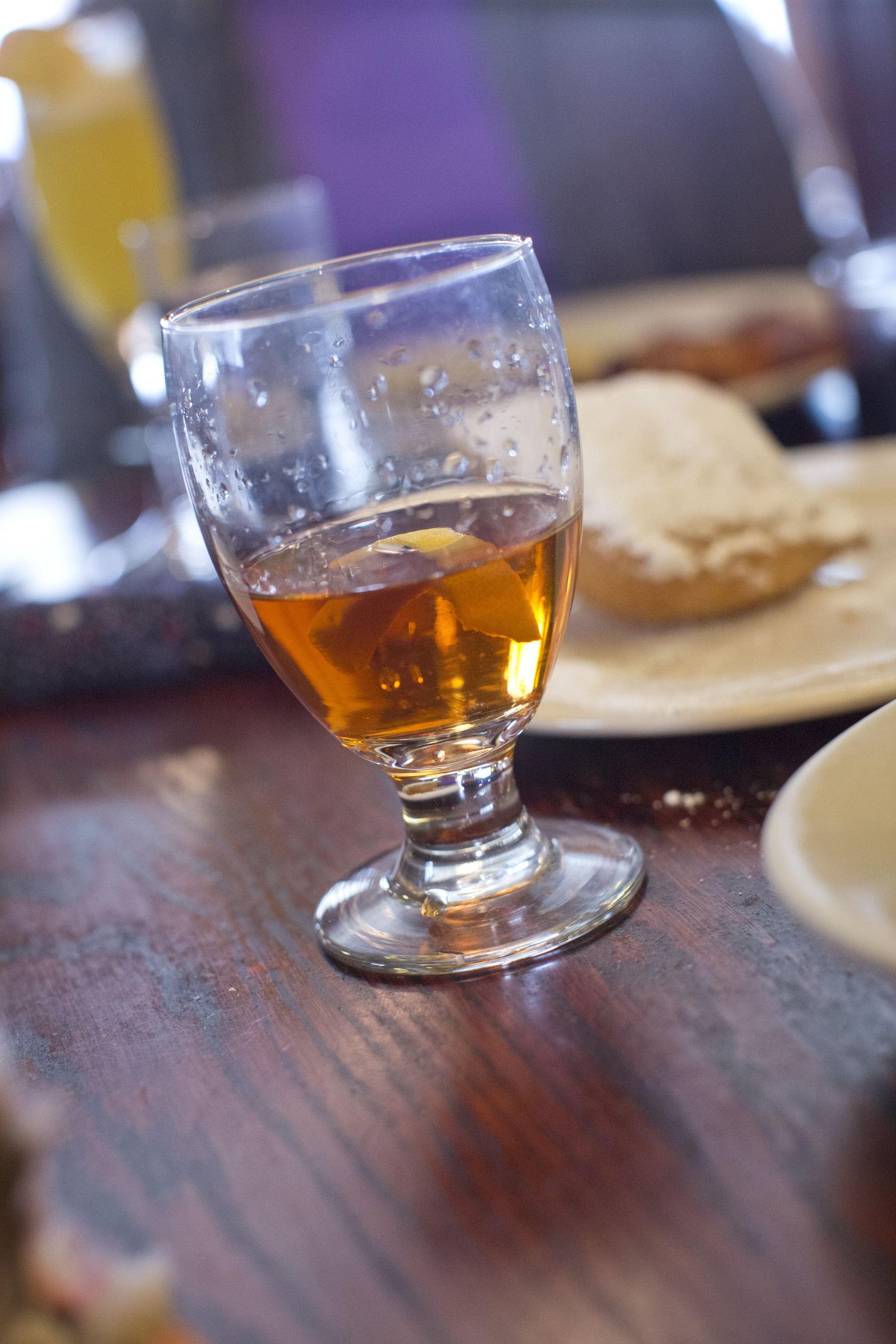 Lucile’s Sazerac ($7 and the drink of the month) adds a special flare to this classic cocktail. Starting with an absinthe rinse, the bartender uses a spray bottle to spritz the inside of the glass. A technique that results in offering the essence of absinthe. The rest of the drink is perfectly balanced with a two ounce pour of Bulleit Rye, a squeeze of simple syrup, and of course, a few generous dashes of bitters. Stirred gently and strained into a rocks glass, the cocktail is finished with a peel of a lemon, expertly carved using a channel knife and rubbed along the rim of the glass before making the final plunge into the golden liquid. The taste is complex without being overdone, allowing the subtleties of every ingredient to make a stand, beginning with the herbaceousness of the absinthe, followed by the punch of rye, and finishing with the sweet and slightly medicinal bitters. The pith from the lemon twist adds the final component of bitter citrus, softening the sting of the rye. It was surprising how easily and how quickly that cocktail did a disappearing act.
