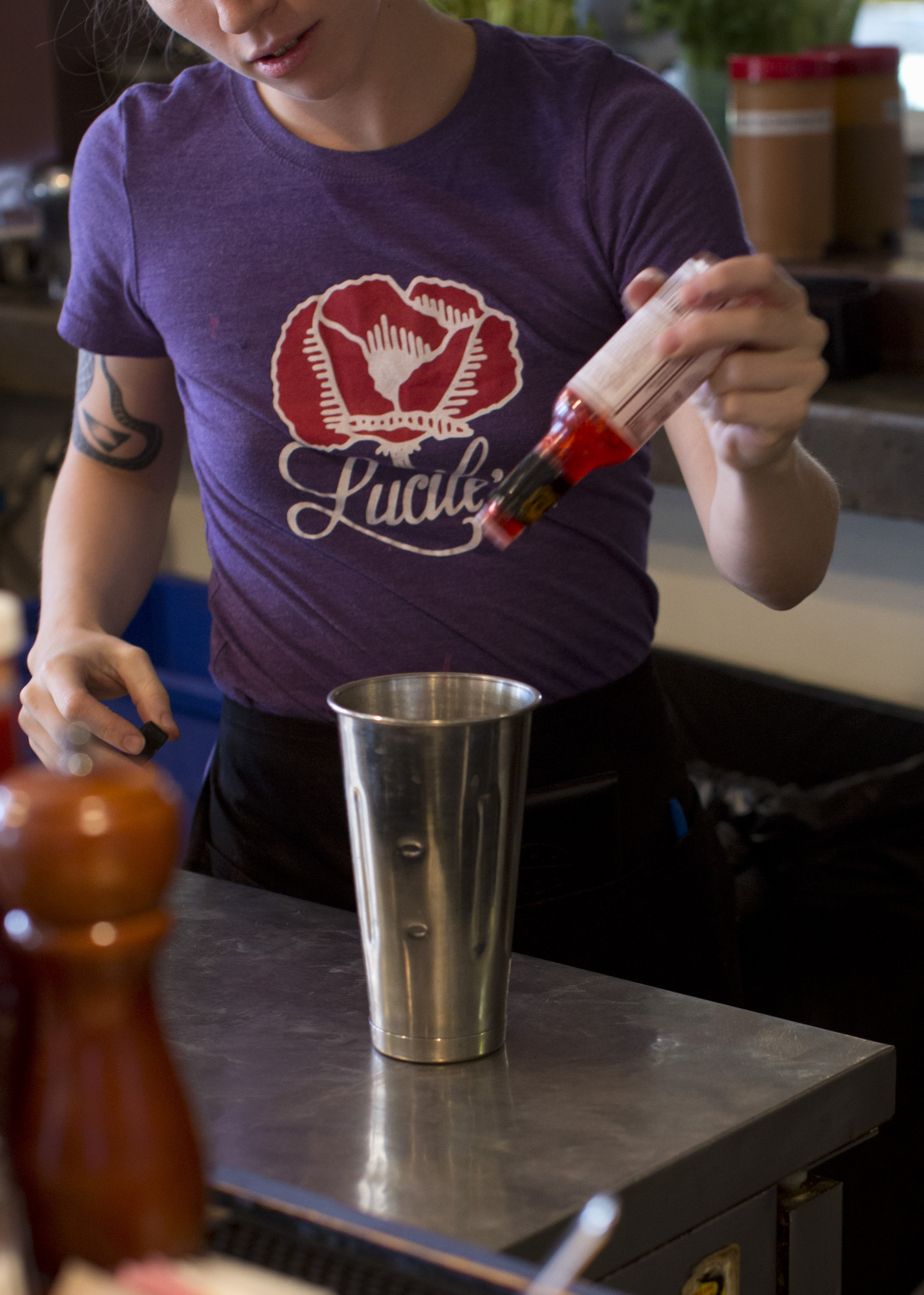 Walking inside, it’s not surprising to see Lucile’s in full swing on a weekend with a hungry and diverse crowd, proving that southern style gravy will unite us all. You are greeted with a friendly smile at the host stand which is aptly placed next to the bar, equipped with an espresso machine, hot chicory coffee and all the beautiful breakfast booze you can imagine including fresh-squeezed orange juice mimosas and the beloved Mardi Gras cocktail, the Sazerac. New Orleans-style jazz is represented not only in the energy of the music, but by vintage decor of horns and brass instruments precariously hung from the exposed brick walls. The smell of creole ingredients busting out of the from-scratch kitchen and loud-patterned cloth napkins washed in-house, just make it feel like the south.
