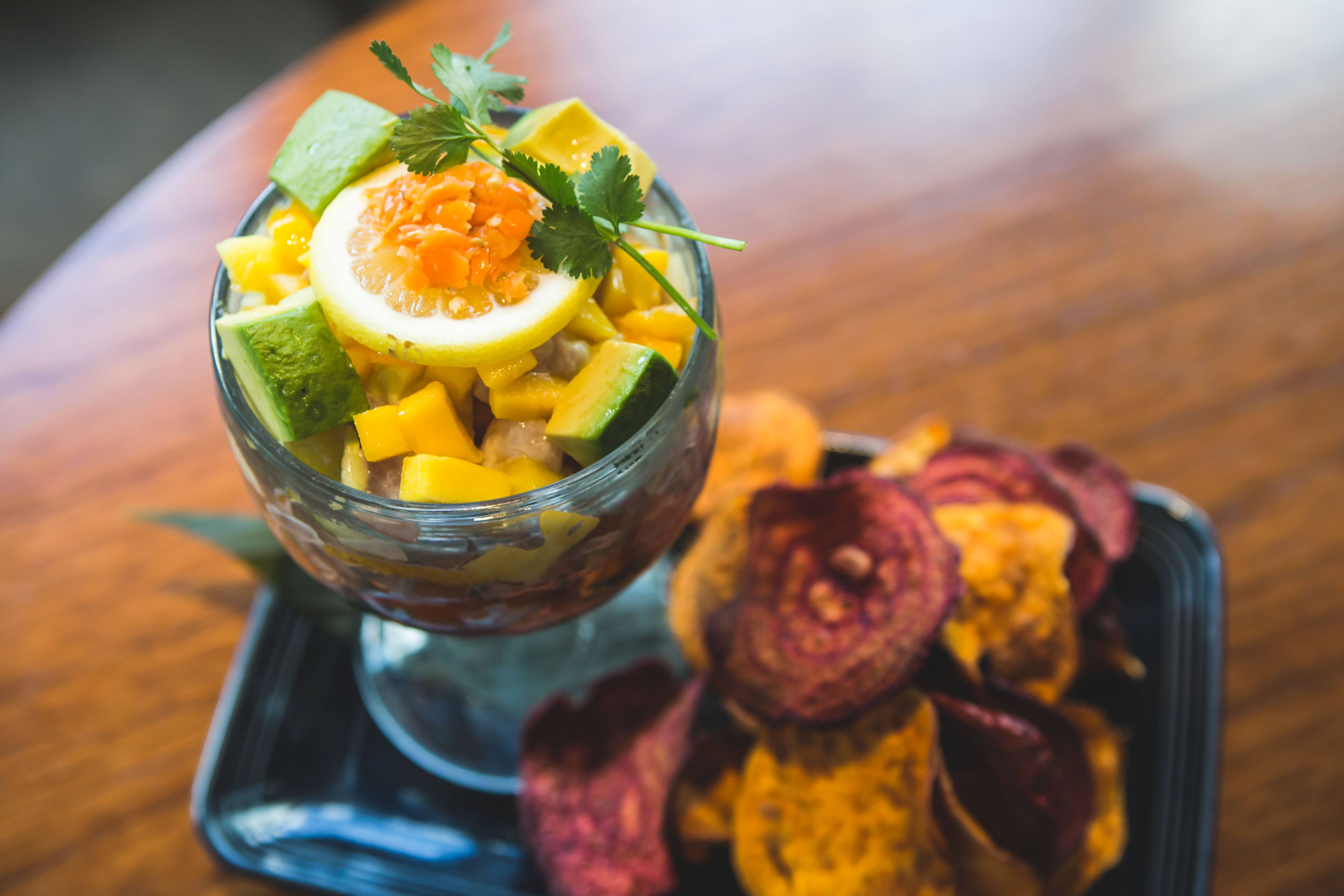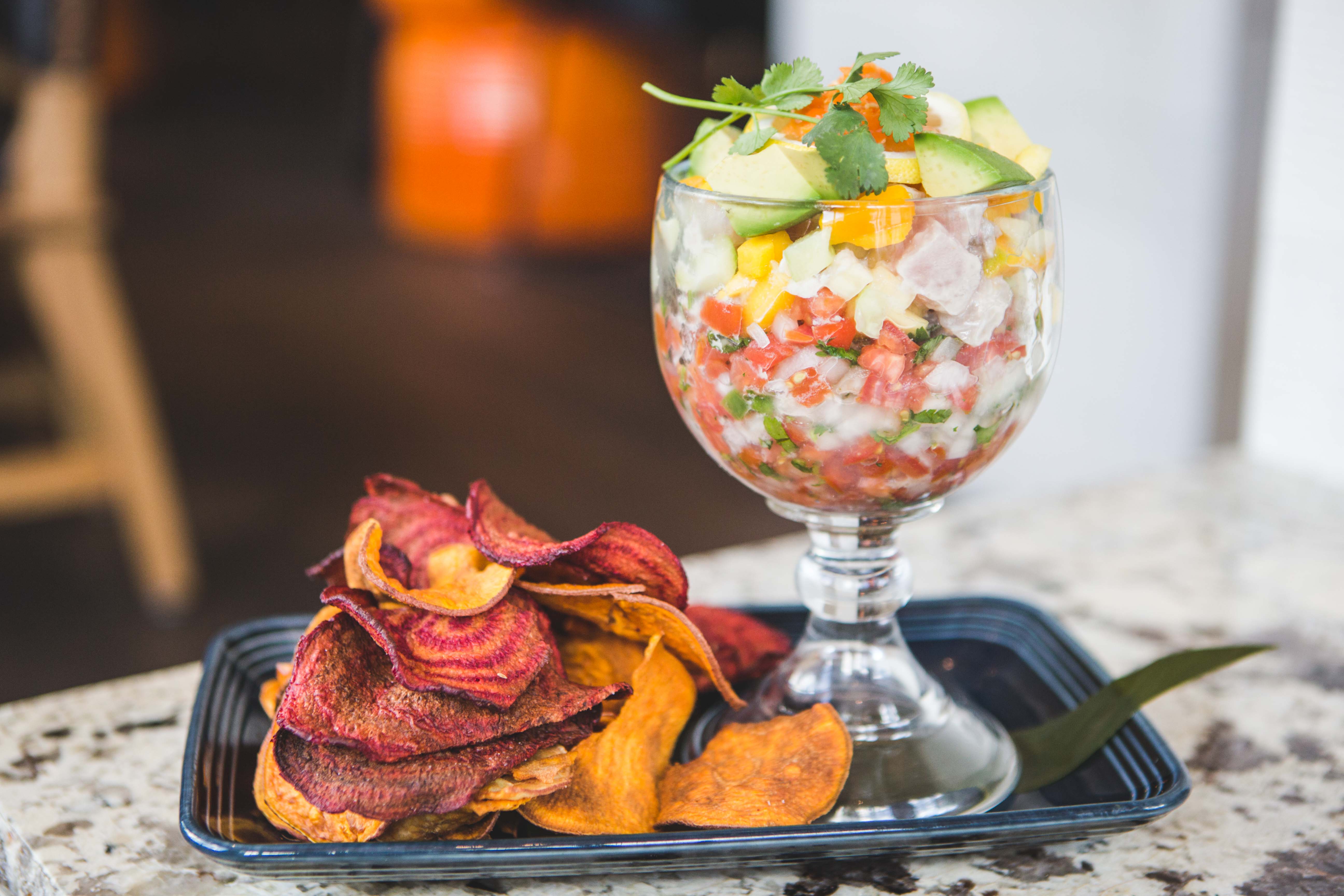 Ortiz brought out hot and raw tropical ceviche ($14.5o) as his choice for a shareable dish. It’s the perfect light and refreshing summer appetizer. A frosted goblet fit for King Arthur weighs heavy and comes overfilled with a mix of vibrant tropical fruit and sashimi grade albacore.