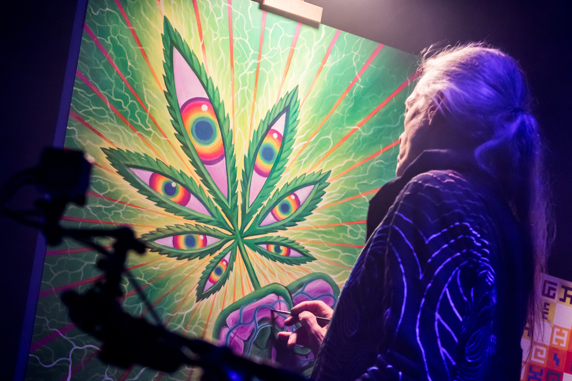 The music started around 6 p.m. with opening sets by Supersillyus and Desert Dwellers. As daytime faded and the crowd began to fill up the amphitheater, the music stayed consistent in keeping the energy flowing. The featured visual painters for the night were Alex and Allyson Grey, who are legends in the psychedelic community and two of the most prominent visionary artists in today’s modern culture. The canvas in which Alex worked on featured a pot leaf, designed in the beautifully intricate Alex Grey style that his fans have come to love. The pot-themed painting seemed appropriate for the Colorado event and there was definitely no shortage of attendees paying tribute to the sacrament.