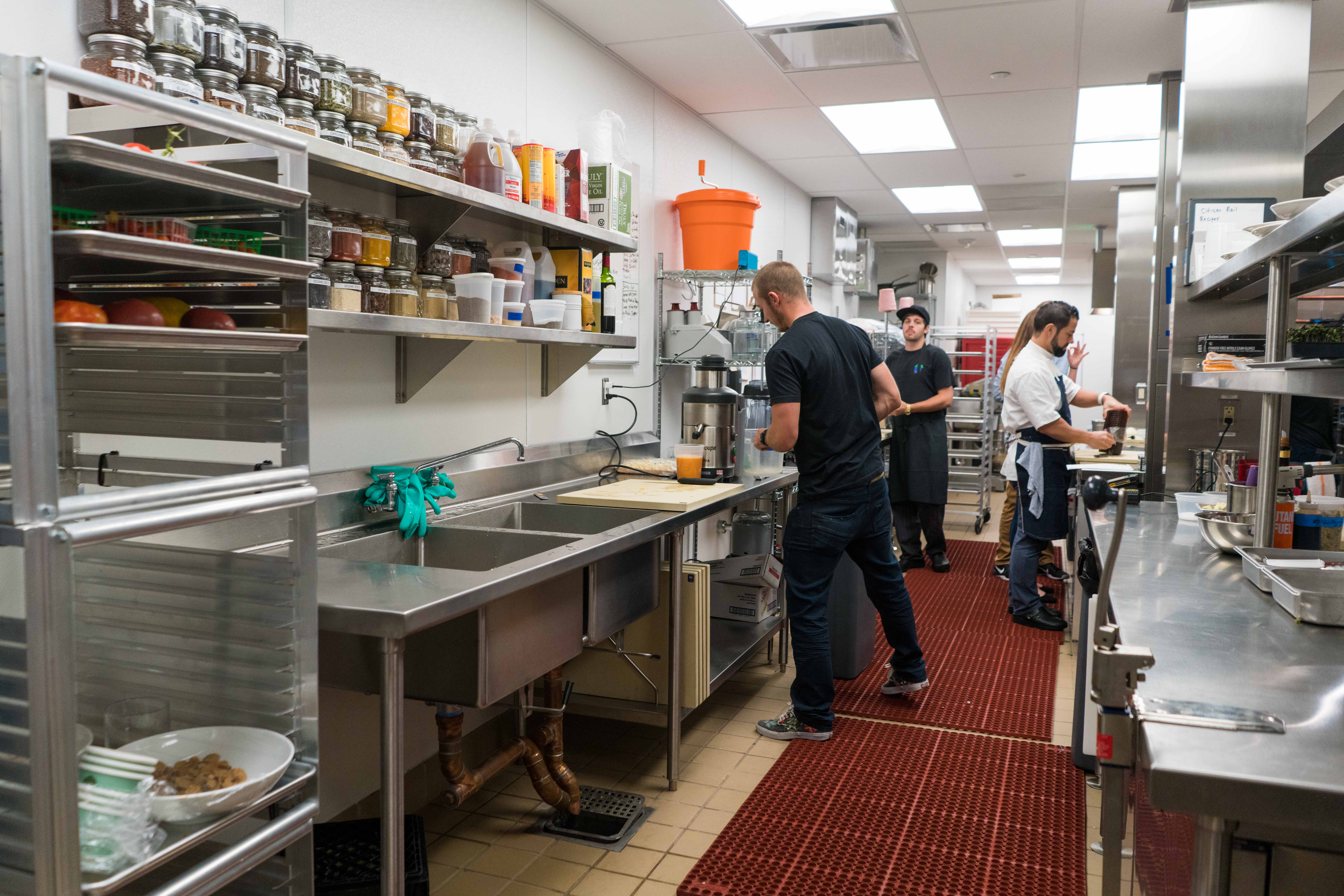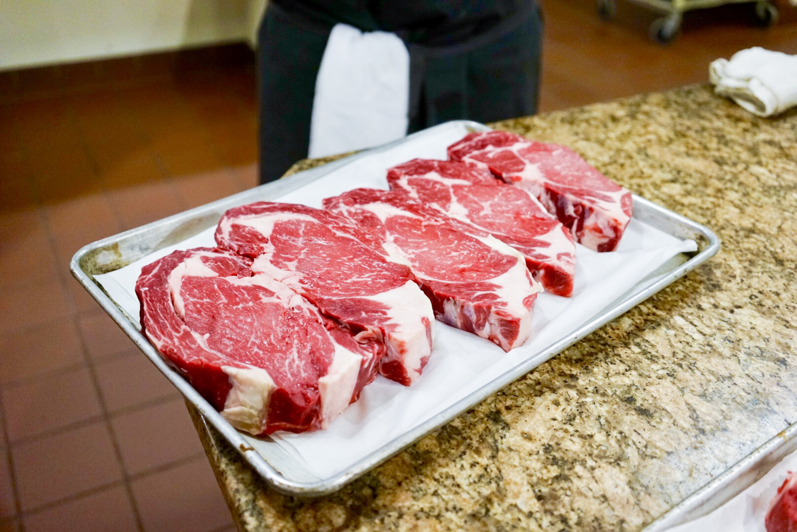 Next to the large custom kitchen, and within feet of the wood fire, is a walk-in cooler already filled with aged meats. The dry aged room is where a select amount of the restaurant’s locally sourced meats will sit and cure for around 28 days. For chef Graves, this is his “happy place,” because it’s where he’ll develop additional special projects — including aging items like short ribs. But the dry age room is only the beginning for the meat program at Citizen Rail. Behind the dry age room, in the far back corner of the kitchen, you’ll find an elevator. Press the button to take you up to the third floor and you’ll discover a whole second kitchen for Citizen Rail as well as Hotel Born. Inside the ancillary kitchen is where you’ll find Andrew Gonzales — Citizen Rail’s full-time butcher.