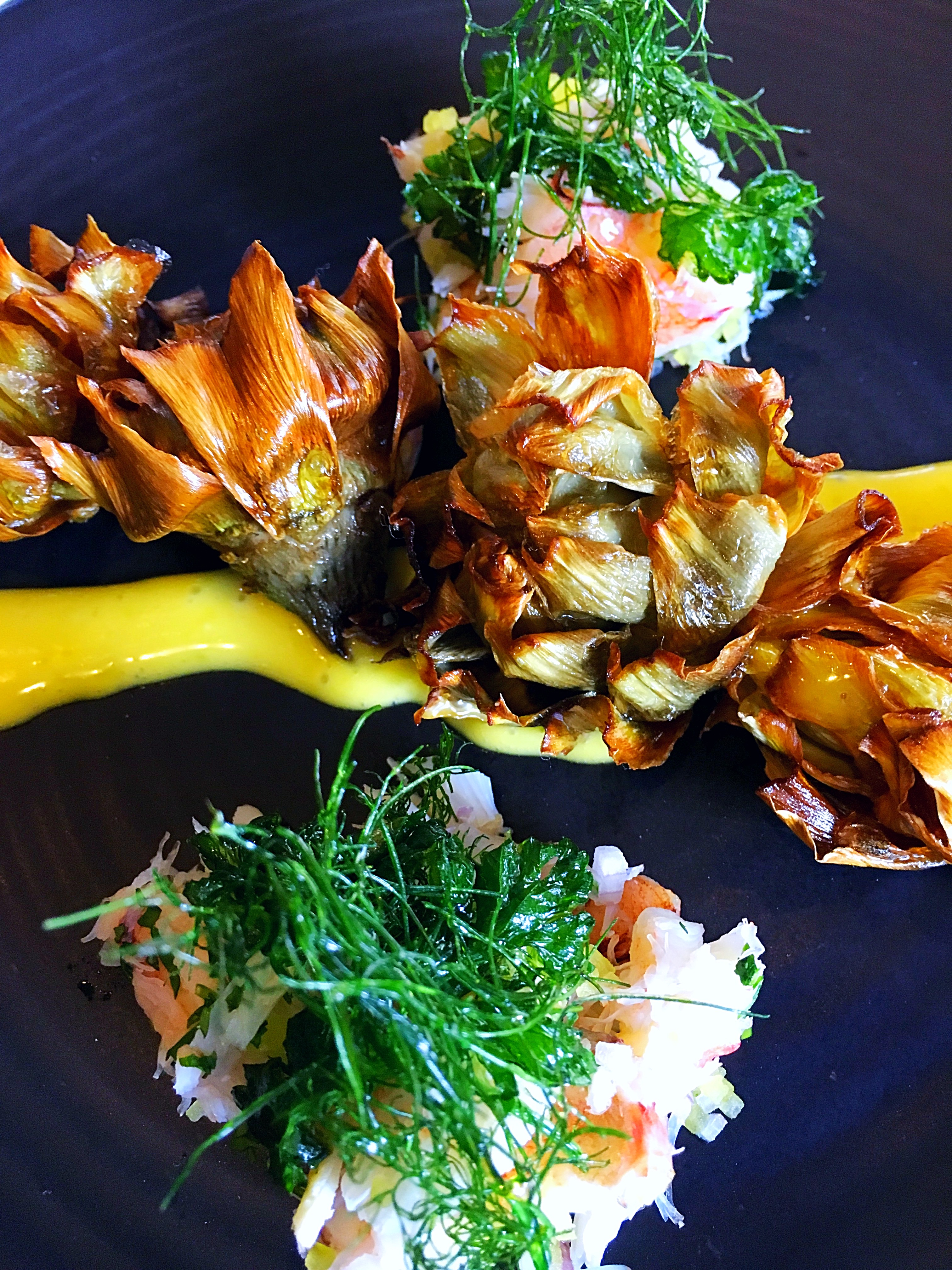 Despite Citizen Rail’s overt appreciation for all things meat, Graves believes it’s not necessary for someone to eat it every day. Rather, he explained through his careful sourcing he wants to show people how to “savor it more and eat it on occasion.” This statement may be perplexing when you see Citizen Rail’s behemoth portions like the 32-ounce Tomahawk steak (for two). But, if you veer away from the red meat section, you’ll find thoughtful vegetable dishes like the crispy artichokes with Dungeness crab, Persian cucumber salad or the vegetarian entree made of a chickpea cake with heirloom tomatoes, roasted corn and eggplant and blistered vegetables.