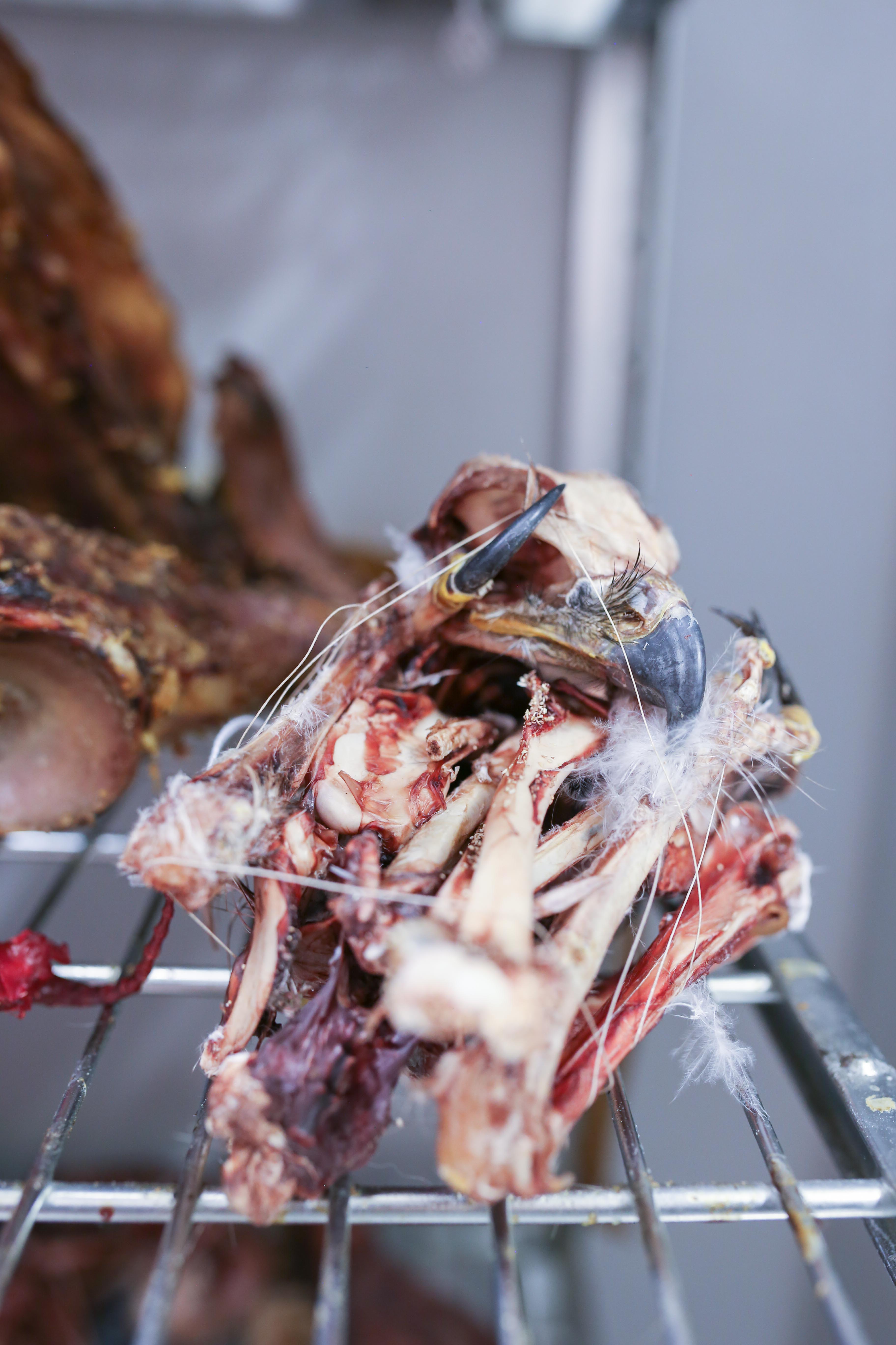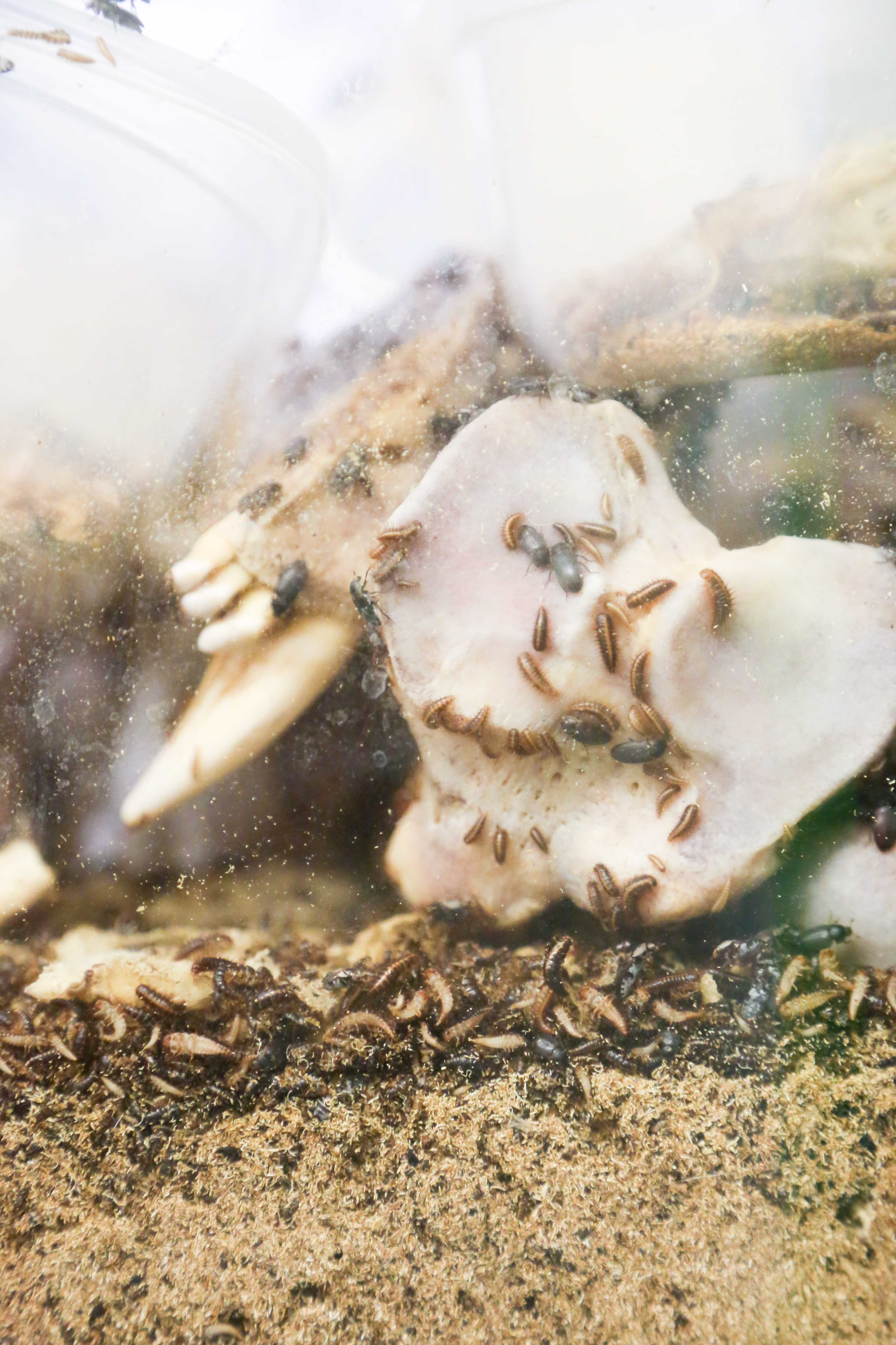 For the finale, each group of bones is tagged and placed in a dermestarium that houses a colony of dermestid beetles. The Zoo Prep Lab has a total of six beetle colonies working ’round the clock. Once the bones go in and the lid is sealed, that’s when the magic starts to happen. Larvae pick the rotting tissue off the bones at various rates — a skeletonization can take anywhere from a few days to four years. Some of these beetle colonies have been living in the same containers for over 40 years, devouring tissue remnants off skeletons, procreating, and dying — only to drop down to the bottom of the tank to make room for the next generation to grow, eat and thrive.