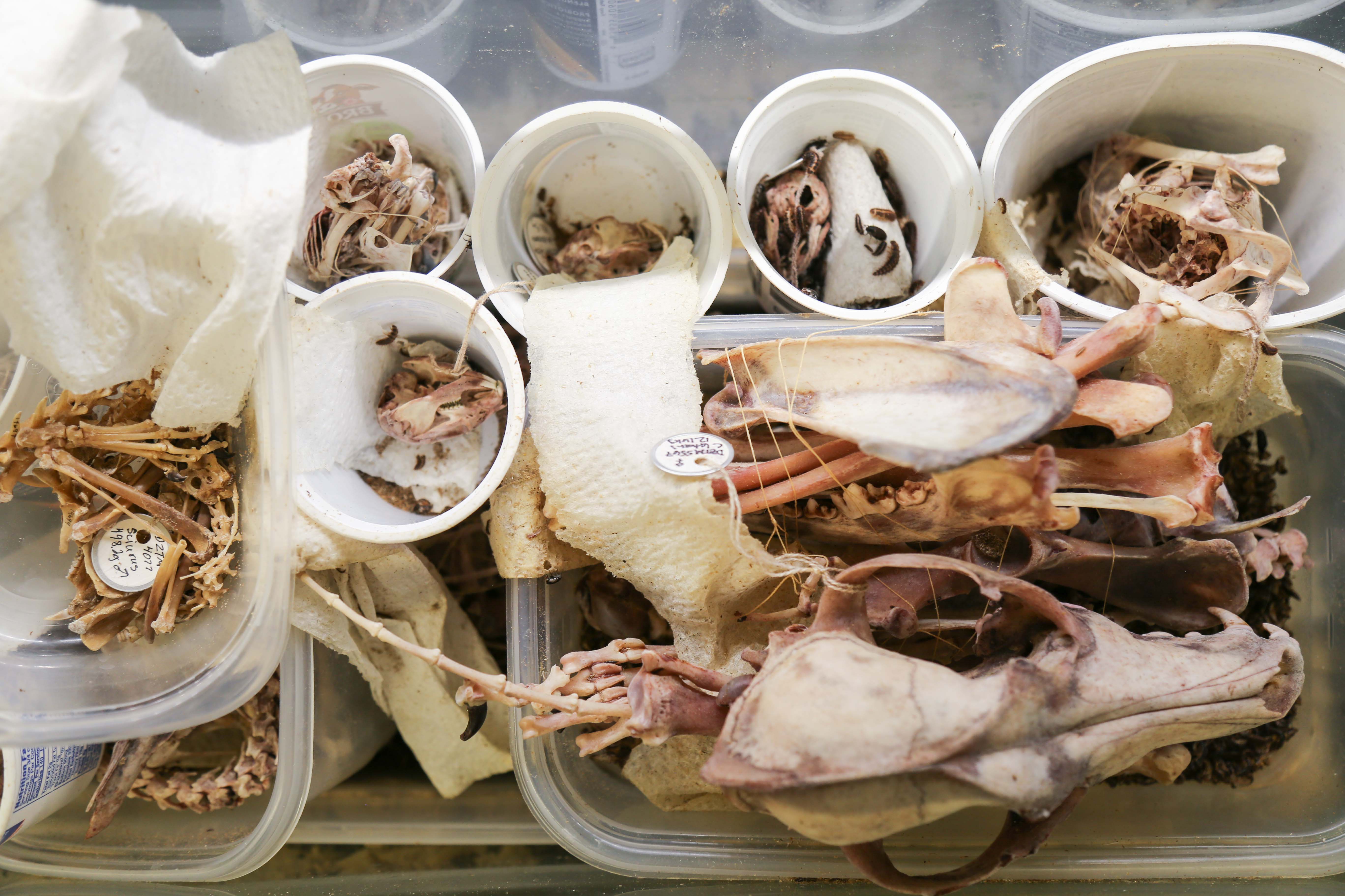 One of the greatest helpers of this decomposition process is the dermestid beetle, the larvae to be precise — housed in large, plastic bins called “dermestariums.” There’s nothing fancy about this process, Andy Doll, the zoology collections assistant, explained. It’s just nature taking its course, with a little help from human intervention now and again.