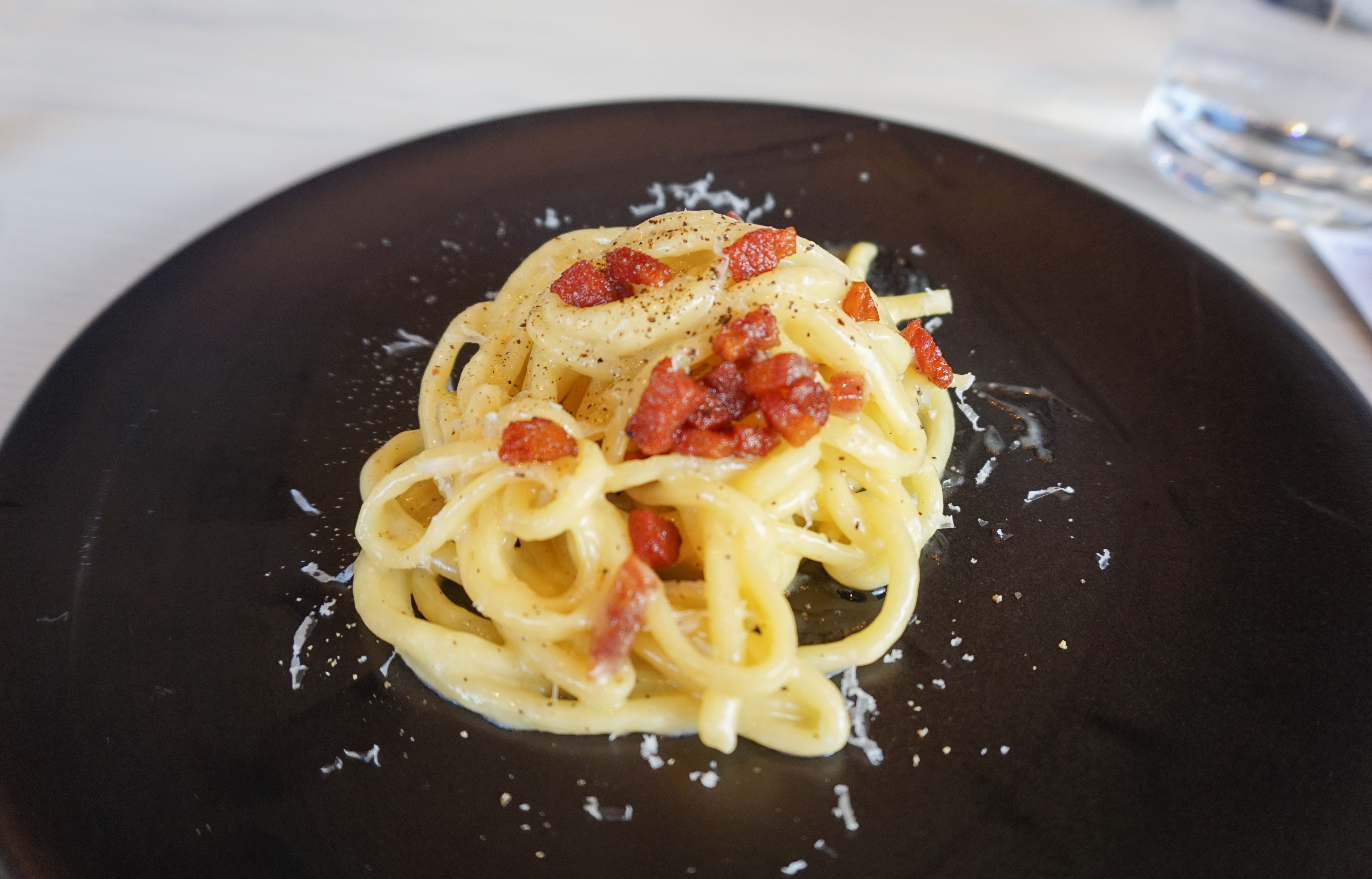 The portions are light, but the flavor is not lacking. We couldn’t get enough of the Guanciale Carbonara ($18) with perfectly cooked, house-made bucatini and the ember-cooked beets ($10) with fresh cheese, dill cream, smoked trout and toasted poppy seeds.