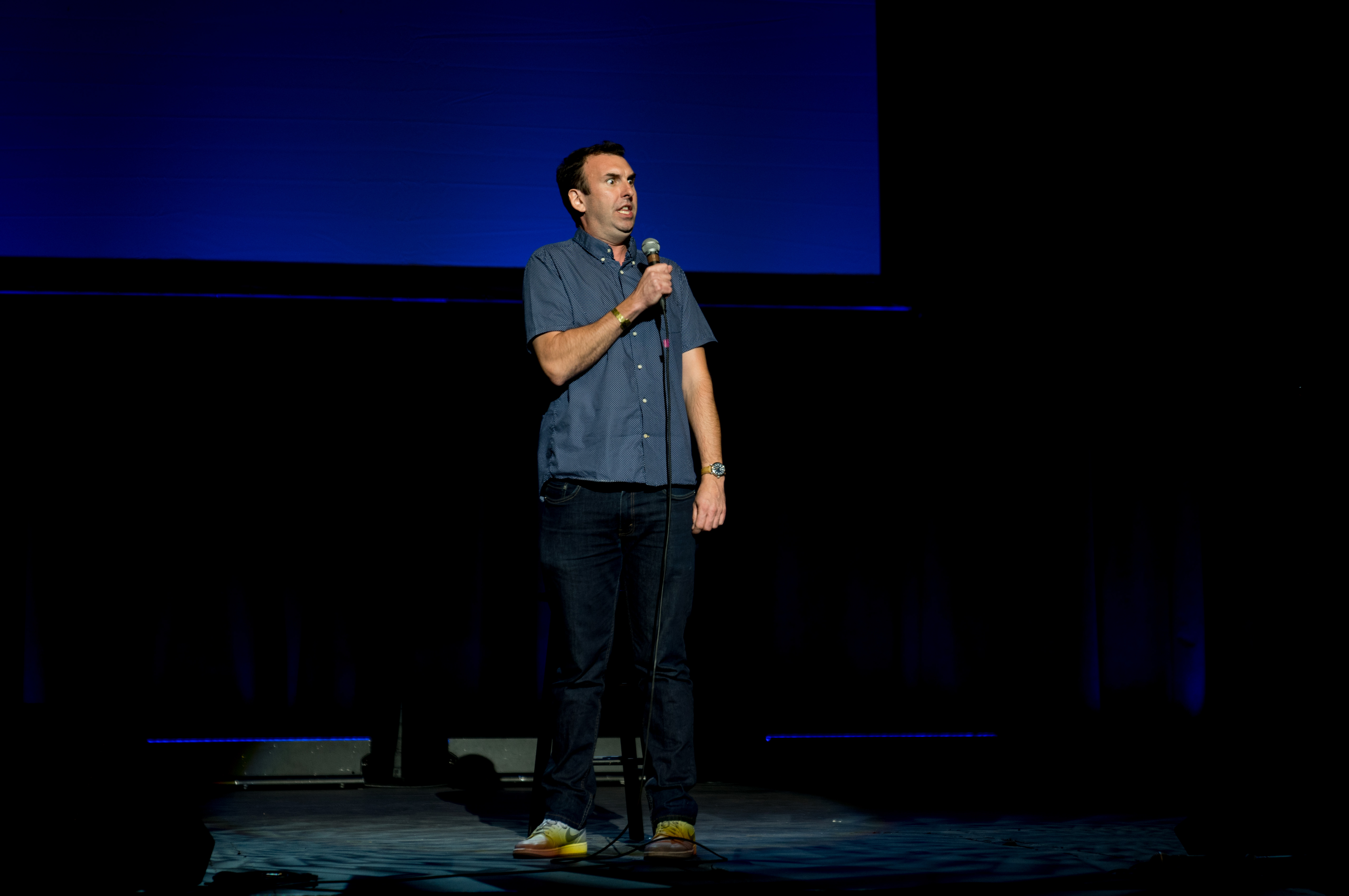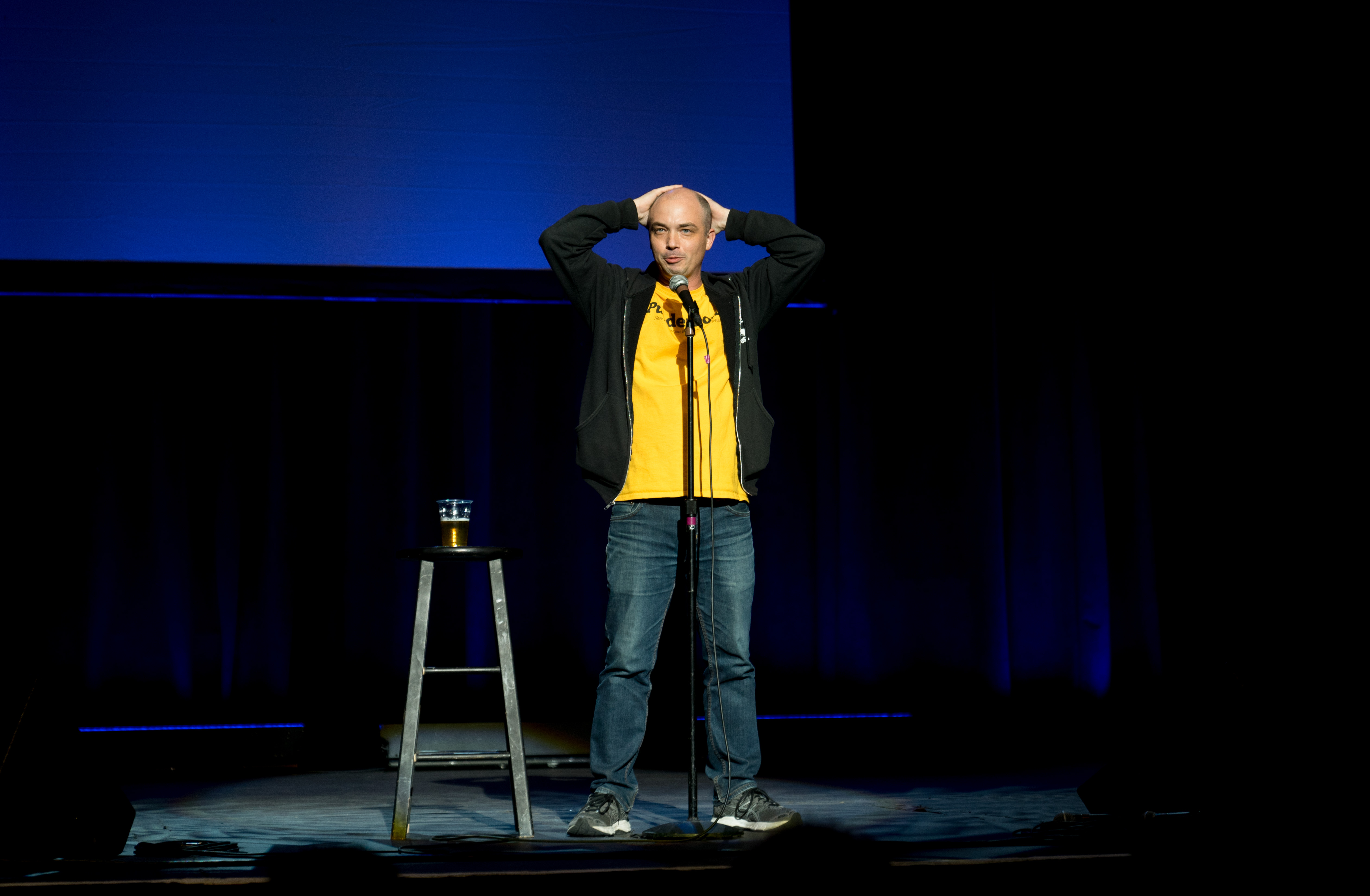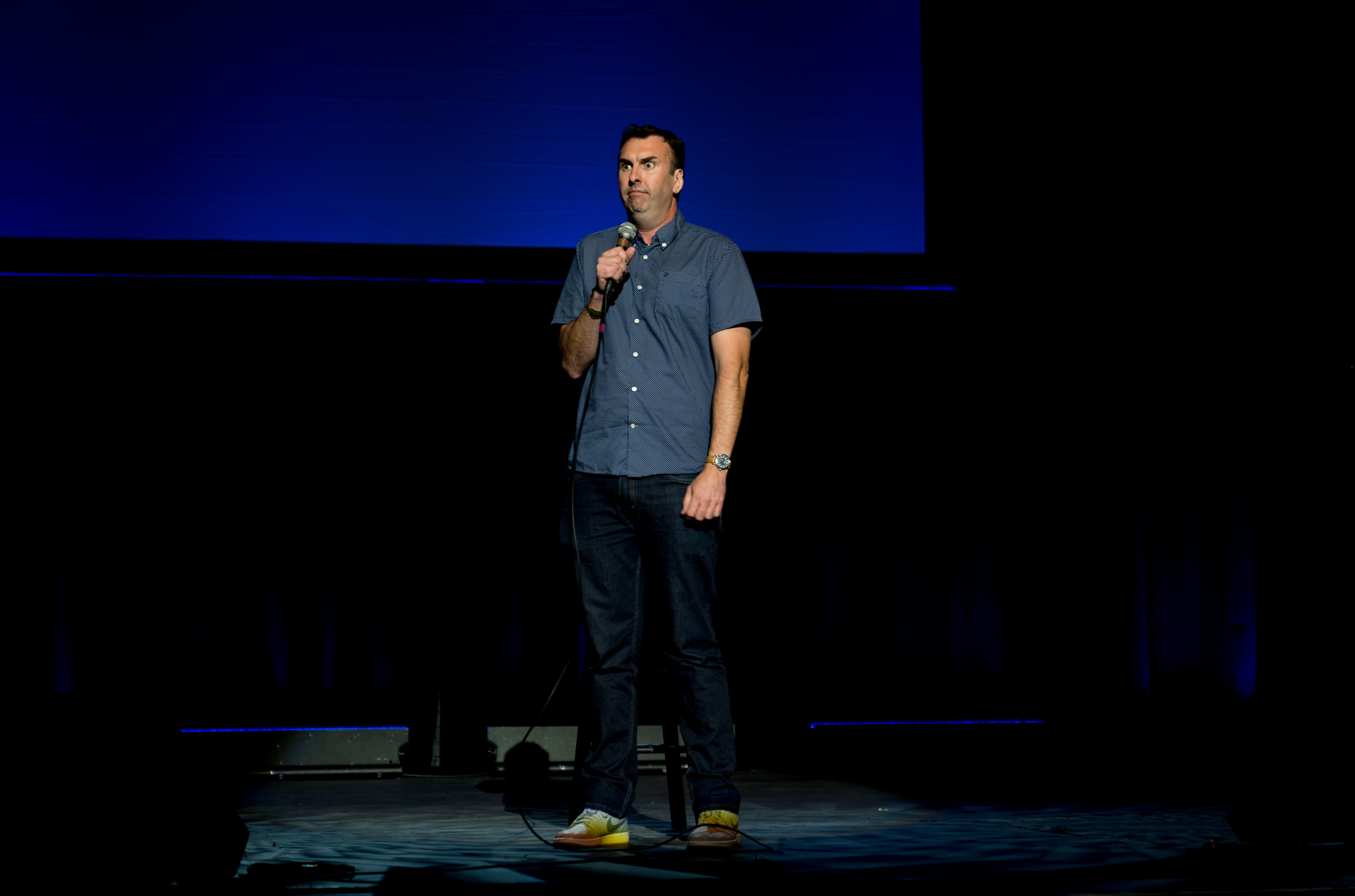 “I can’t tell if it’s more distracting if I use this hand,” he said in regards to the arm in a sling. Miller implied that a feud with his wife might have been the cause of the injury, but later the audience learned that it actually was a former infection gone wrong, and he’s still trying to navigate the medical terminology surrounding his wound. Miller, who grew up in Capitol Hill, made references to his former alma mater — East High School. He told a story about a senior prank he and his friends played that wasn’t funny and how he used to make up fake announcements as “Head Boy” before he was disbarred. Miller was as expected — a little crazy with a lot of movement around the stage. From tangling himself up in his own mic to jumping off the stage to kiss the head of a man in the front row, Miller was uncensored and pumped to riff about how much he loves Denver and how much he hates Texans. At one point, he seriously hissed at the audience, which he said his wife told him not to do. Miller even invited Governor John Hickenlooper’s son Teddy onstage to publicly thank his father in the audience and prank call one of his (Teddy’s) friends.