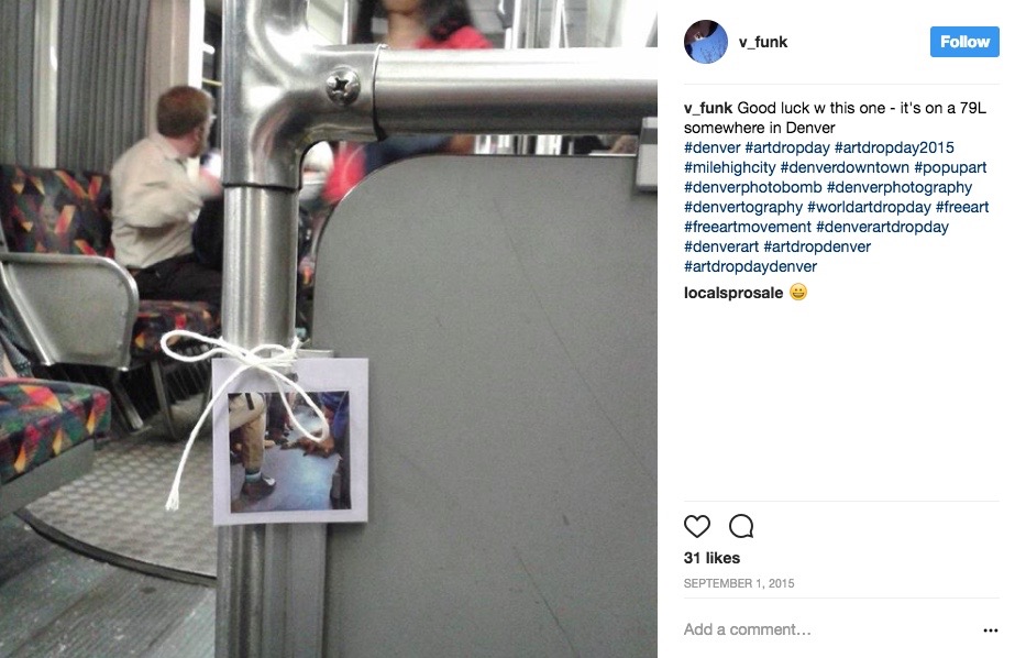 Participation as an artist is simple and free (minus the cost of your own materials.) Artists must register online —through this form —before September 5. Once registered, start making a piece of art to hide in town. Download, print and attach the World Art Drop Day Info Sheet to the artwork. On September 5 — and not before — drop the art somewhere in Denver. Take a photo of the art, or the hiding spot, or a little of both and post the image to social media channels. On that post, use the tags #artdropday and #artdropdenver, as well as some clues or hints to guide participants to your hiding spot. Then, wait around to see which stranger comes, or move on and leave it as a mystery.