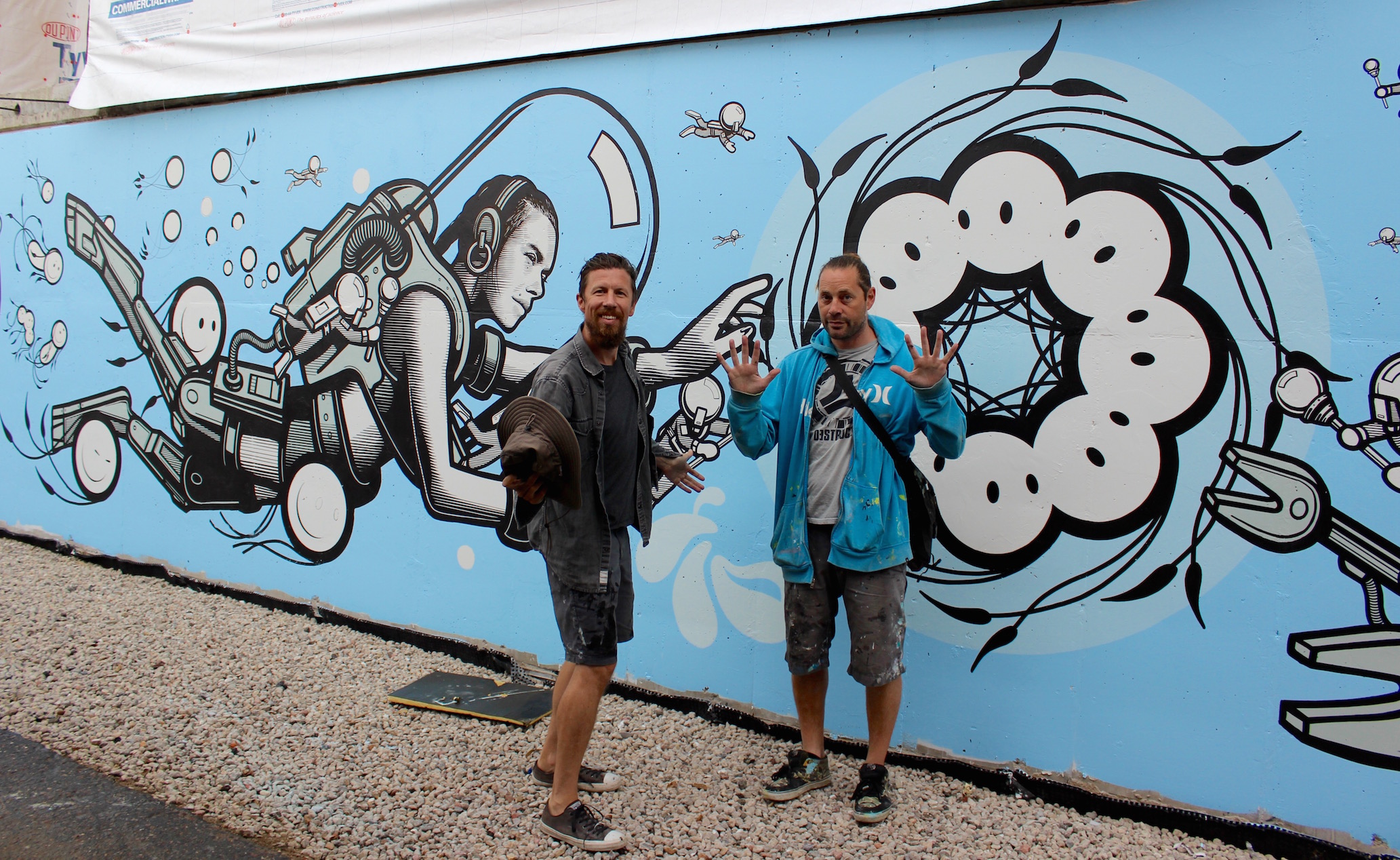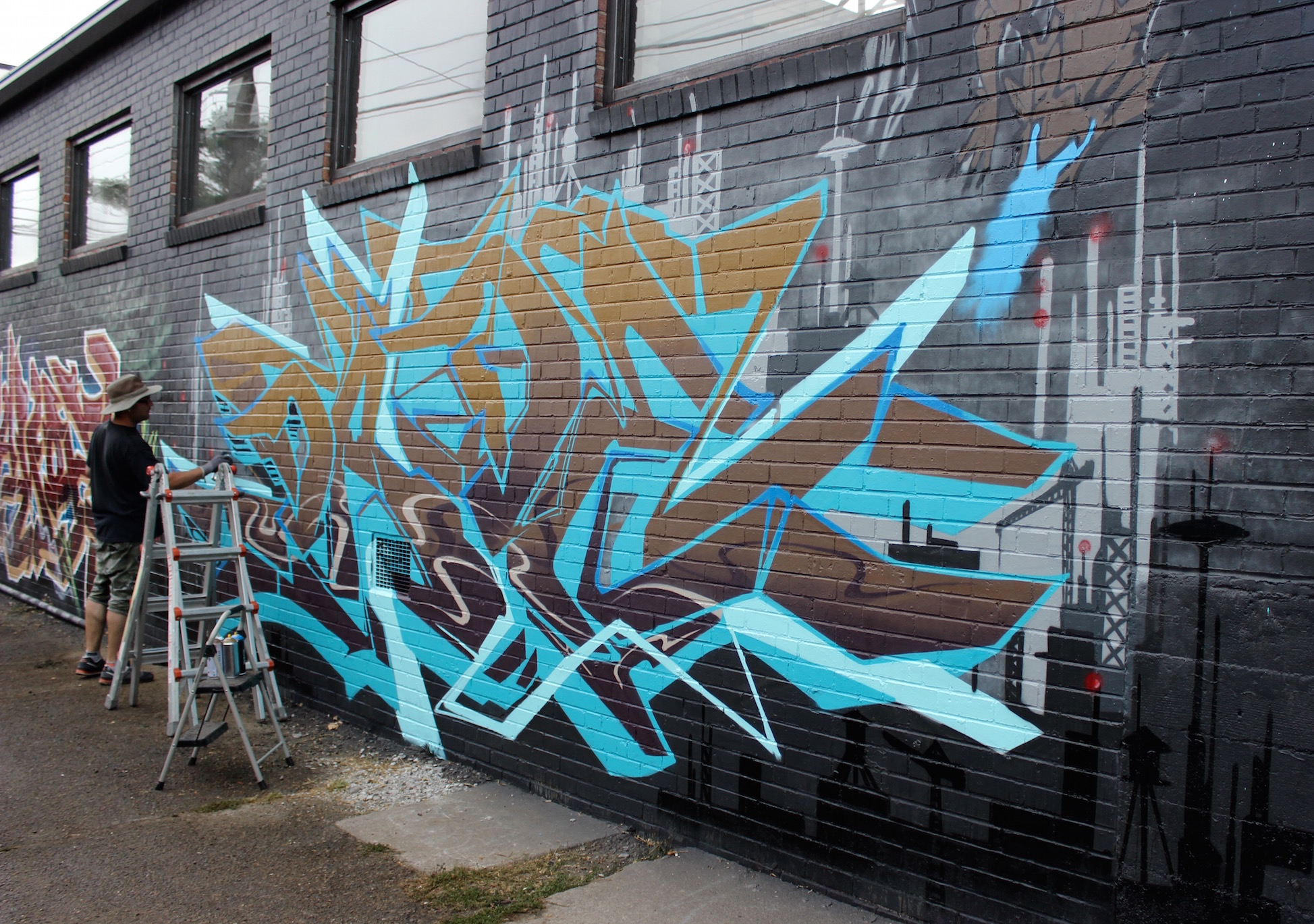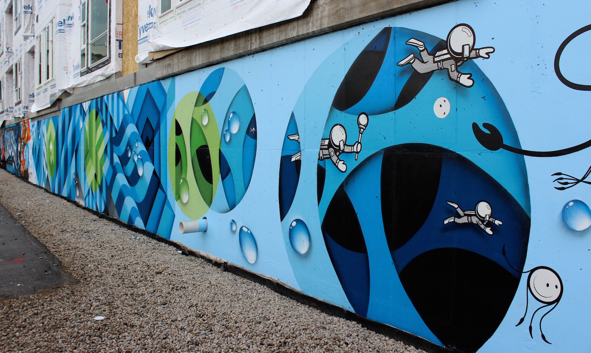 inkie, Mr. June and The London Police – This group took hold of the alleyway behind Stem Ciders this past week, working together at the edges of each of their individual pieces to fluidly make transitions. The London Police added swimming figures to part of Mr. June’s (don’t miss the smallest one!) Mr. June and inkie molded their styles from geometric to underwater. When we caught them on the last day, they were playing music, taking smoke breaks and joking with each other while finishing their pieces. inkie said, “This is one of the best festivals I’ve ever been to. It’s my first time this year, but yeah, I’ll be back.”