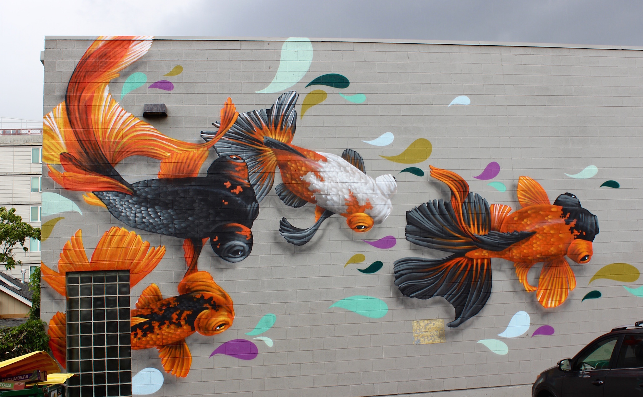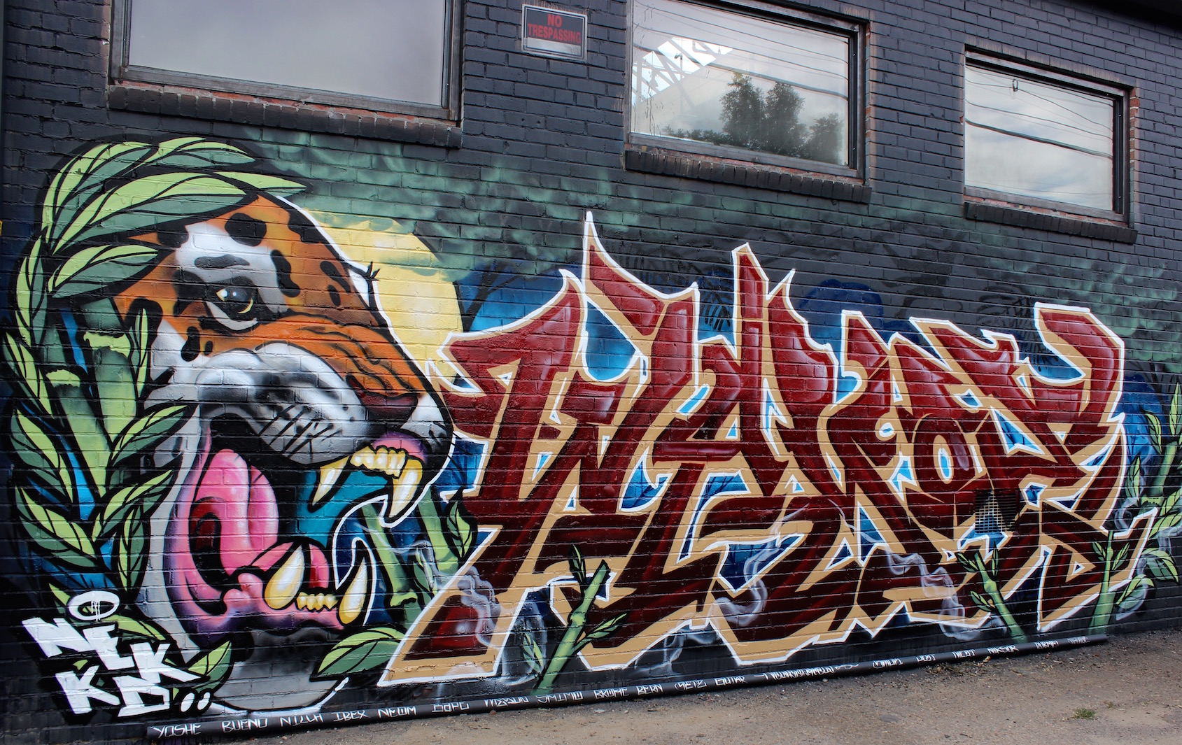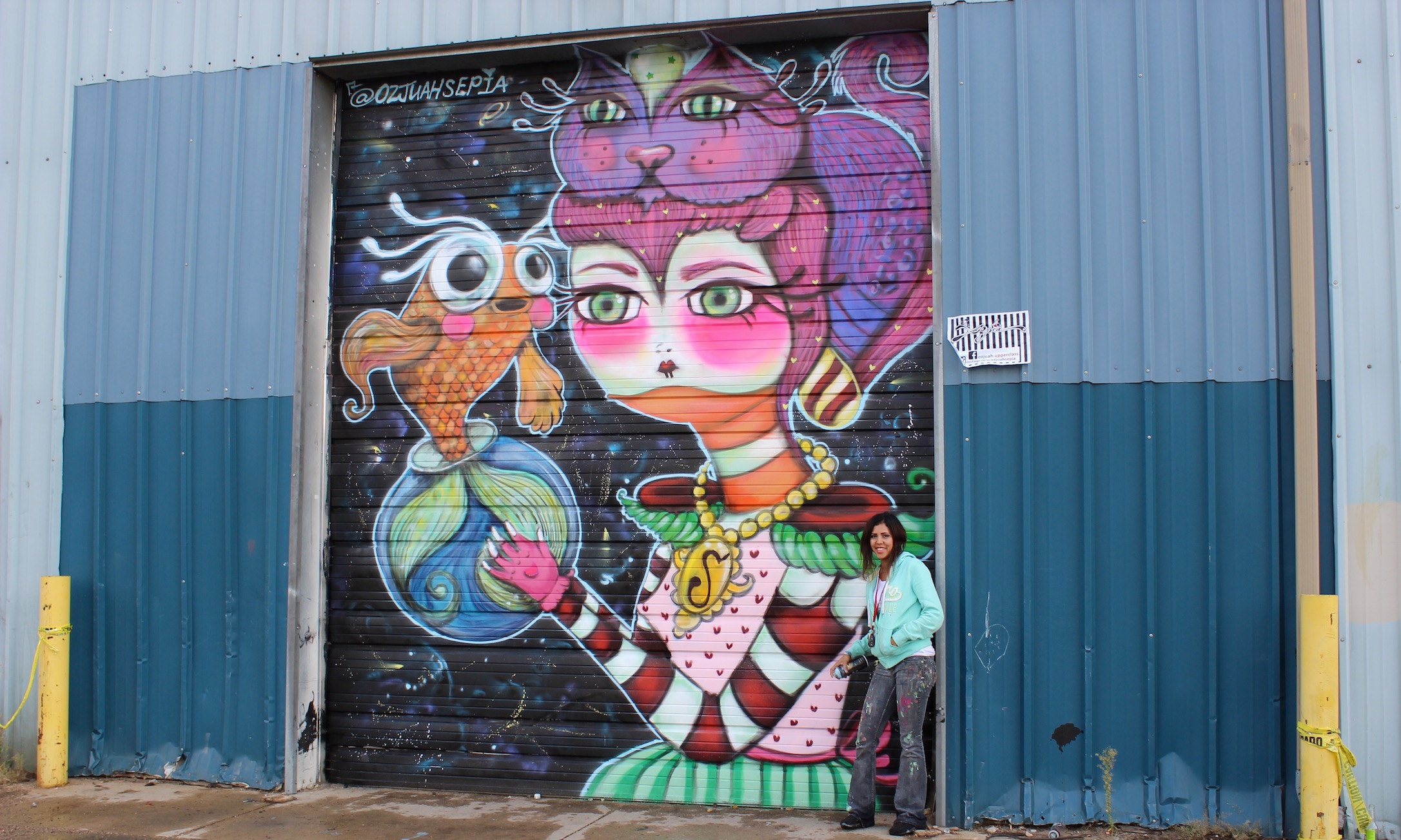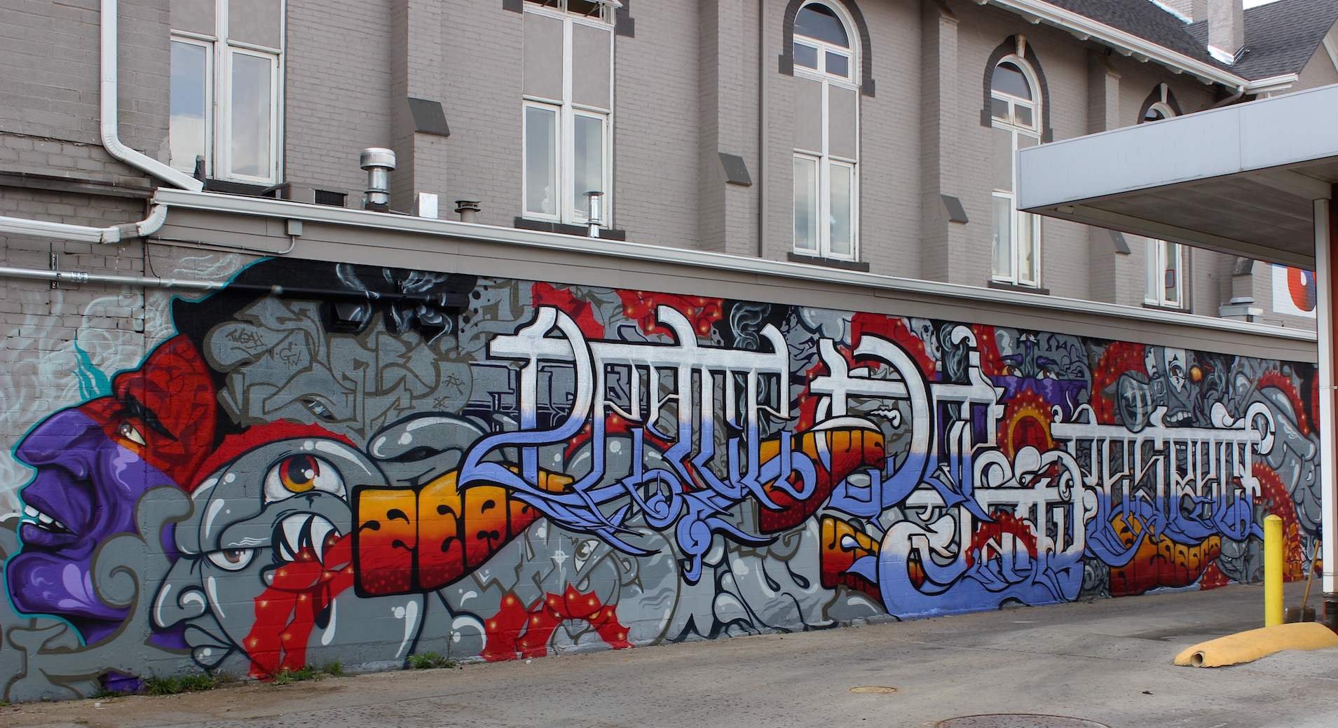 inkie, Mr. June and The London Police – This group took hold of the alleyway behind Stem Ciders this past week, working together at the edges of each of their individual pieces to fluidly make transitions. The London Police added swimming figures to part of Mr. June’s (don’t miss the smallest one!) Mr. June and inkie molded their styles from geometric to underwater. When we caught them on the last day, they were playing music, taking smoke breaks and joking with each other while finishing their pieces. inkie said, “This is one of the best festivals I’ve ever been to. It’s my first time this year, but yeah, I’ll be back.”