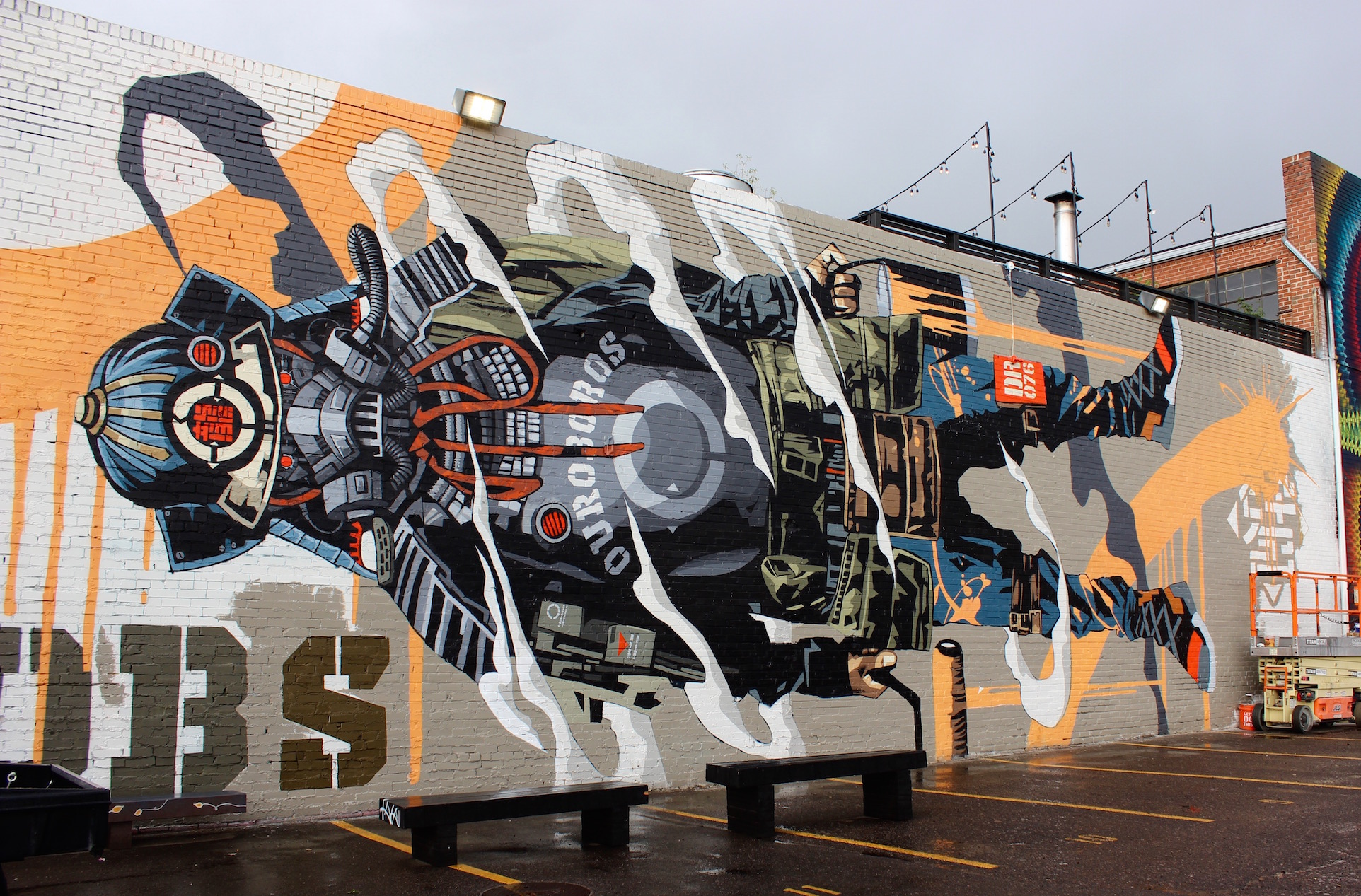 Blaine Fontana – Traveling from Portland, Fontana is not new to the Denver street art scene. He’s responsible for the iconic patio at Ratio Beerworks. But this piece for CRUSH is different in the best ways, using his skills to produce a very realistic image that tricks the eye instead of a collage-piece.