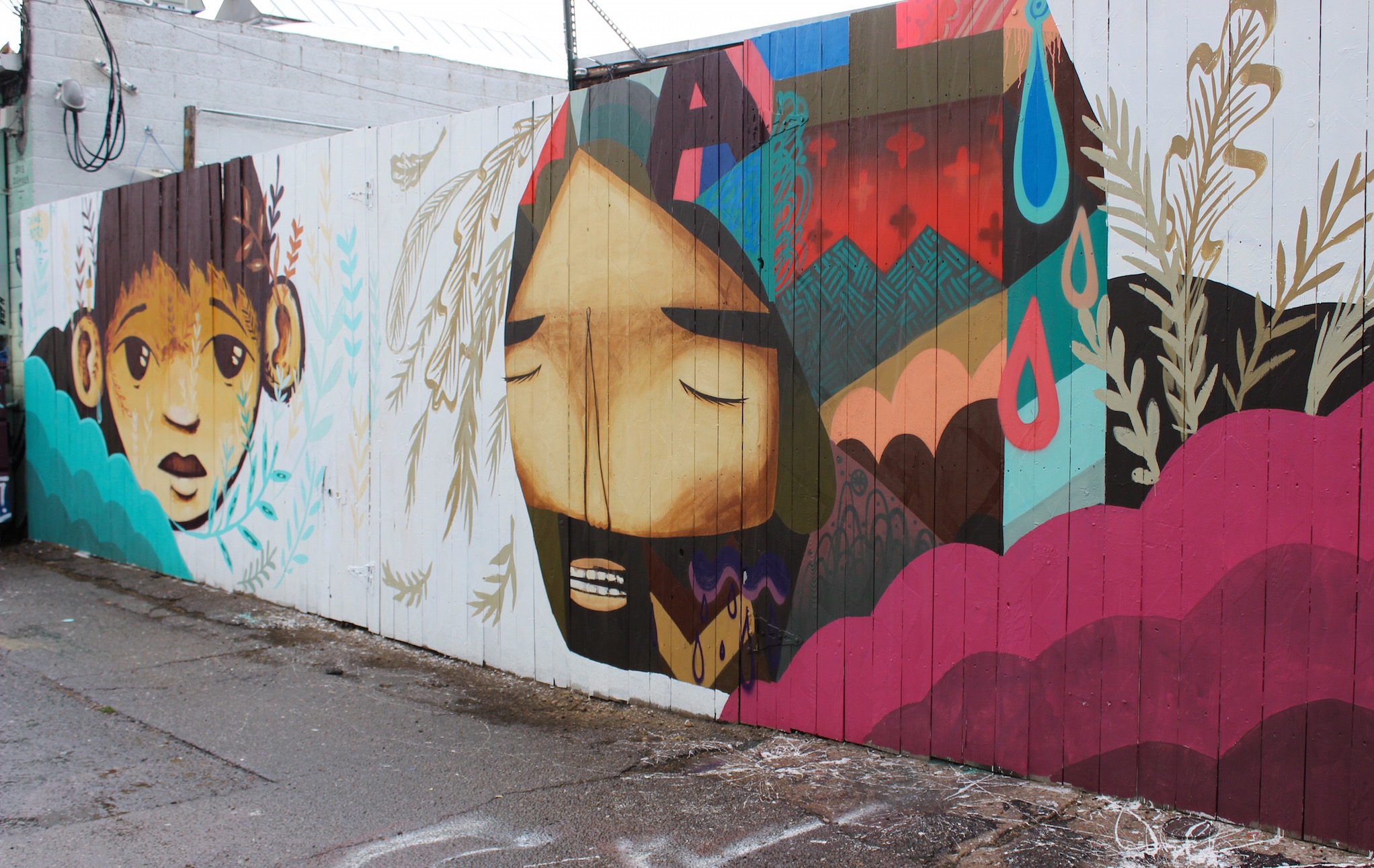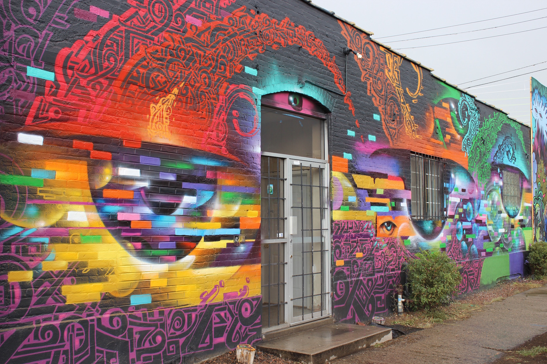 Because of its location a few blocks away from the heart of CRUSH activity, RedLine may not have received as much foot traffic. But it was well worth it. The massive wall on the east side of the art collective and gallery was taken over by three artists with a flare for color. Thomas Evans (aka Detour303), now with a studio in RedLine, helped with organization and implementation on this wall all week, though he was also painting his own pieces in other areas of RiNo. All three artists painted larger-than-life images that will take your breath away when you see them in person.