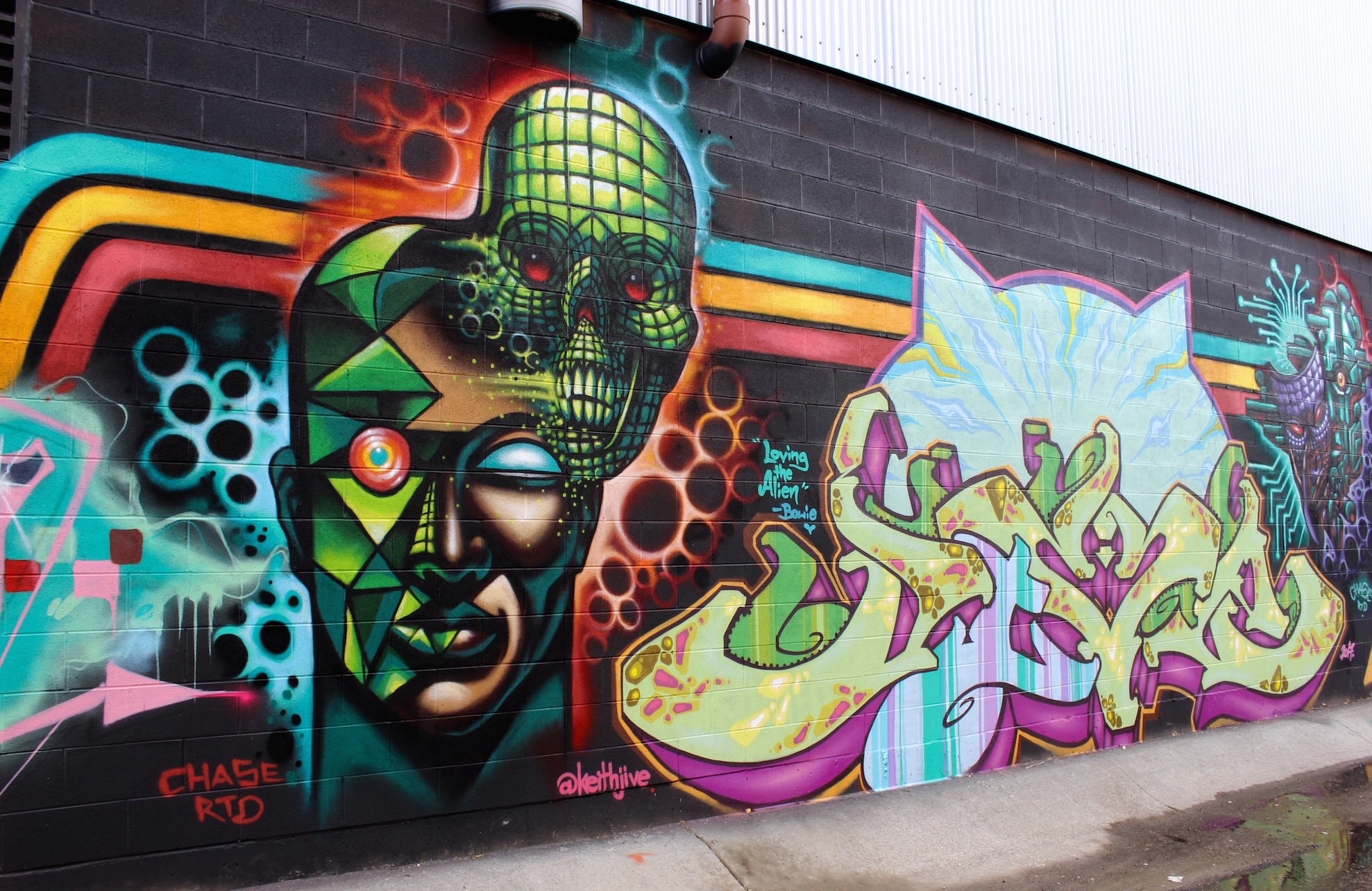 illson – Another Denver-based artist, who has been gaining more ground with more murals, especially in RiNo. First Draft, the garage doors across from the main CRUSH parking lot, and an alleyway between Walnut and Blake by 40th are some of the ones you might want to visit, if you aren’t familiar. This one is more abstract than his other pieces (that usually focus on some kind of portraiture) and shows off his ability to create 2D illusions that appear to be popping out of the wall.