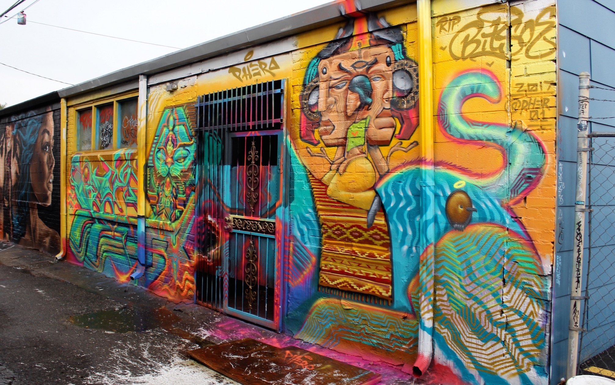 Vyal and Breeze1 – These two veterans have known each other for a long time — Vyal stationed in L.A and Breeze1 in Phoenix — and their collaboration is flawless. Not coincidentally, both also organize and operate their own street art/graffiti festivals in their home towns. Vyal’s is The Container Yard and Breeze1 is working on Paint Phoenix.