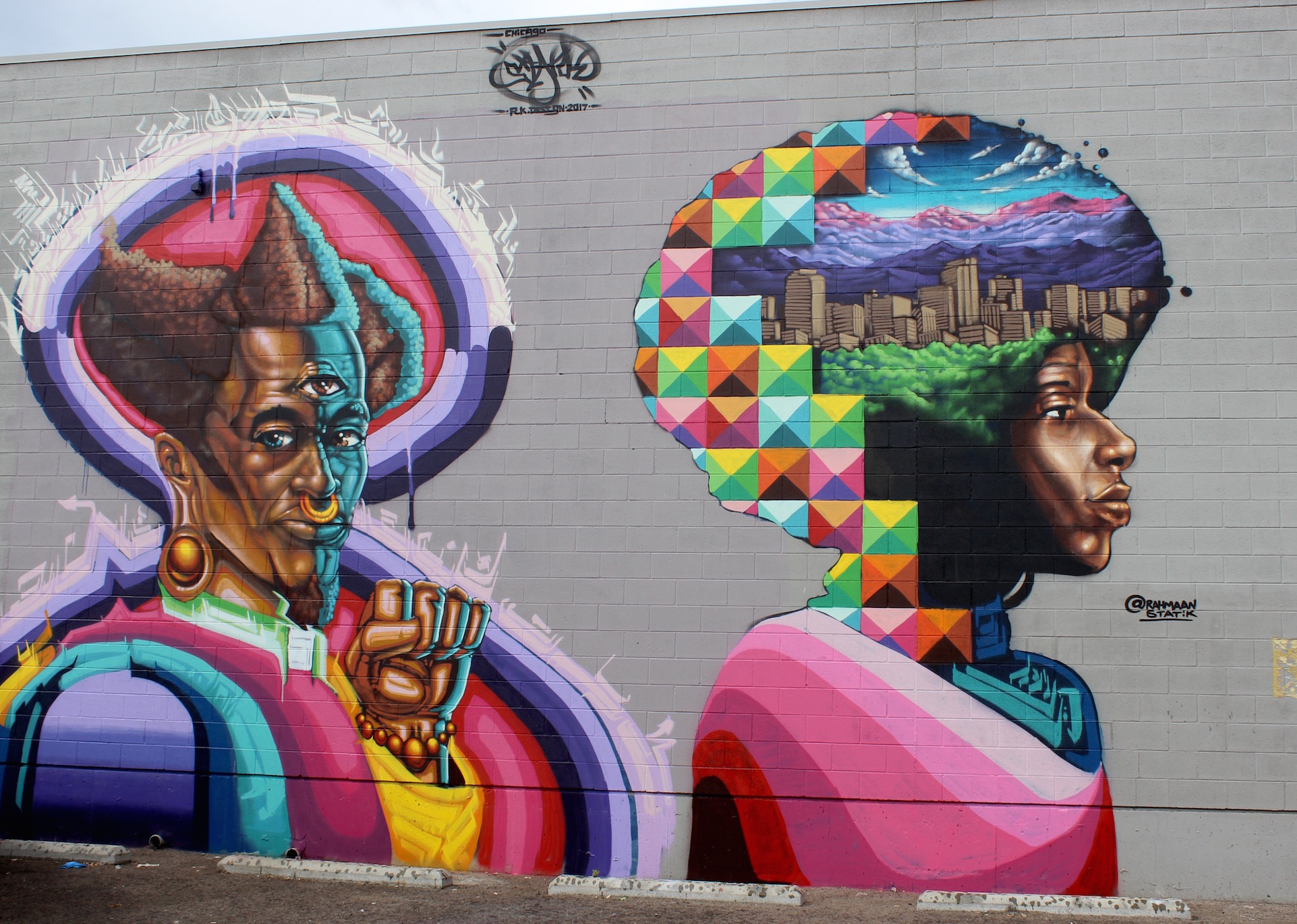 Rahmaan Statik – From Chicago, Statik produced two enormous figures with distinct and realistic faces that each tell their own story. The detail around the faces is fascinating as well, with messages about intuition, tolerance, diversity and nature.