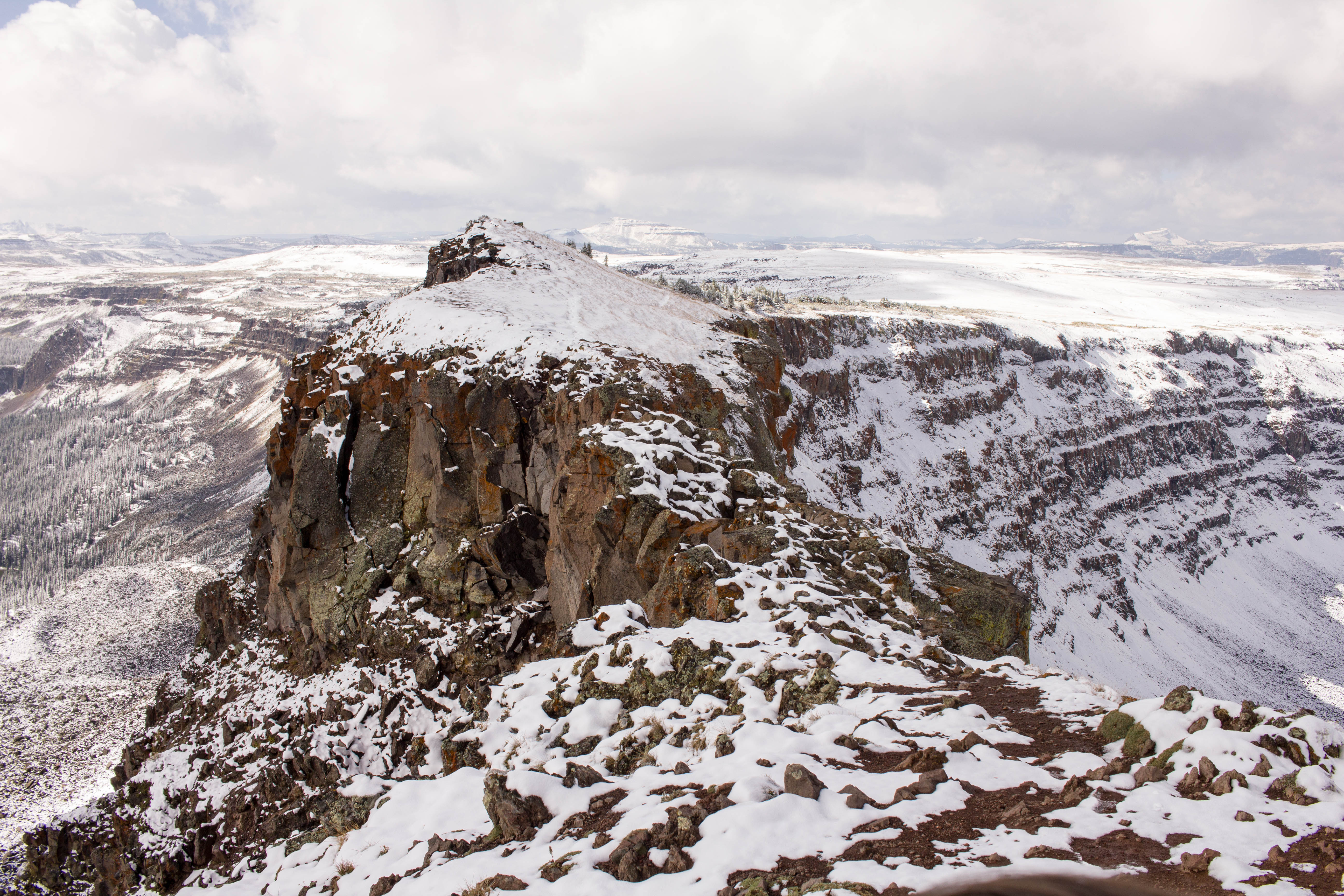 Reaching the ridgeline, you will be greeted by a wide-open view of the Flat Tops Wilderness and a wooden sign. The signs points hikers right to continue along East Fork Trail, but Devil’s Causeway will be to your left. Someone must have taken exception to this sign, and carved an arrow with “Devil’s Causeway” pointing toward the land bridge. This will be the only point in the hike to the Causeway that you do not follow East Fork Trail 1119. Follow the make-shift arrow to the left. Taking a left at the final sign, you will climb a short but very steep section leading to Devil’s Causeway. At the time of our hike, we were welcomed by shin-deep snow, time-traveling us into winter. This last steep has several stairs built to help you reach the top, but be aware of mountain weather conditions and plan accordingly.