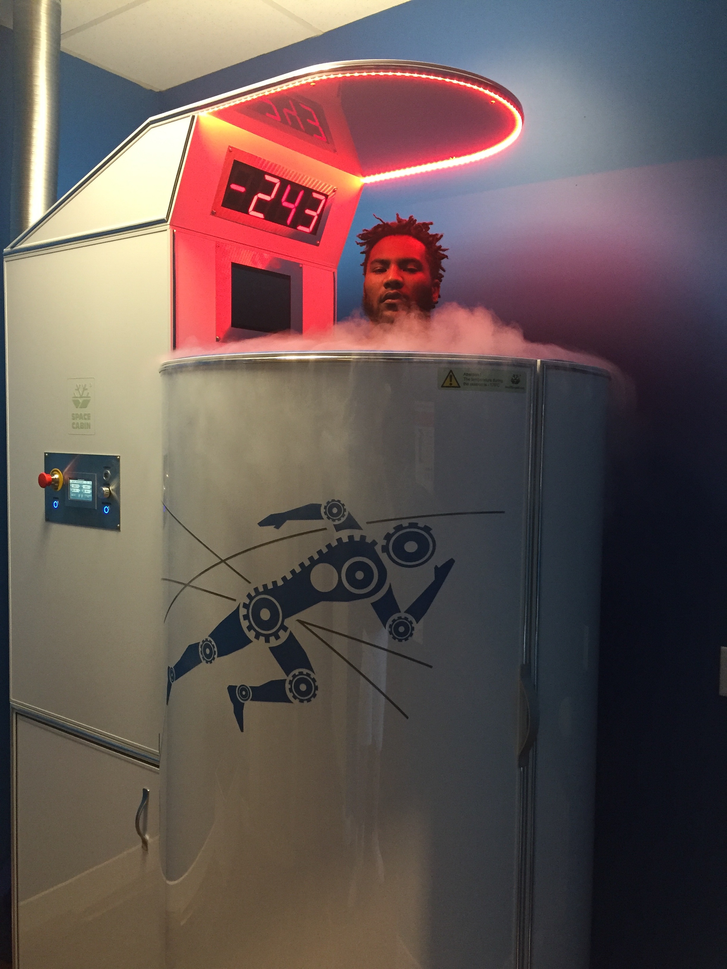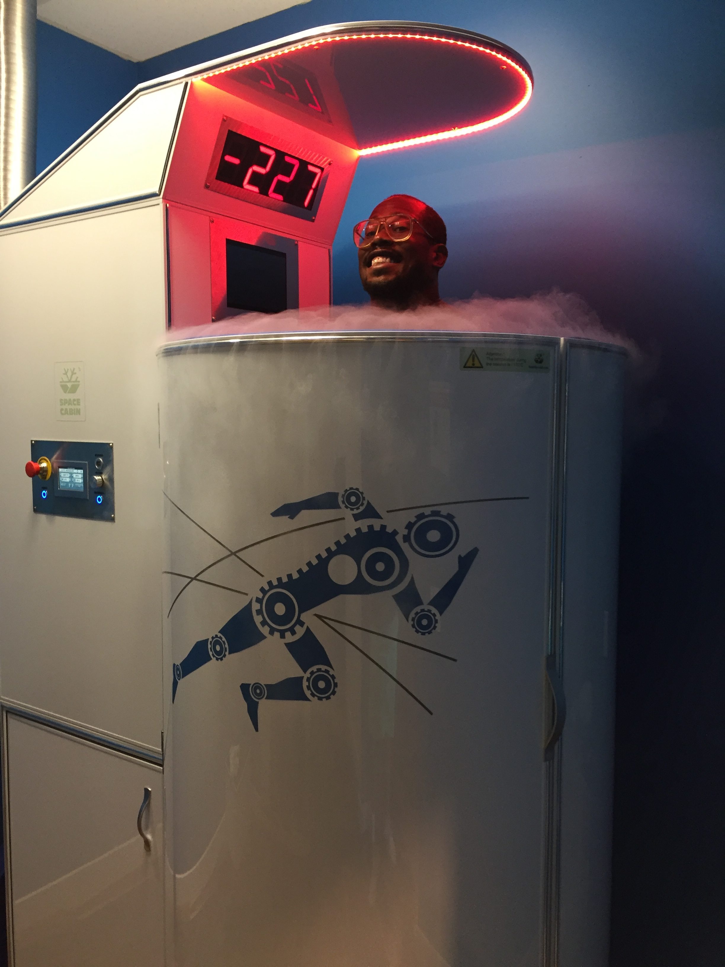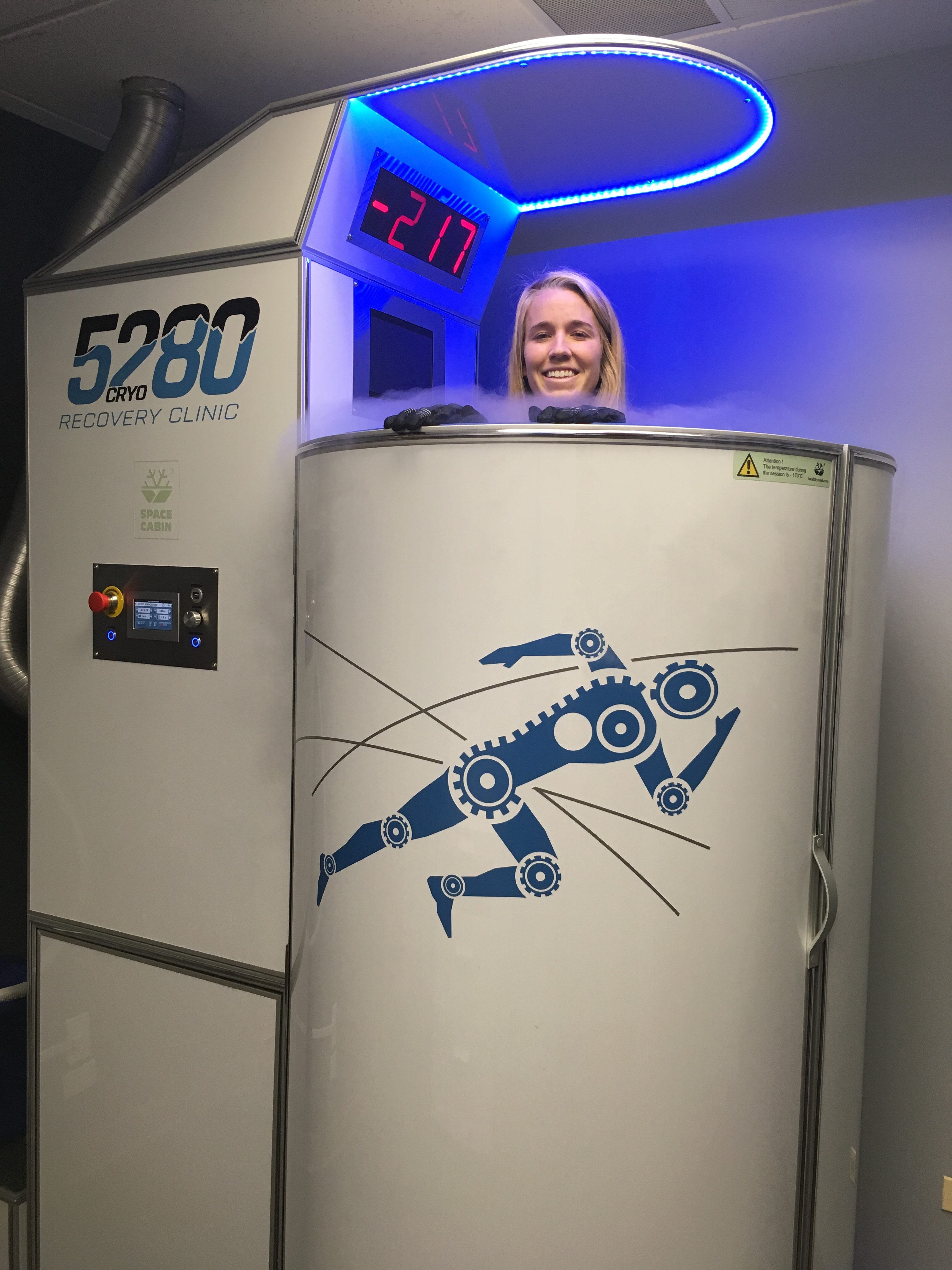 After discussing with Dr. Tuchscherer, it was time to be taken back to the chamber. I had to sign a consent form and then was directed to a changing room where I was instructed to take everything off and put a robe and slippers (with socks) on. After putting those on, I then went into a separate room where the chamber was. When I walked into the chamber, it was super padded on the inside which I was not expecting and I also had to be elevated up to where my head and hands were peeking out of the top. I then took off my robe (so yes, I am fully naked in there except with slippers on) and was then handed gloves for my hands. I set my fingertips on top over the edge, and then he turned the machine on. The nitrogen starts as liquid, but is frozen and turned into gas (so there is no actual liquid touching you, just cold nitrogen gas). It feels like a blast of cold air at first, and that you are in a smoke machine since the vapor escapes through the top. It felt kind of good at the beginning, and I thought “Oh, I can definitely handle this.” Then 30 seconds hits, and I thought we were already at -200°F, nope, only at -100°F. Every 30 seconds you shift about 45 degrees. It was here at only 45 seconds, I could feel my body become numb and at about one minute, I could feel my teeth starting to chatter. It felt like such a struggle to talk since my teeth were chattering so much. “20 seconds left,” he said, and all I could think is “Thank God!” I was in the chamber for two minutes and 20 seconds and made it down to -220 °F right before he turned it off. He hands me back my robe (I’m shaking when I grab it), lowered me down, and I go back into the changing room to change back to my regular clothes.