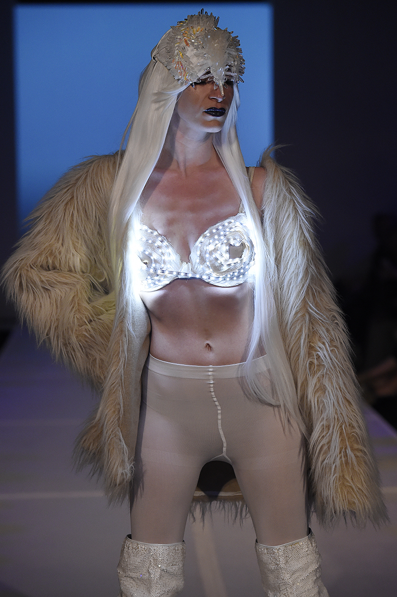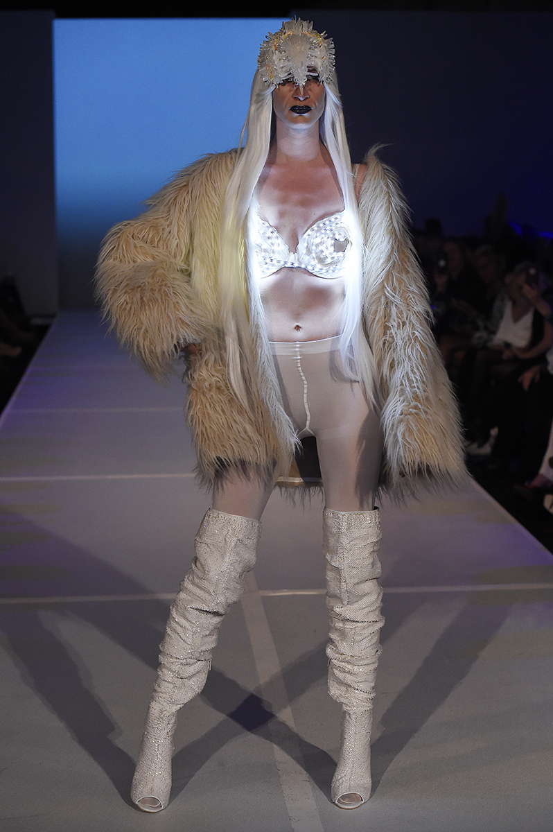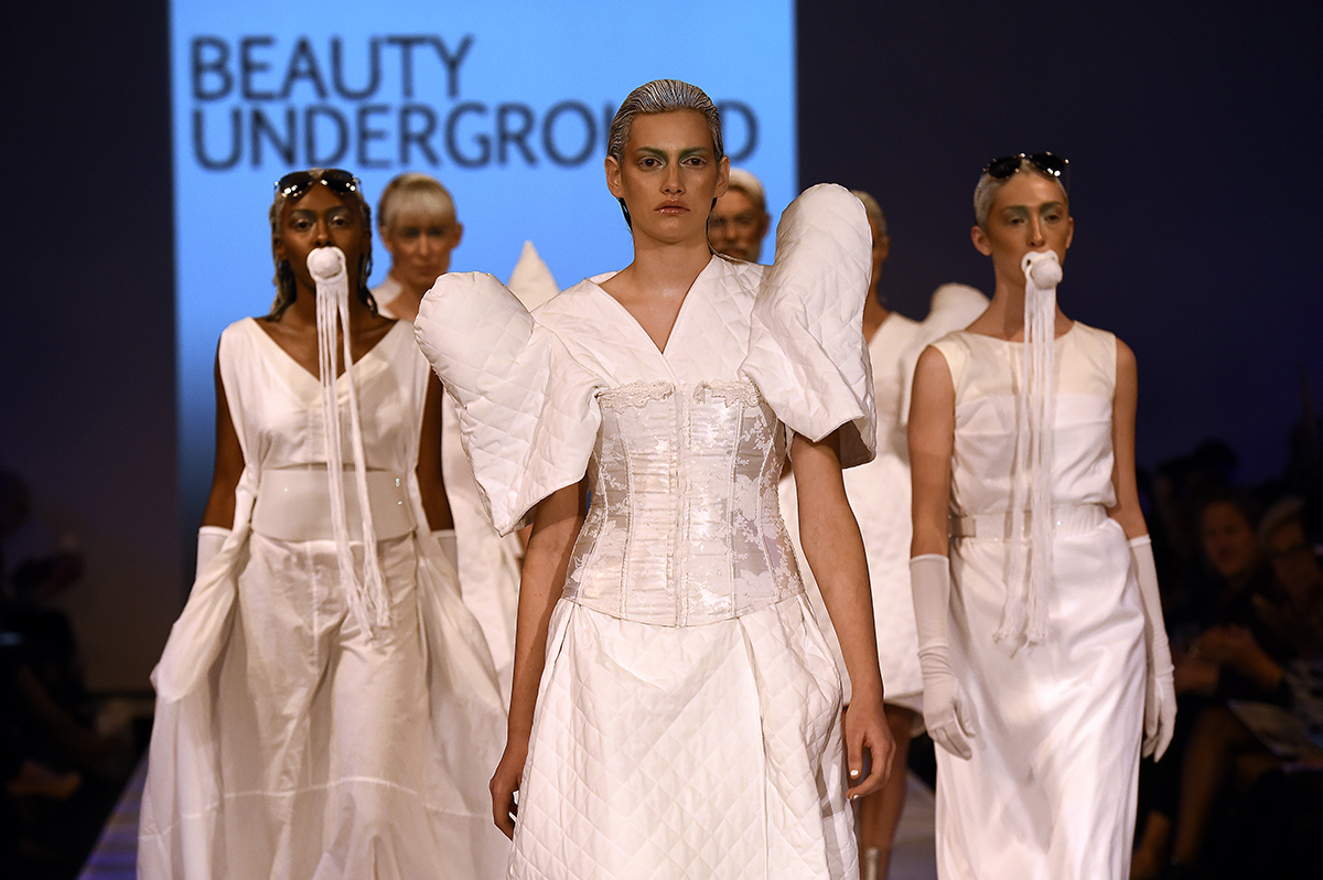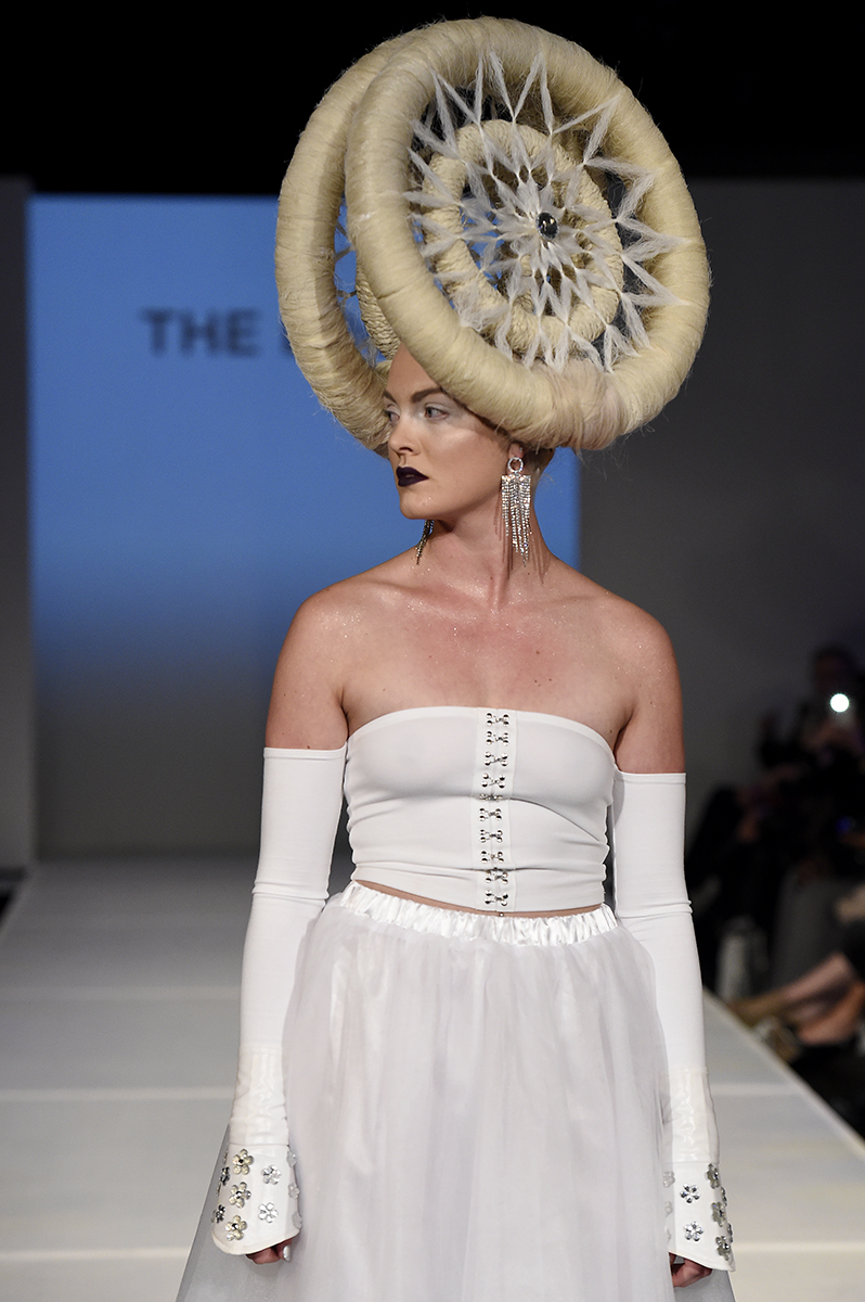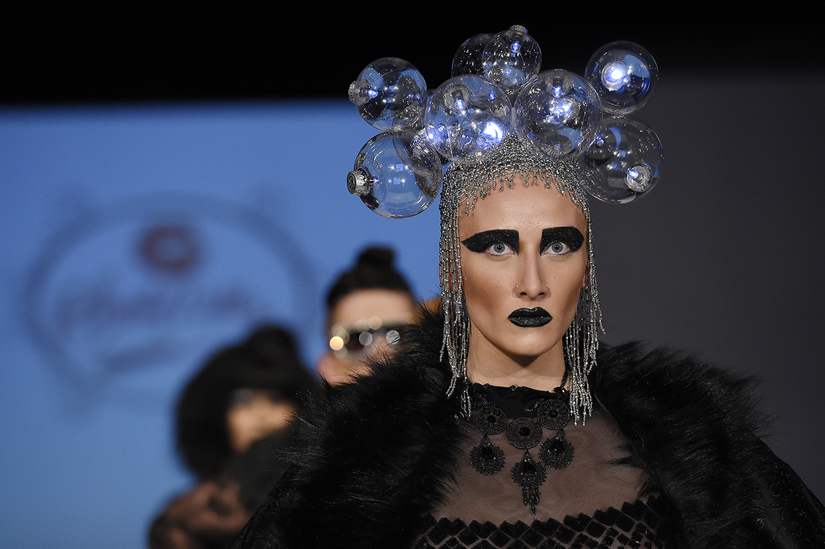Vanity Dollz hit us with another other-worldly series of designs, with a lineup that challenged normalcy with edge and sophistication. “Our inspiration was very McQueen-meets-Brooke Candy,” explained stylist, Paul Salas. “We wanted something fresh and fun, so we created this futuristic goddess.” Cha Cha Romero’s team created looks that included sculpted headpieces made out of glittery skull caps and light bulbs. It left us mystified, unable to comprehend what we just saw.