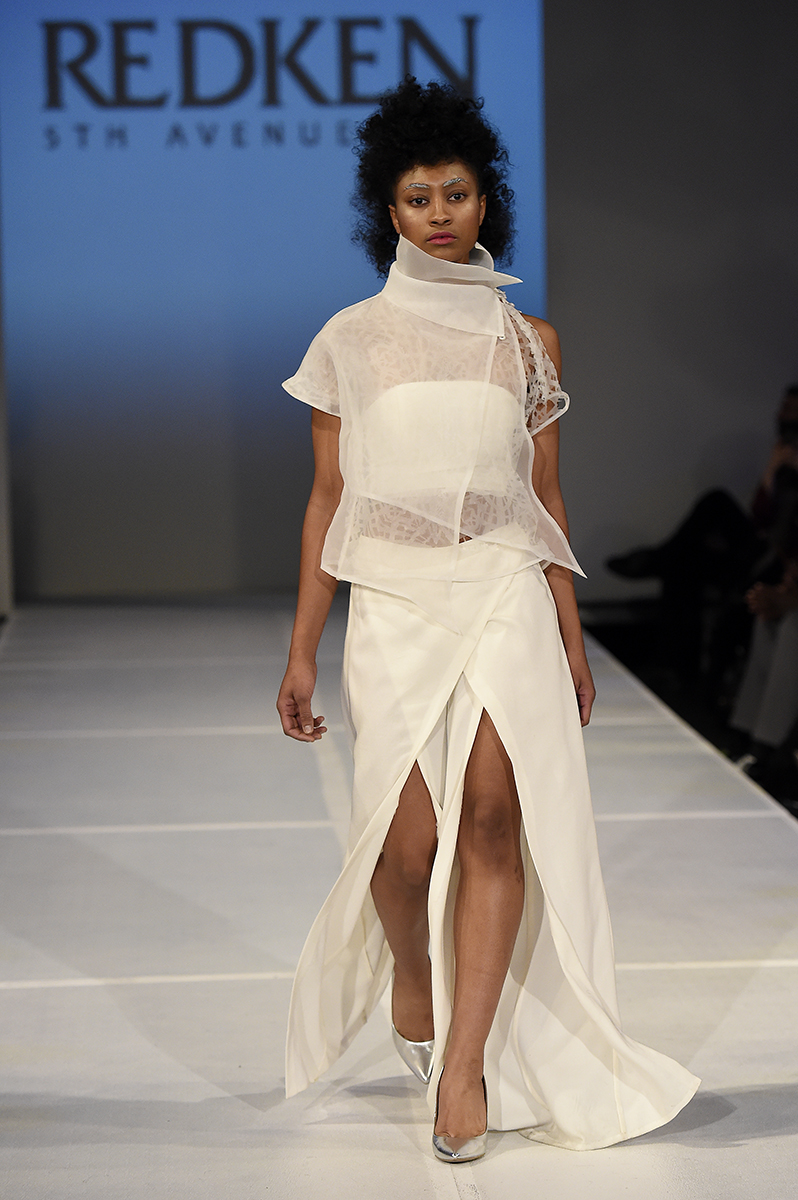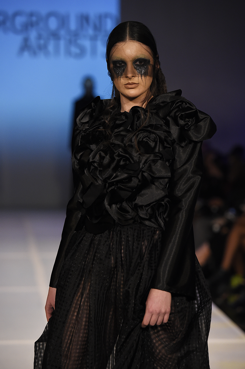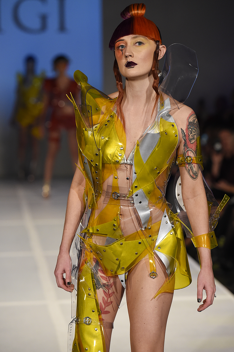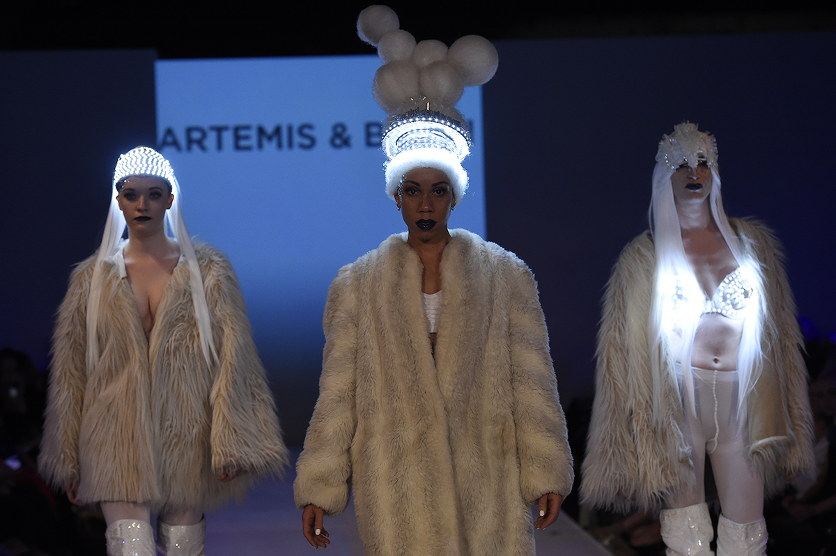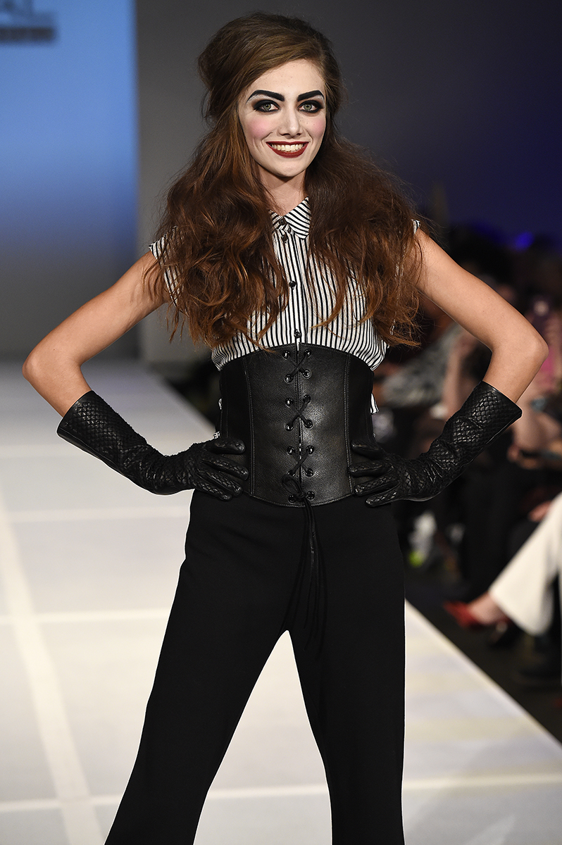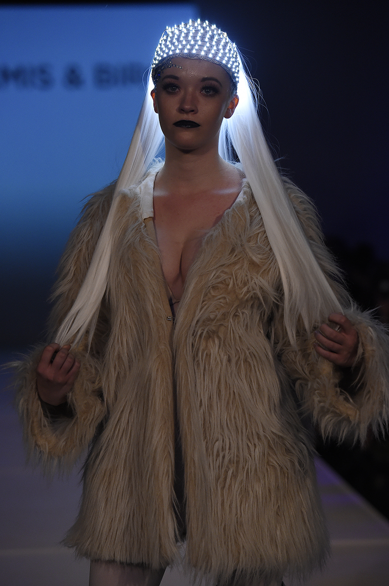 Night one began with Denver’s Jesse Mathes. She set the bar high for the rest of the weekend with her intricate metalwork that elaborately encased her models with rods of aluminum, copper and brass. Instead of evoking a sense of entrapment, the designs imbued them with power and strength. Many of her pieces came from her “Territorial Defense” collection which is inspired by aggressive interactions with men and the need for personal boundaries. According to Mathes, her collection was influenced by Queen Elizabeth I of England, whose “gowns and jewelry enlarged her presence physically and asserted her dominance over her subjects — including the many men who wished to usurp her power.”