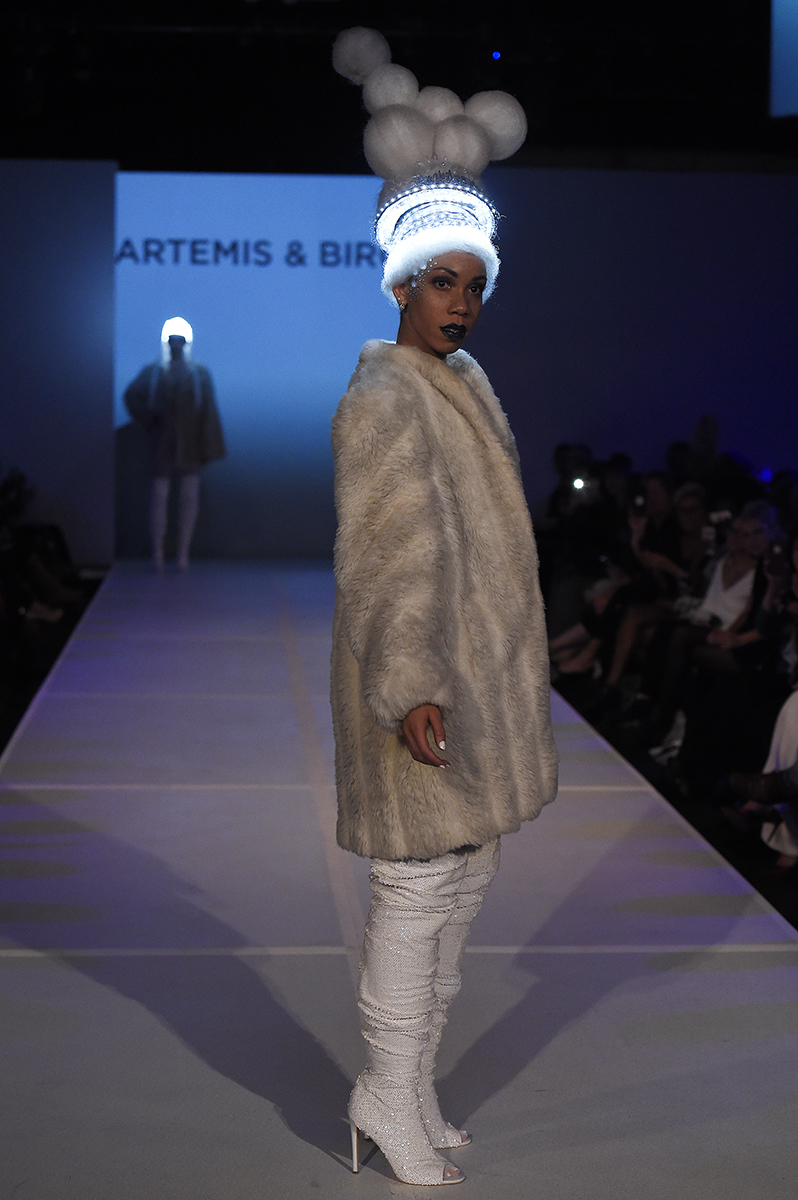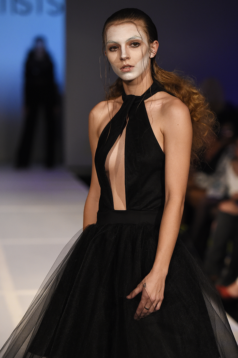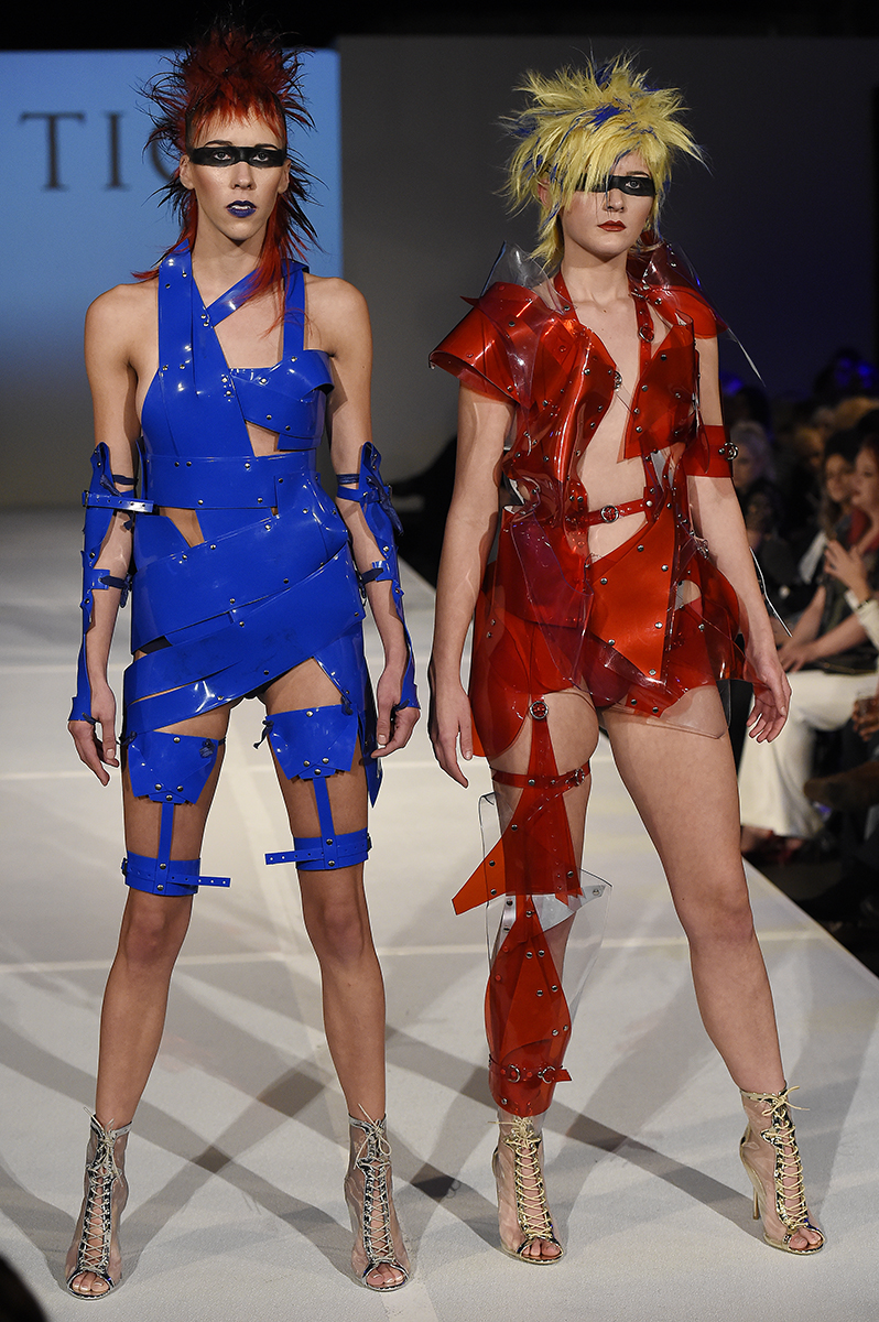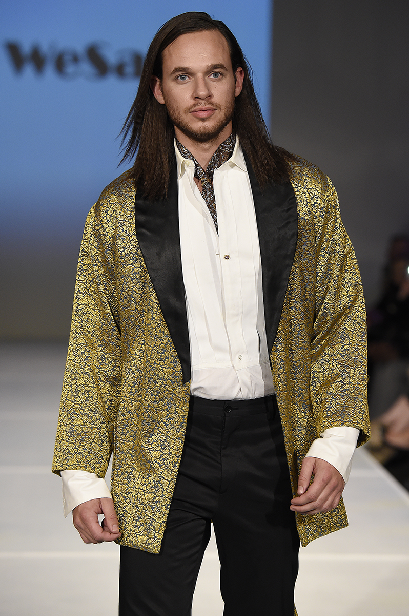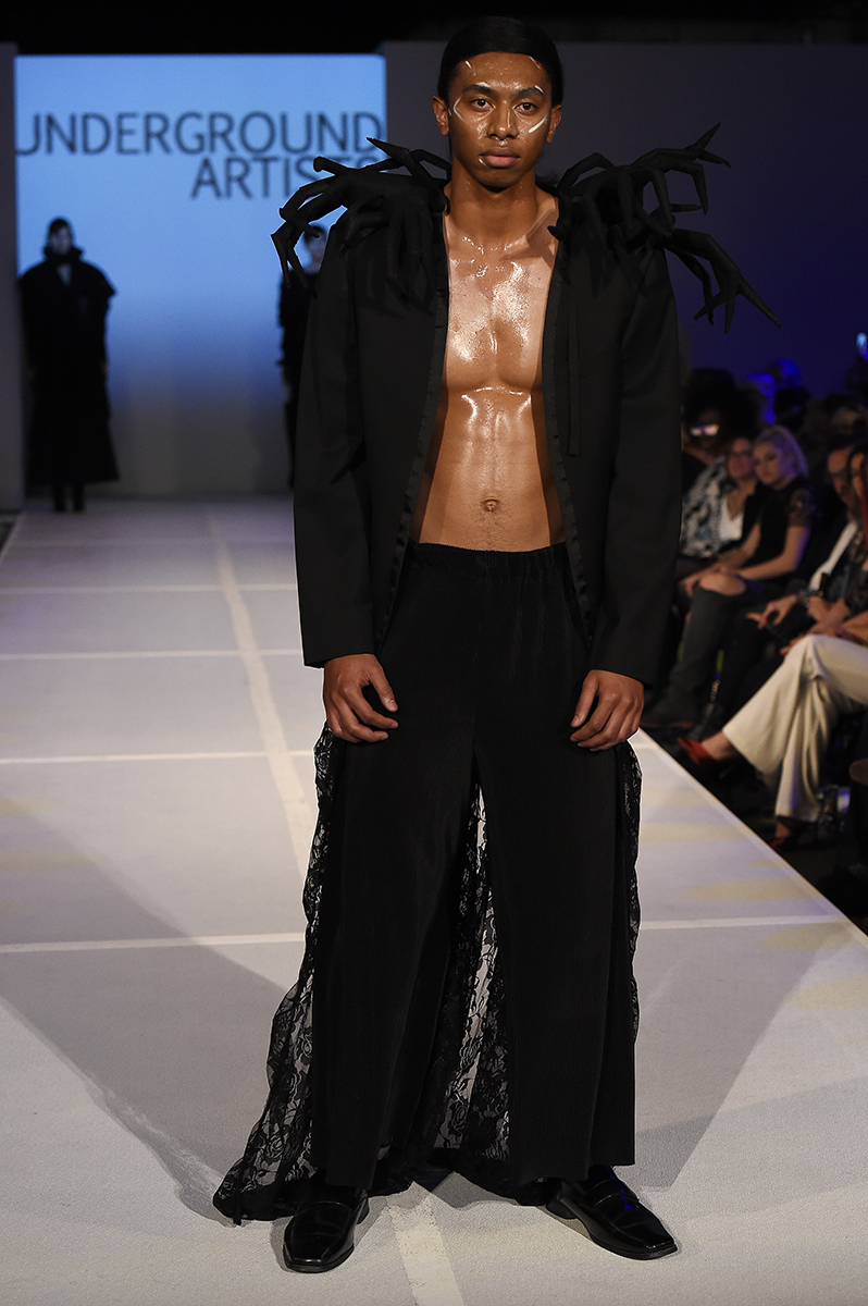 Night one began with Denver’s Jesse Mathes. She set the bar high for the rest of the weekend with her intricate metalwork that elaborately encased her models with rods of aluminum, copper and brass. Instead of evoking a sense of entrapment, the designs imbued them with power and strength. Many of her pieces came from her “Territorial Defense” collection which is inspired by aggressive interactions with men and the need for personal boundaries. According to Mathes, her collection was influenced by Queen Elizabeth I of England, whose “gowns and jewelry enlarged her presence physically and asserted her dominance over her subjects — including the many men who wished to usurp her power.”