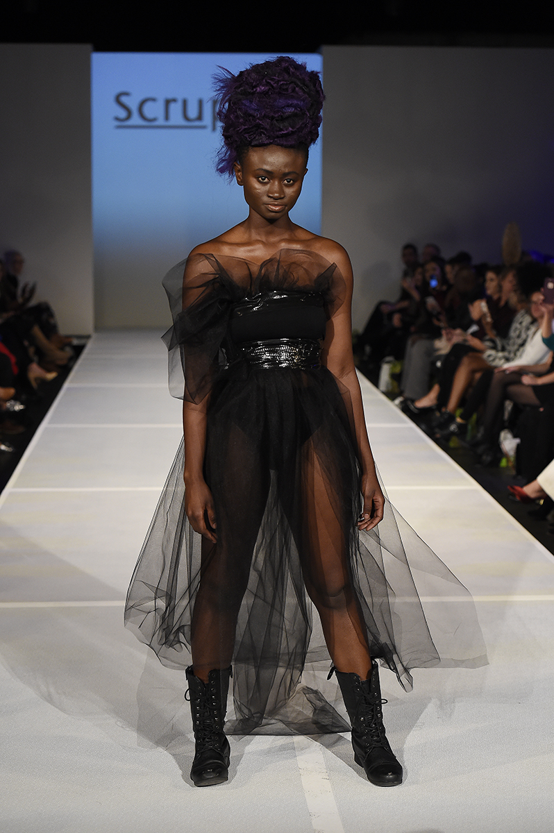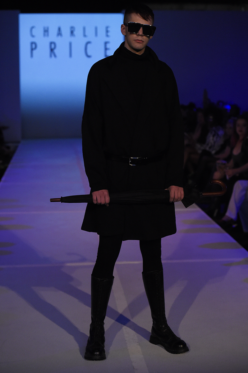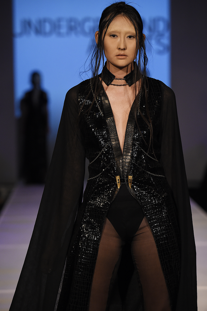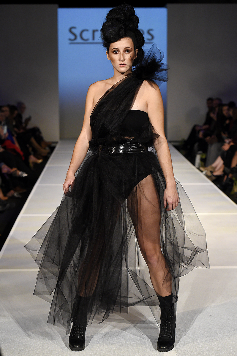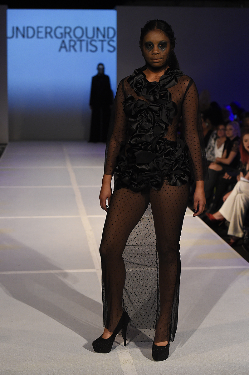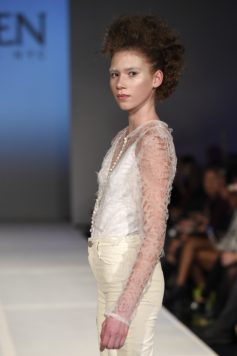 Night one began with Denver’s Jesse Mathes. She set the bar high for the rest of the weekend with her intricate metalwork that elaborately encased her models with rods of aluminum, copper and brass. Instead of evoking a sense of entrapment, the designs imbued them with power and strength. Many of her pieces came from her “Territorial Defense” collection which is inspired by aggressive interactions with men and the need for personal boundaries. According to Mathes, her collection was influenced by Queen Elizabeth I of England, whose “gowns and jewelry enlarged her presence physically and asserted her dominance over her subjects — including the many men who wished to usurp her power.”