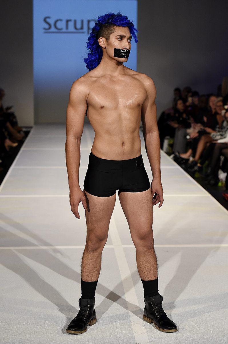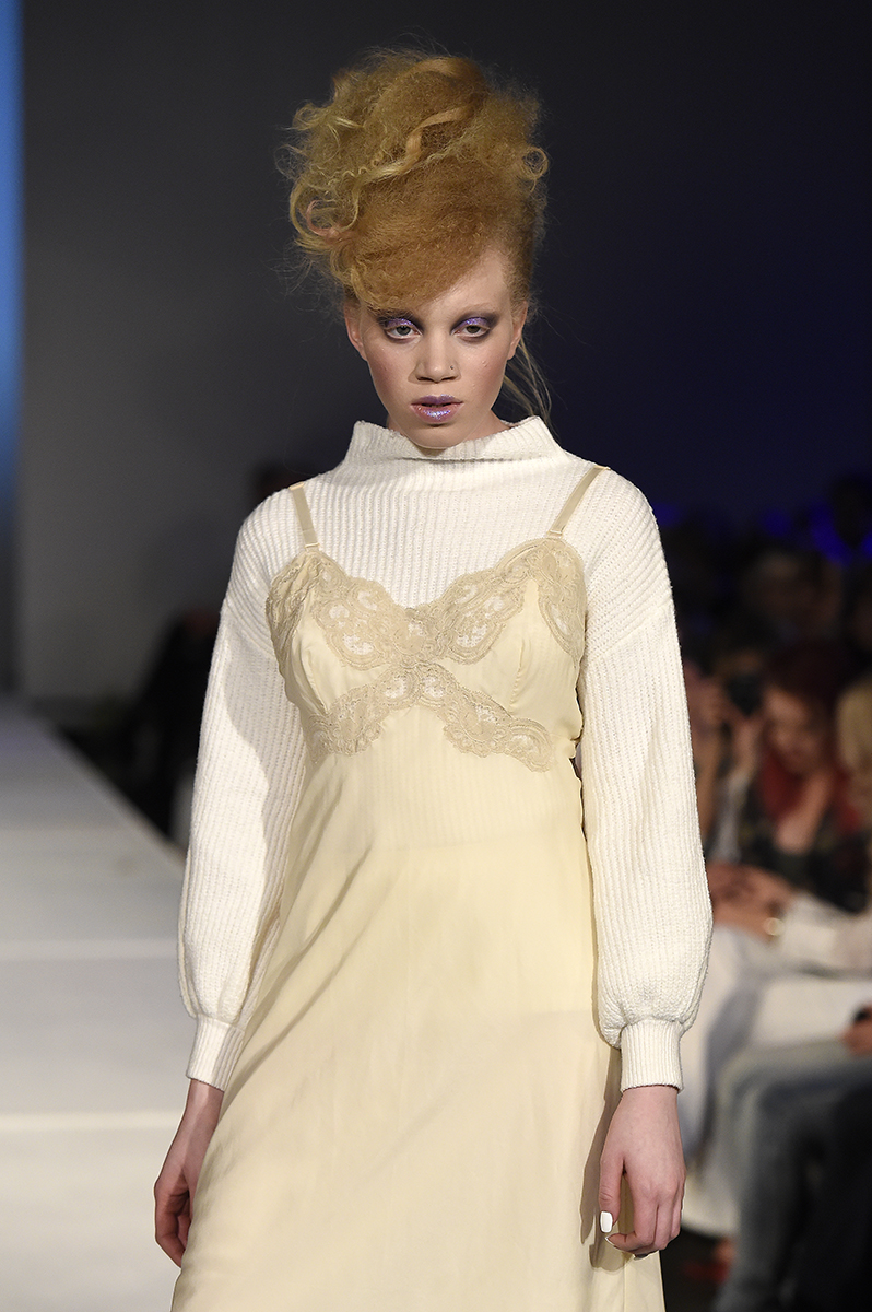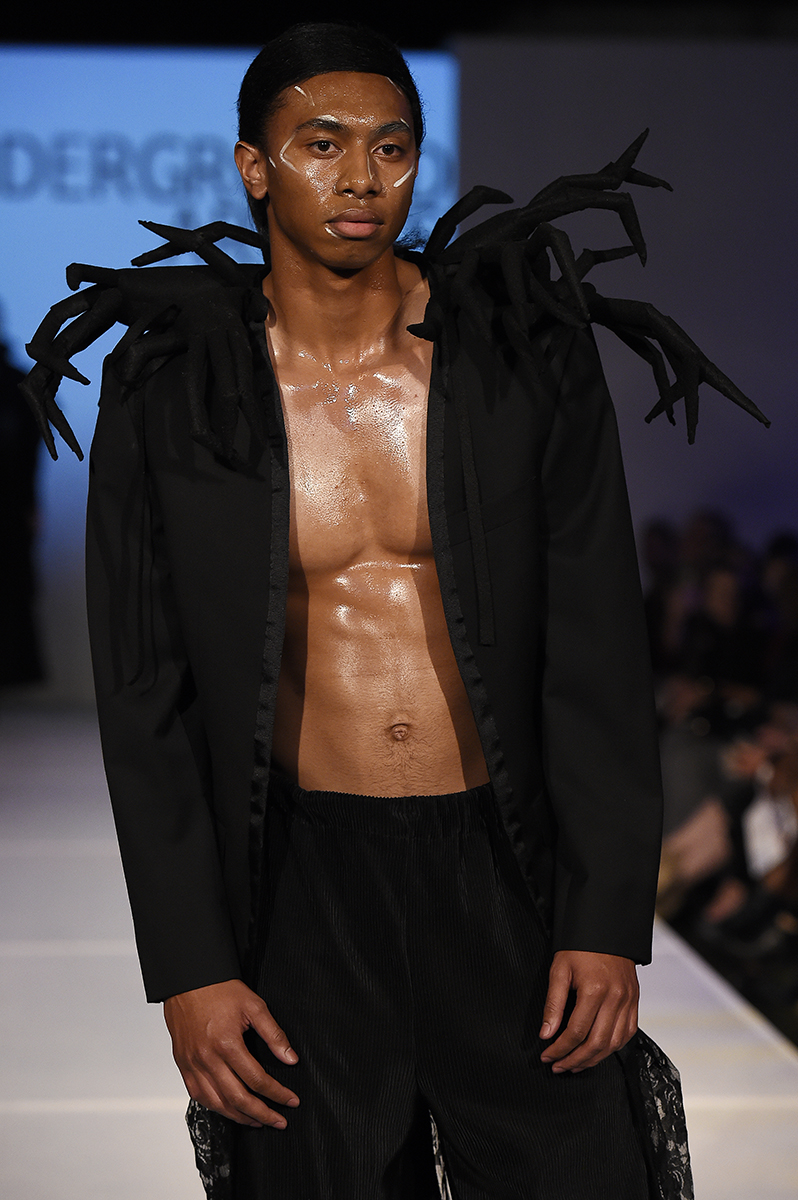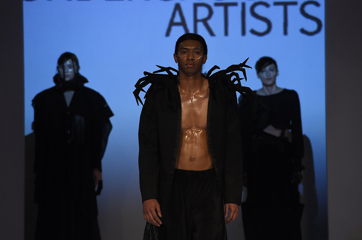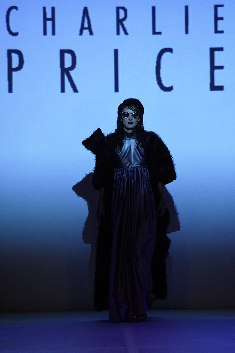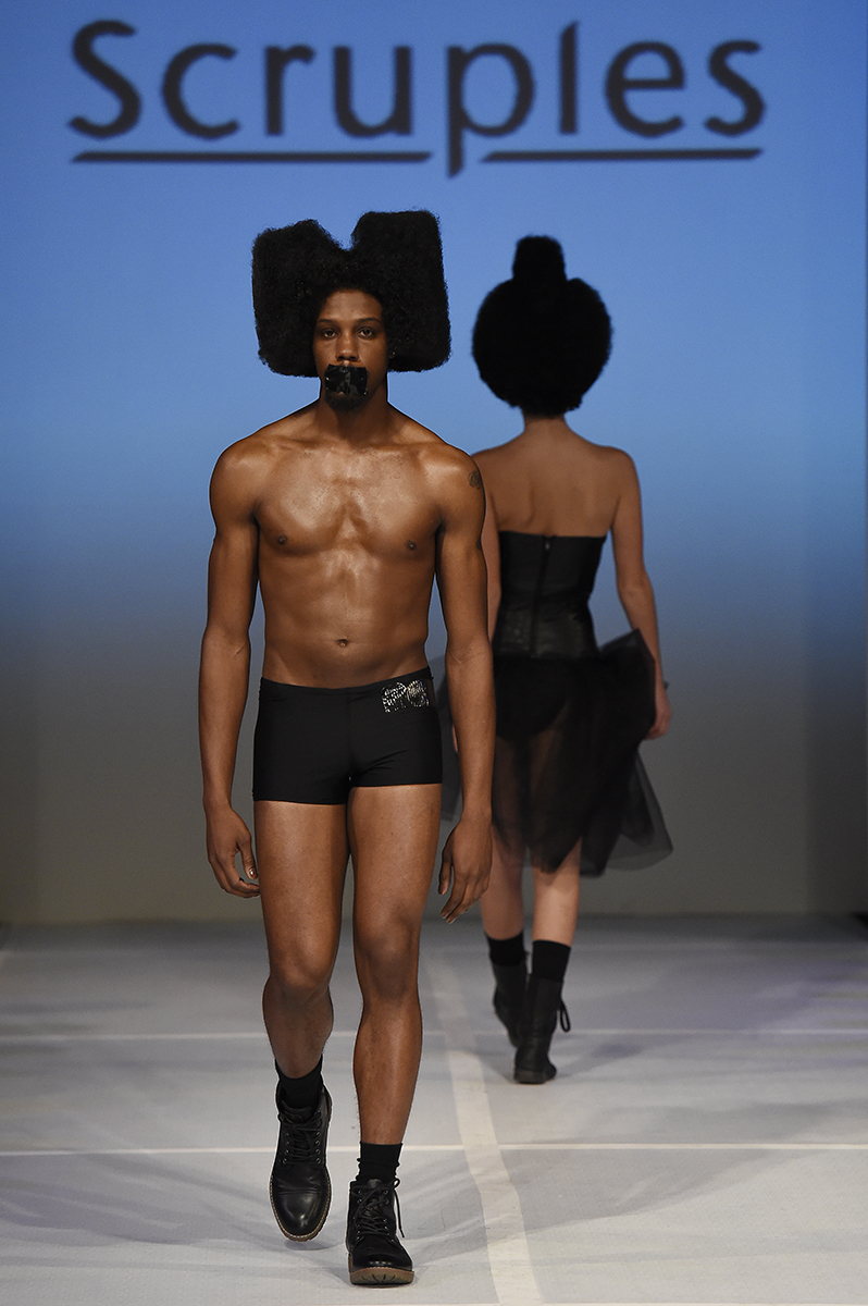 Night one began with Denver’s Jesse Mathes. She set the bar high for the rest of the weekend with her intricate metalwork that elaborately encased her models with rods of aluminum, copper and brass. Instead of evoking a sense of entrapment, the designs imbued them with power and strength. Many of her pieces came from her “Territorial Defense” collection which is inspired by aggressive interactions with men and the need for personal boundaries. According to Mathes, her collection was influenced by Queen Elizabeth I of England, whose “gowns and jewelry enlarged her presence physically and asserted her dominance over her subjects — including the many men who wished to usurp her power.”