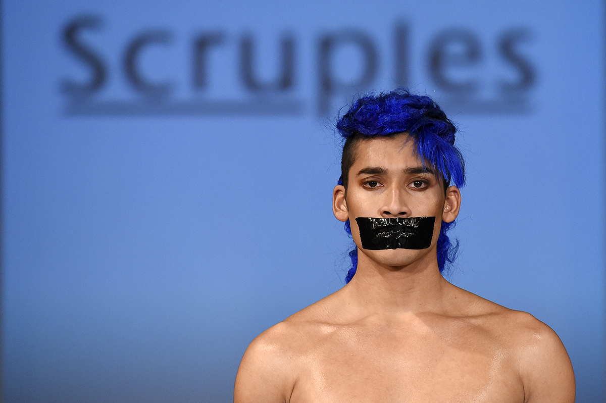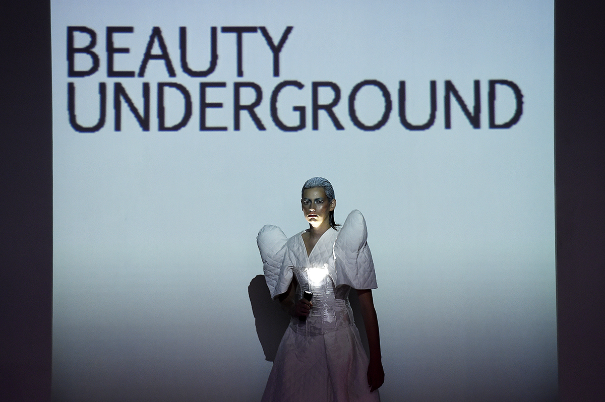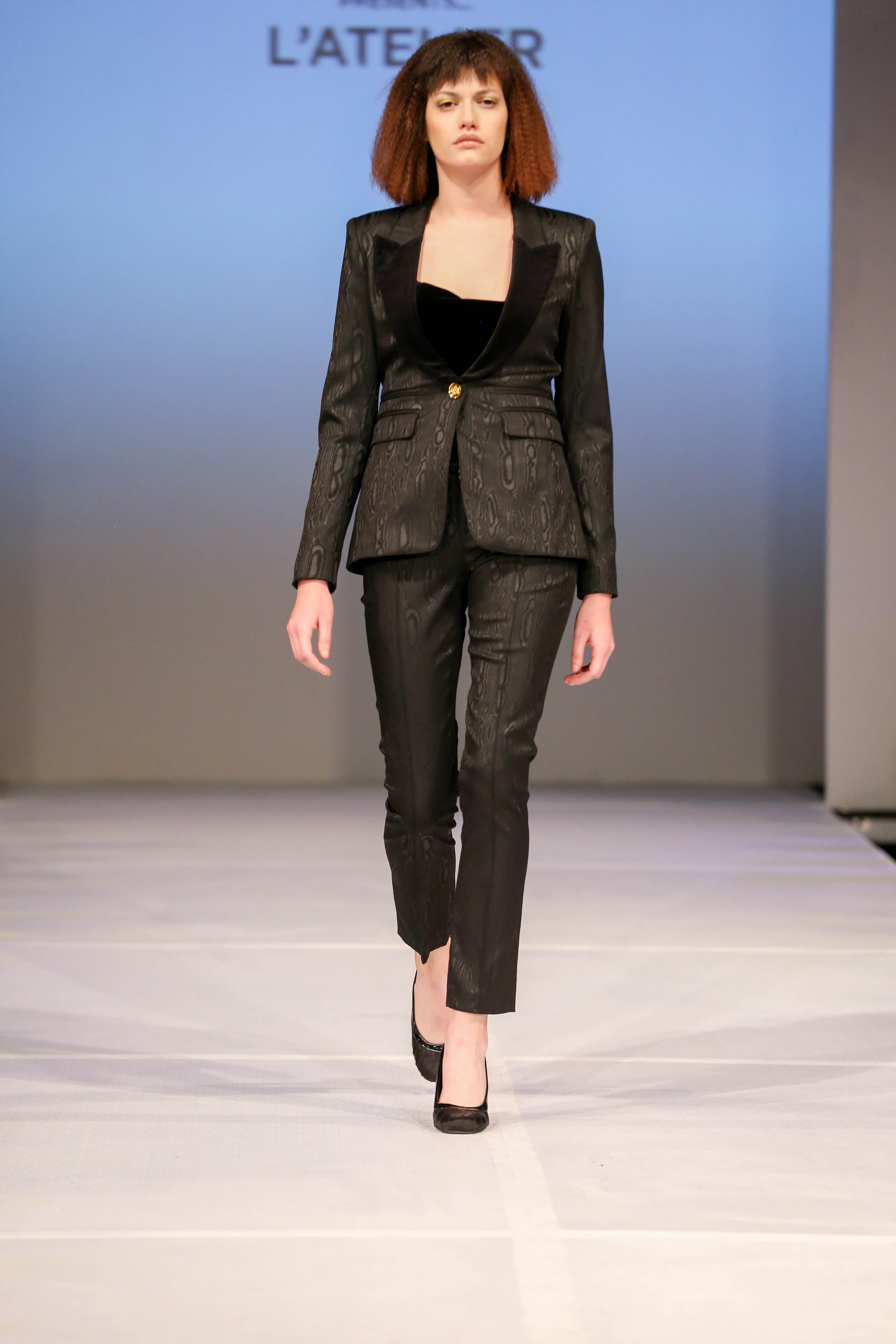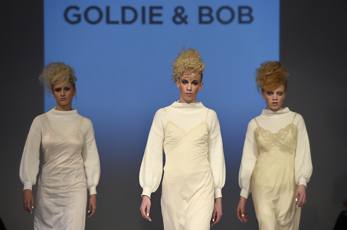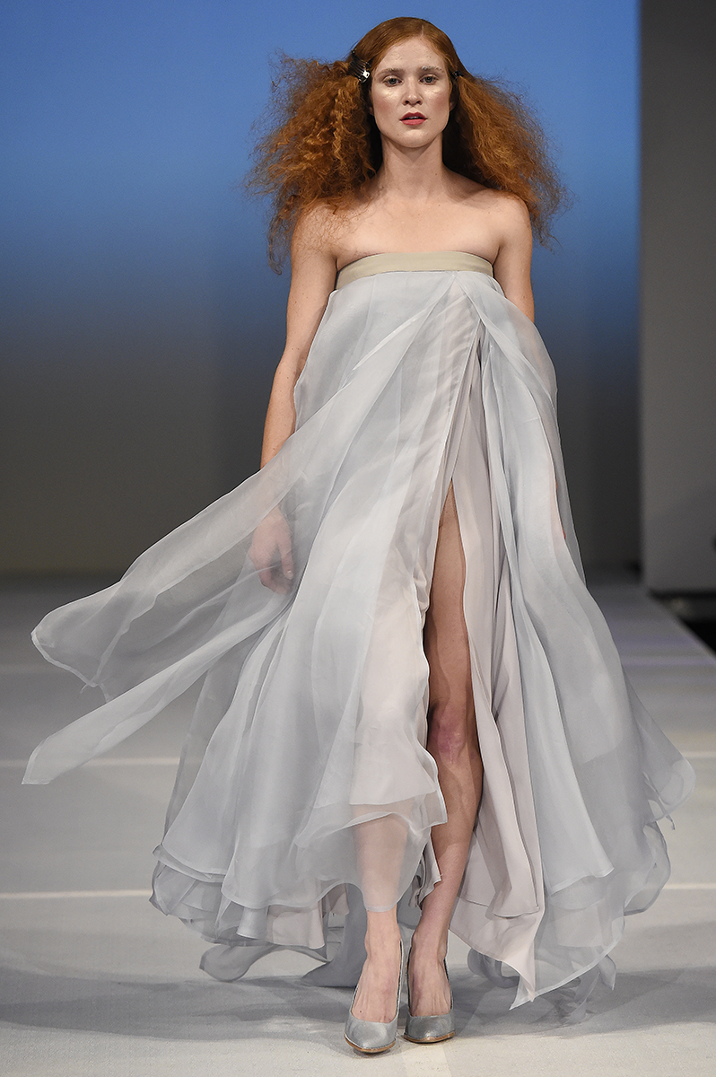 Night one began with Denver’s Jesse Mathes. She set the bar high for the rest of the weekend with her intricate metalwork that elaborately encased her models with rods of aluminum, copper and brass. Instead of evoking a sense of entrapment, the designs imbued them with power and strength. Many of her pieces came from her “Territorial Defense” collection which is inspired by aggressive interactions with men and the need for personal boundaries. According to Mathes, her collection was influenced by Queen Elizabeth I of England, whose “gowns and jewelry enlarged her presence physically and asserted her dominance over her subjects — including the many men who wished to usurp her power.”