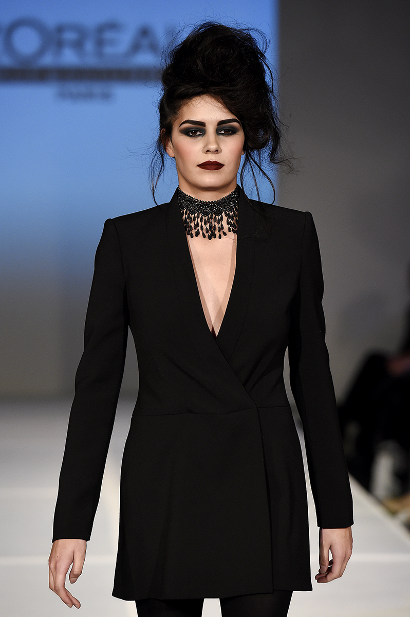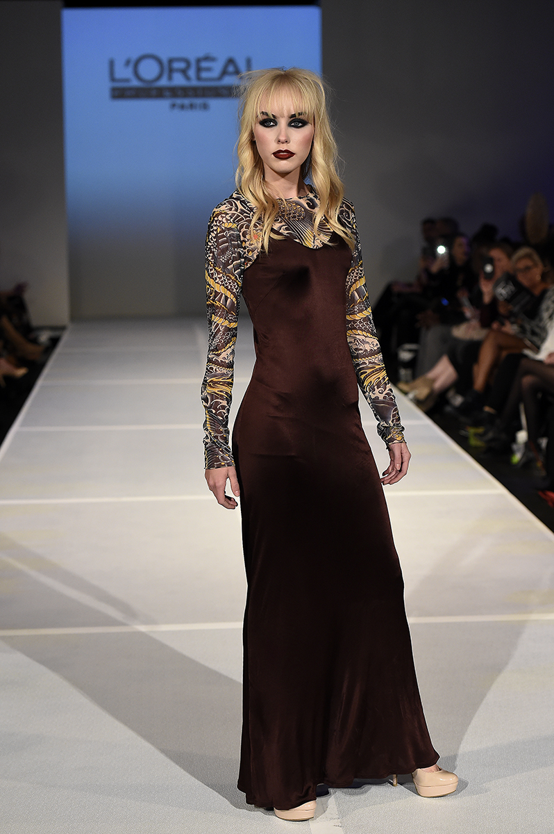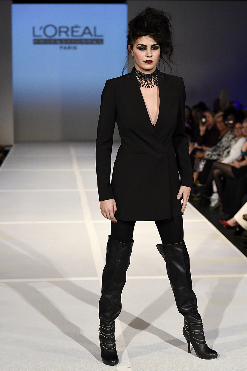 TIGI absolutely stunned the crowd with a provocative display. Eric Gomez’s team used a technique that made each model’s hair look like dripping paint cut into geometric styles. In an equally bold move, Gomez dressed the models in barely-there outfits made of plastic straps and buckles. It was a show that only a true creative genius could imagine, much to the delight of those of us who sat slack-jawed in the audience.