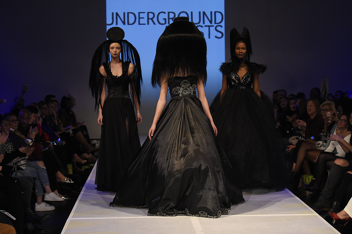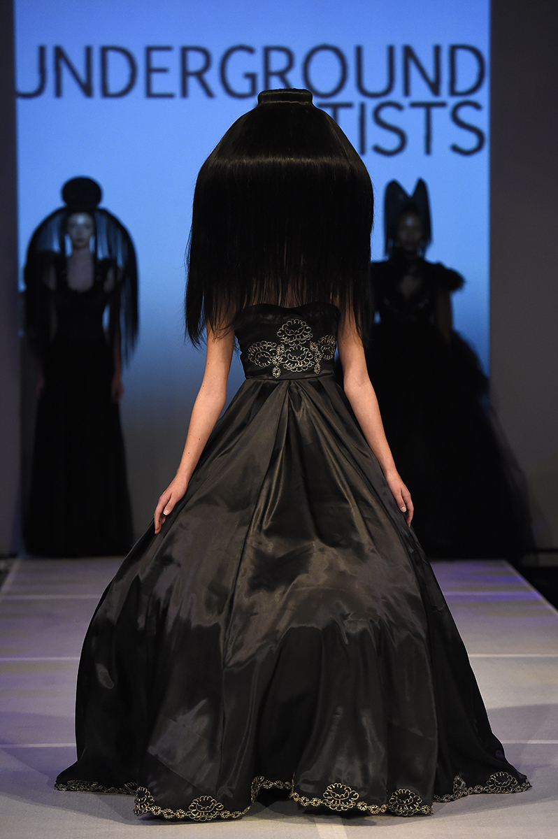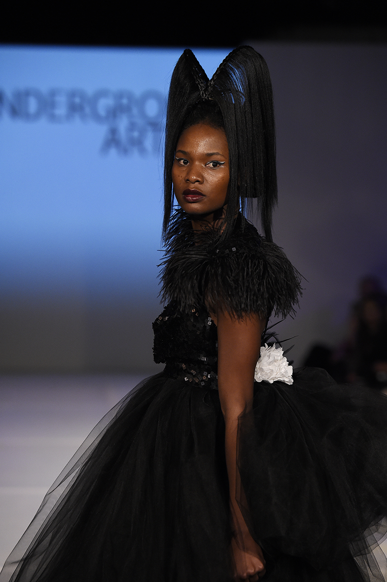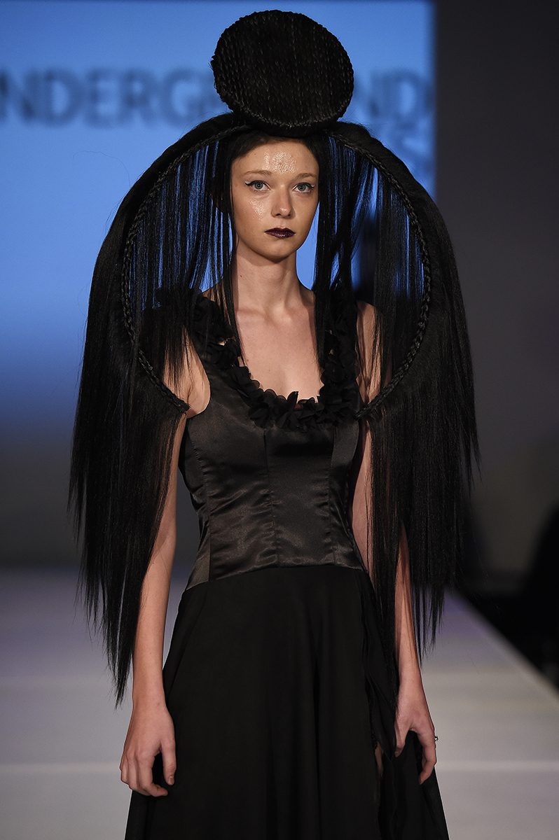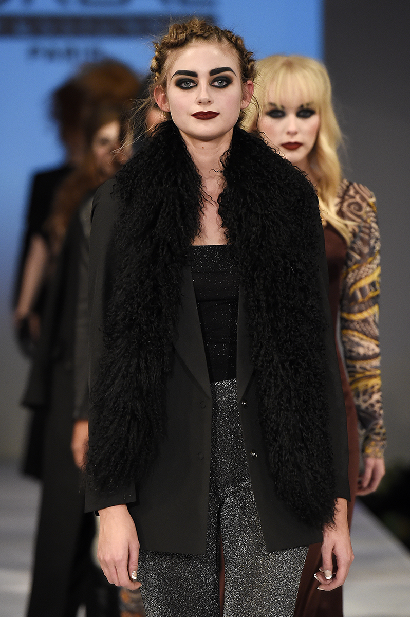 Each of Night Three’s two segments closed with an overarching theme, the first being “Chrystalline.” Artists from local salons each put three looks together, all in white, to show their interpretation of the theme. Artemis & Birch, added an extra layer of intrigue with hair sculptures that actually lit up as the models walked, while Goldie & Bob told a story through each of their models. “I made up this story about a girl from New York who is rebelling against her family, and this is her journey back to where she belongs,” said Liz Burns, owner of Goldie & Bob. “The crystals and textures of all of the upstyles reflect her beauty and struggle.” The theme “Obsidian” closed the show. Obsidian was the night to Chrystalline’s day with each of Denver’s best designers working with top local stylists to create a darkly hued theme. Hailey Hodapp & Rachel Marie Hurst paired lace and satin with heavy eye makeup that whereas Bri Bird & Tyne Hall when lighter, rimming their models faces with white. Hannah Werling & Duane Topping went fresh-faced with dark texture leather dresses whereas Stephan Lauren & Kotomi Yoshida brought out some avant-garde menswear that resembled an arachnid. For the last walk, hairstylist Alicia McQuilliams teamed up with fashion designer Maggie Burns of Marie-Margot. Models wore custom, onyx-hued gowns and veils of jet black hair that obscured their vision and blinded us with awe.