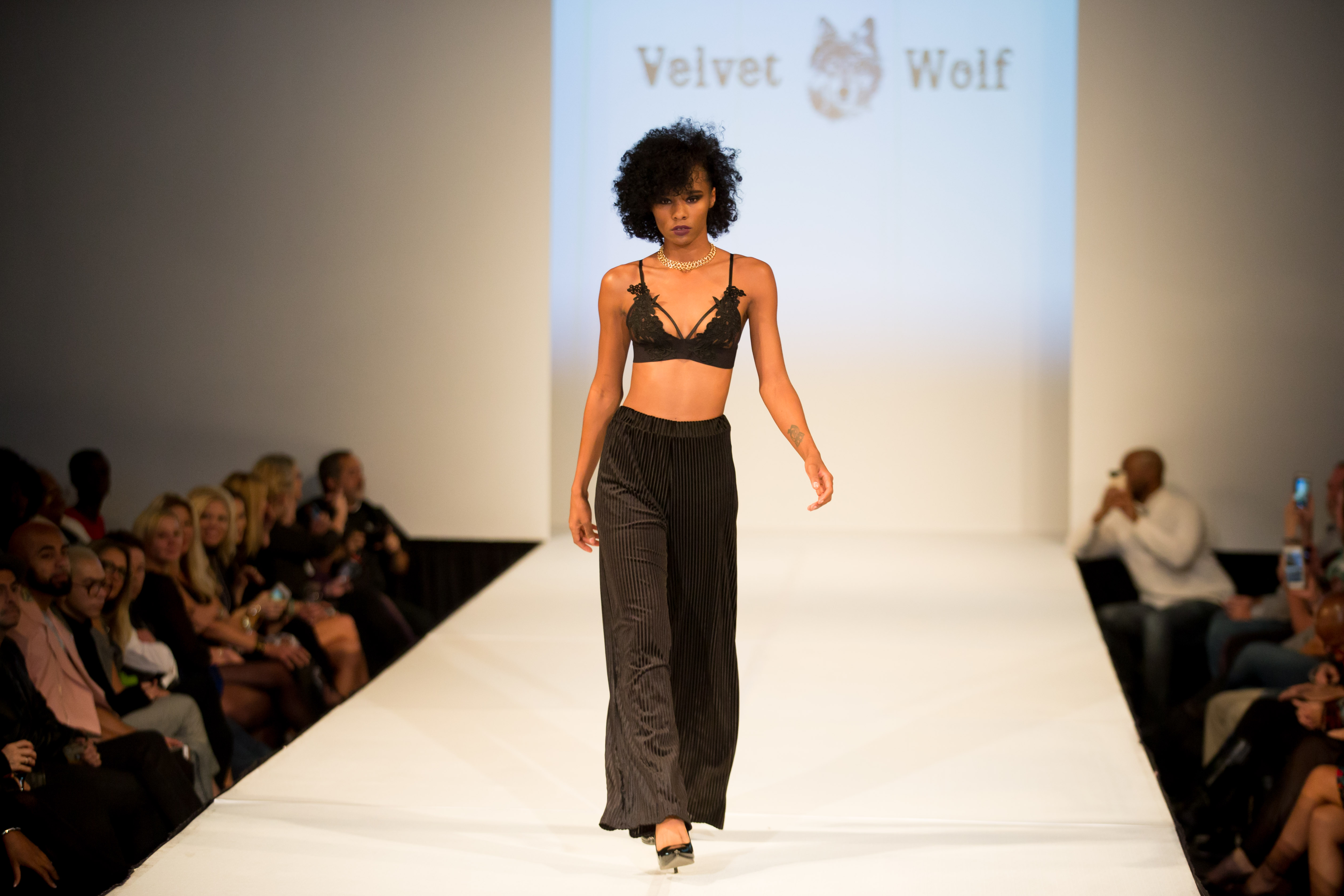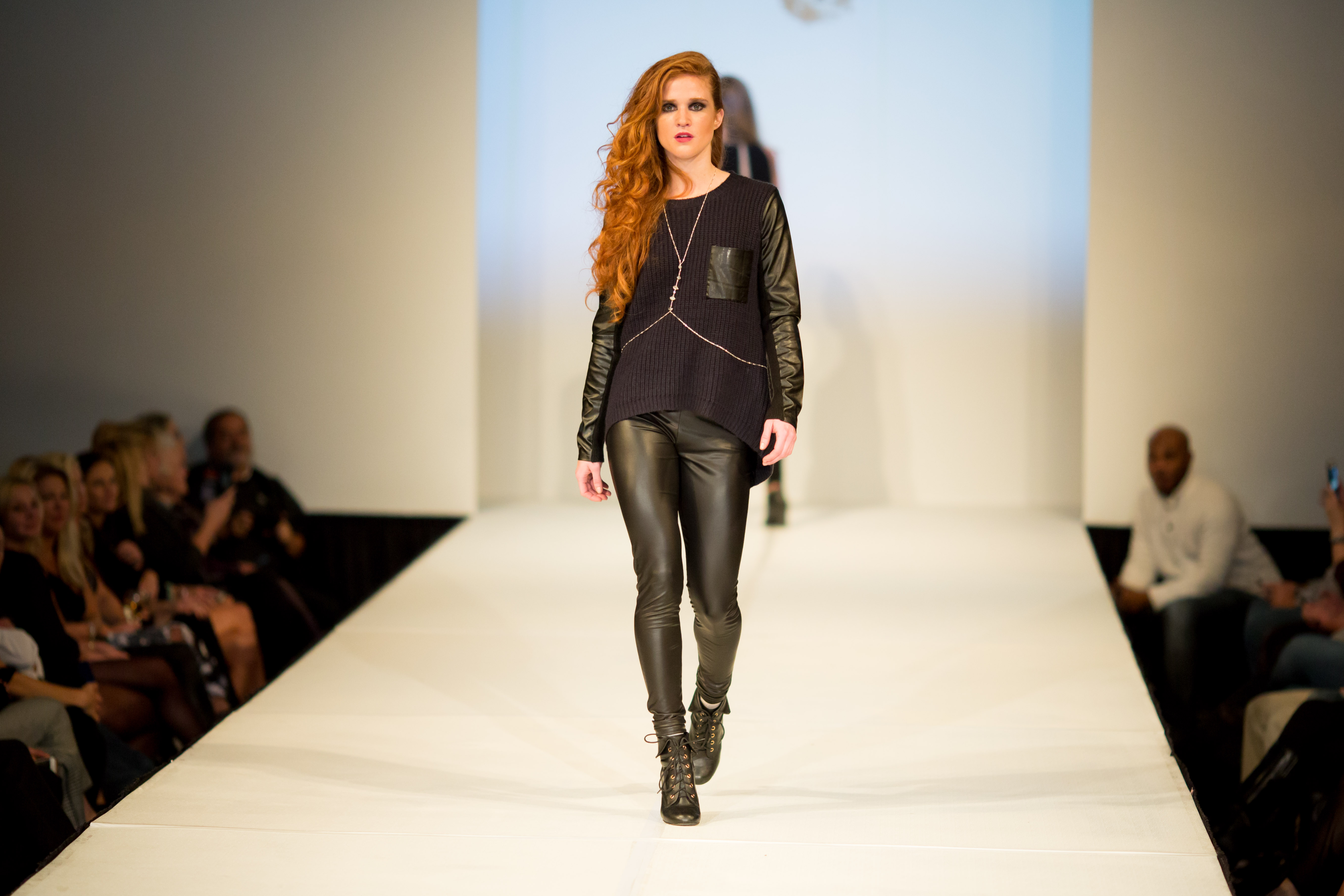 Next up, Royal Outerwear maintained the strong attitude of Mathes work but took it to a street level. The local designer, whose shop is just blocks away from the event, used a neutral palette mixed with eclectic patterns to give us an urban luxe line. Nuorikko then softened the scene with custom wedding gowns. The local shop utilized non-traditional bridal silhouettes, capes and separates for sophisticated yet modern looks. Velvet Wolf, a Denver boutique, took a similar route as Royal Outwear and featured more casual apparel that came with a bite: Leather, fur and denim mirrored popular trends in modern streetwear with an undertone of punk.