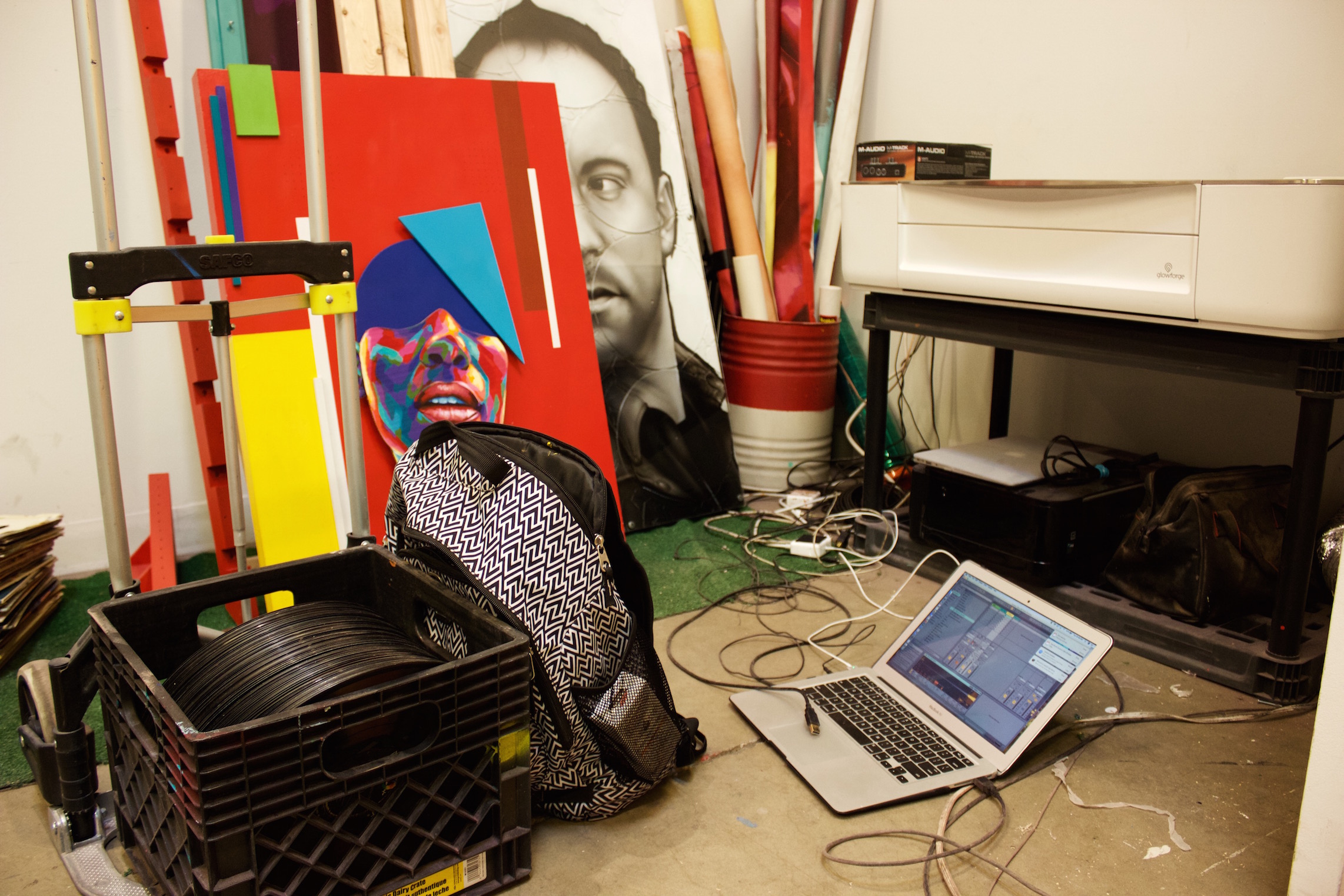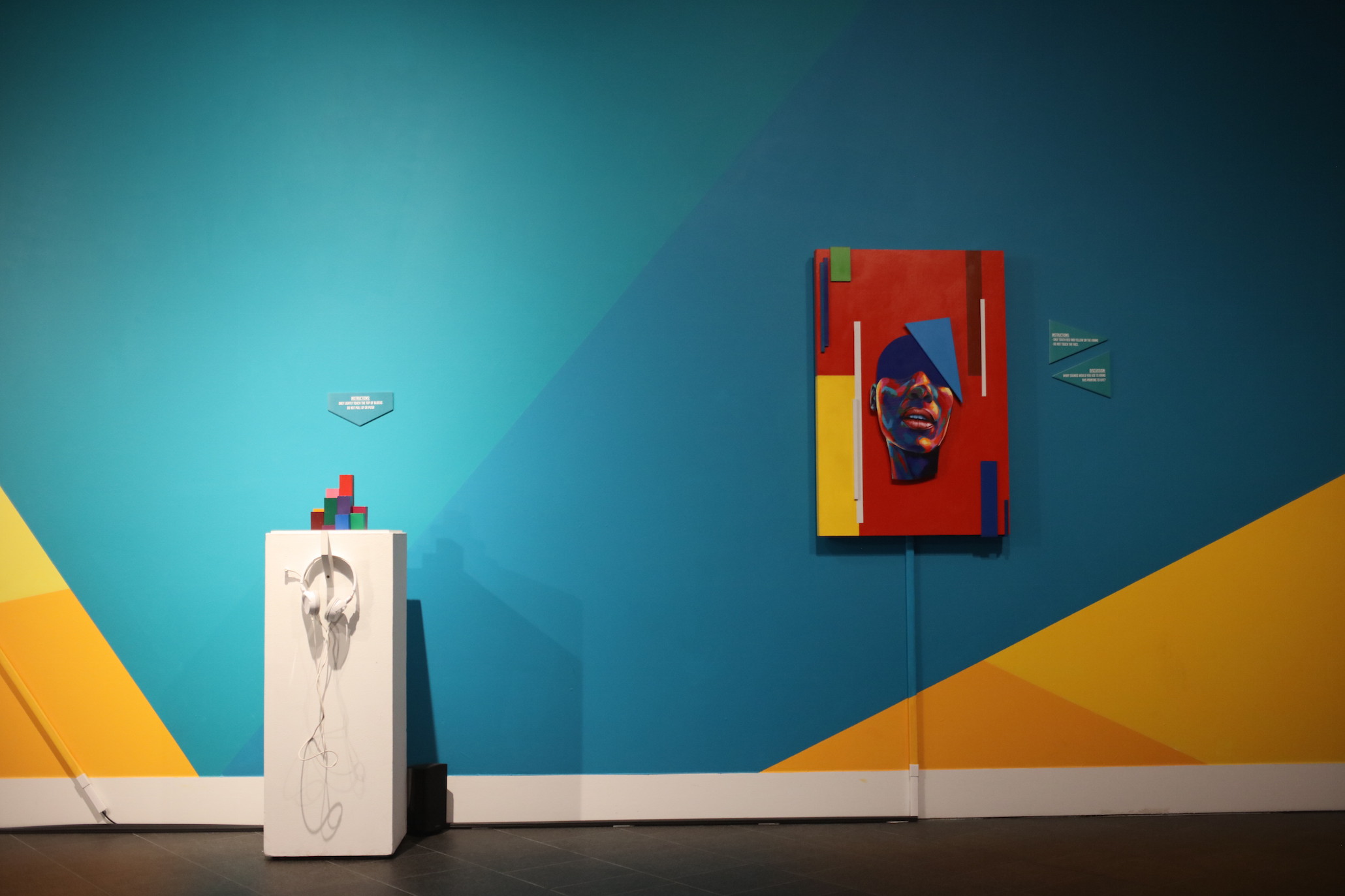 The interactive art Detour is currently making connects several of his passions into one multi-sensory exposure. One of his new techniques uses proximity sensors behind an abstract painted canvas so viewers can wave their hands in front of sections to elicit an audio response. Another popular installation involves long strings on the wall that are plucked to start a “loop” of sound or voice.