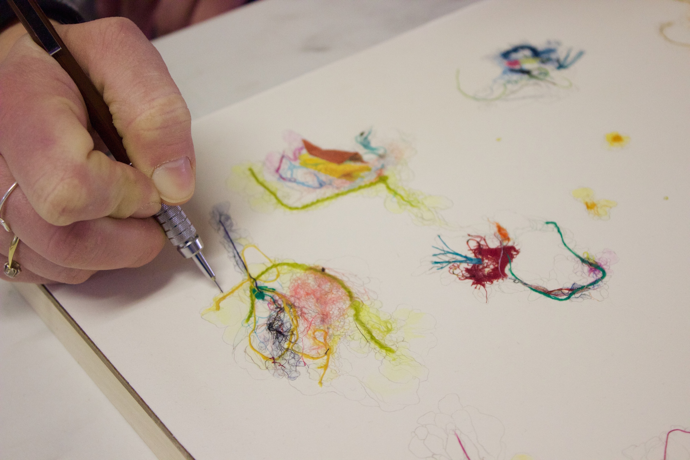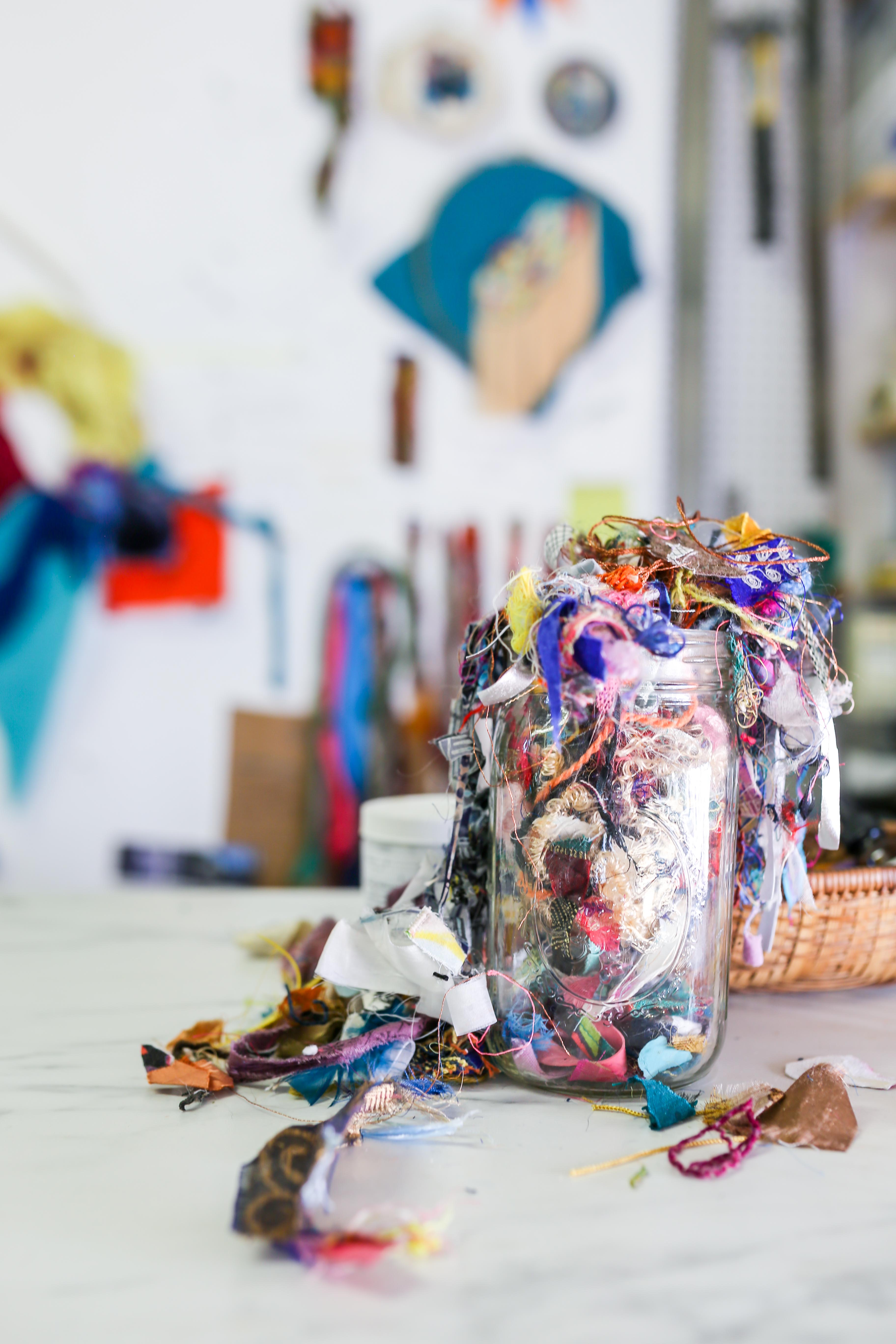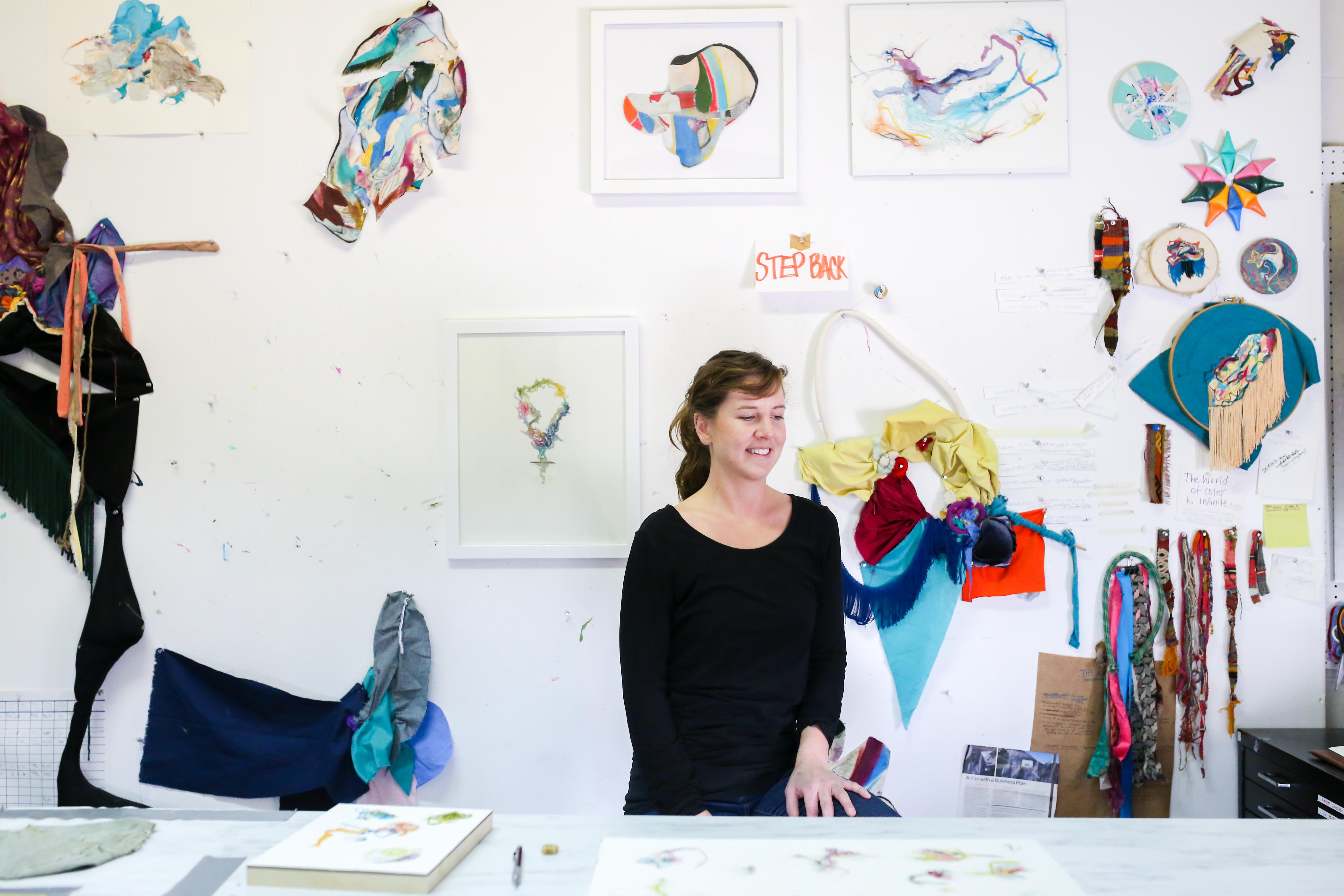 At GRACe (Globeville Riverfront Art Center), Emma Balder has a container outside her door for other people and artists to deposit pieces of their fabric waste or leftovers that she calls the “textile recycle bin.” For the last few years, she has been enveloped in using these remnants as the main medium for her art, creating fiber paintings that are both delicate and ethereal, as well as some larger fabric installations. Balder started using textile waste after she participated in an international artist residency where she observed how much a group of artists generated unused scraps of material and an Indian artist provided her with a bag of trimmings from a clothing tailor in India. She called these first fiber paintings “pinglets.” From then on, she collected and used any size scrap as part of a piece of art, from the smallest single thread you might find snagged on a tree branch to pieces of fabric that must be cut out of patterns from fashion designers.