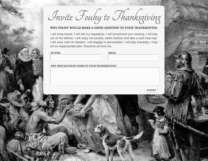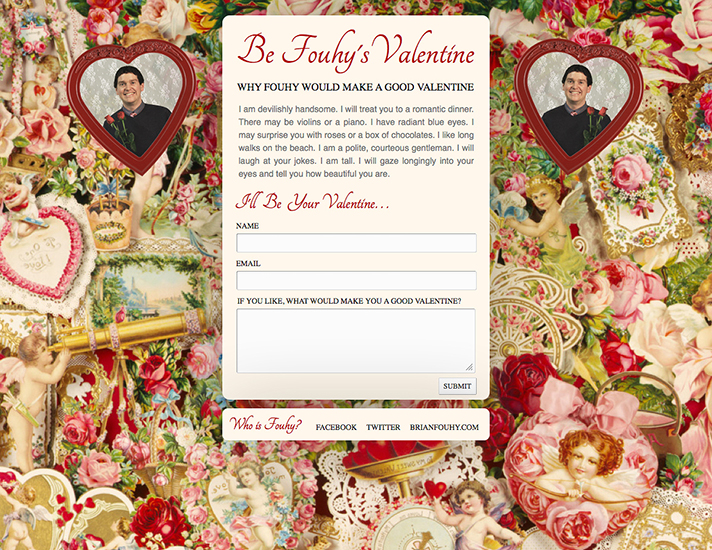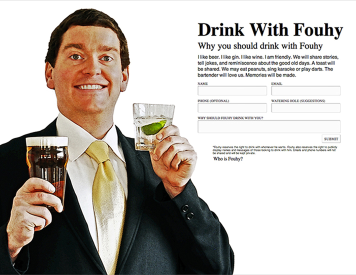 While he spent countless hours photographing random words, he also found time to “mess around on the internet.” Through his advertising career, he was opened to the world of digital art, which led to his first single-serve website, “Invite Fouhy to Thanksgiving”— a submission form for people to literally invite him to their Thanksgiving dinner. That led to a series of similar websites, “Be Fouhy’s Valentine,” “Drink with Fouhy” and “Drive with Fouhy” as well as a few even more ridiculous URLs like whattimeisfrasieron.com, eddiemurphylaugh.com and michaelboltonkennygridingdolphin.com. “The world needs easier access to something like being able to click a website to hear Eddie Murphy laugh,” Fouhy joked, though the intention to create a minute of happiness is serious and real. These websites are only good for one purpose, which puts them on the same level as most art, though their humor and cheekiness set them apart.
