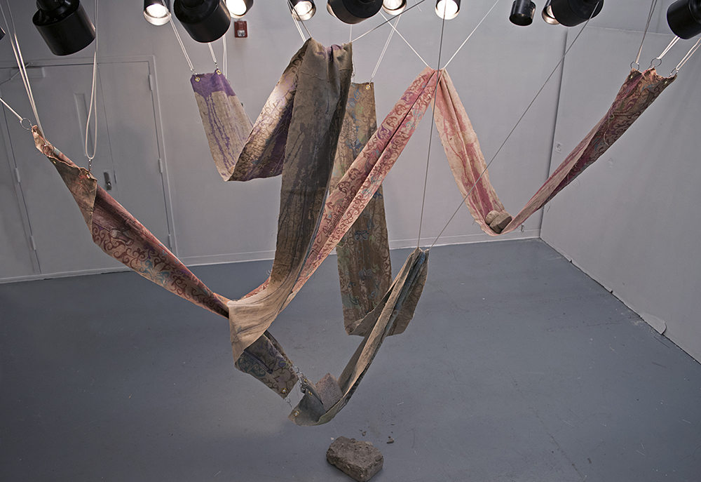 “I am fascinated by pushing the boundaries of painting and drawing and placing them in locations outdoors and elsewhere that are unexpected and unestablished while at the same time commenting on narrative histories,” Furness revealed. Part of her enthusiasm for the location of her creations comes from her ardent passion for travel and seeing old things in new ways, which she satiated recently by teaching abroad. She’s also fascinated by ruins and the idea that objects can evolve on their own, especially after they’ve been used for a particular purpose. One of her favorite past projects was when she drew on raw linen and embedded those drawings on a site within the grounds of 12th-century ruins in Ireland (with permission). After 30 days, she dug them up and sent them home, where she reconstructed them into new artifacts that have been exhibited in various forms since.