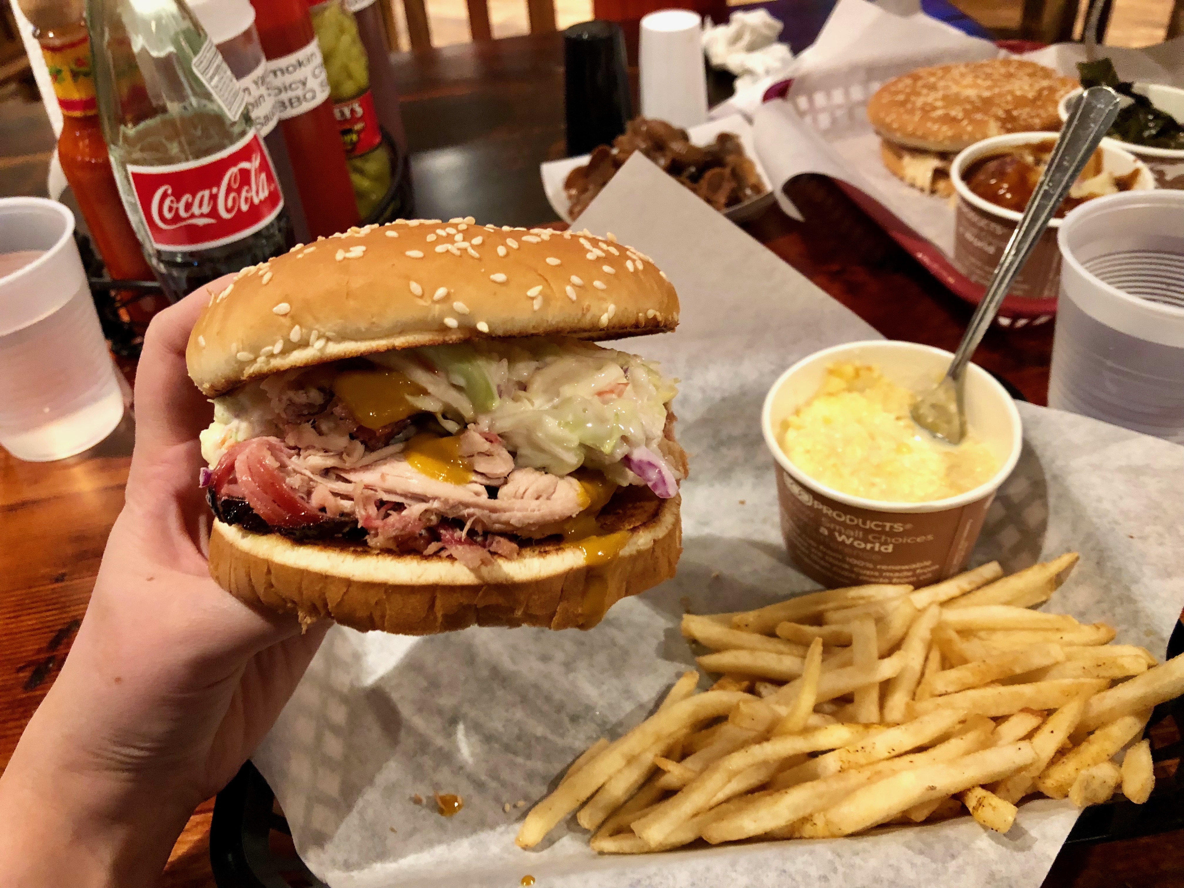 The menu also includes ribs, chicken, a brisket sloppy jo, fried catfish, chicken fried steak and more. And, if you’re like us and can’t get enough, the menu also offers to-go food, including carry-out smoked meats by the pound ($14.99-17.99).