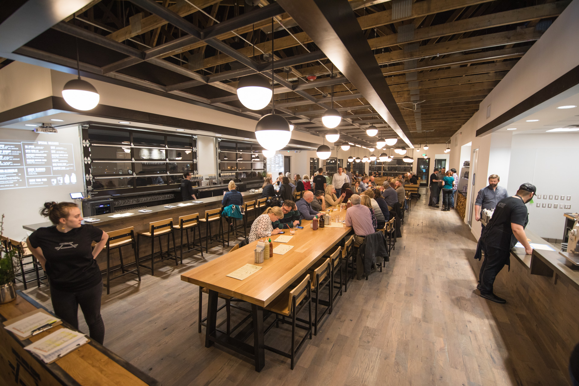 Long, community-style tables line the space, along with a firepit-filled deck and a private dining room inside the barrel-aging cellar.