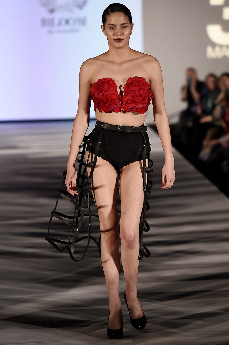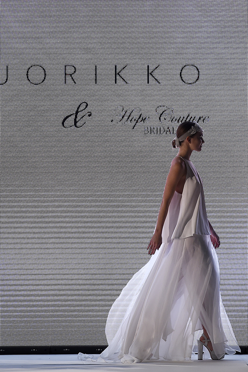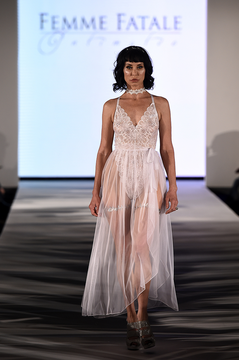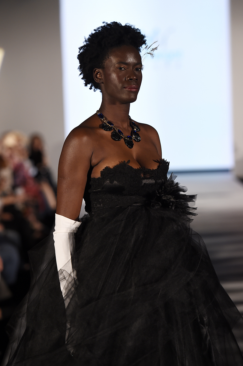 The theme of the night was indeed bridal, but each designer focused on different elements of wedding wear. Femme Fatale Intimates started off the evening the way most wedding nights would end — with lingerie. Models in various stages of undress flaunted delicate but ultra sexy unmentionables in shades of white. Nuorikko, another local brand, followed with a more traditional, but exquisite showcase. Separates and clean lines were the name of the game for the brand known for its custom pieces. Next DFW veteran, Marie Margot Couture ended the first segment with a beautiful display of custom wedding dresses and a few separates but deviated at the end with a gorgeous black tulle ballgown.