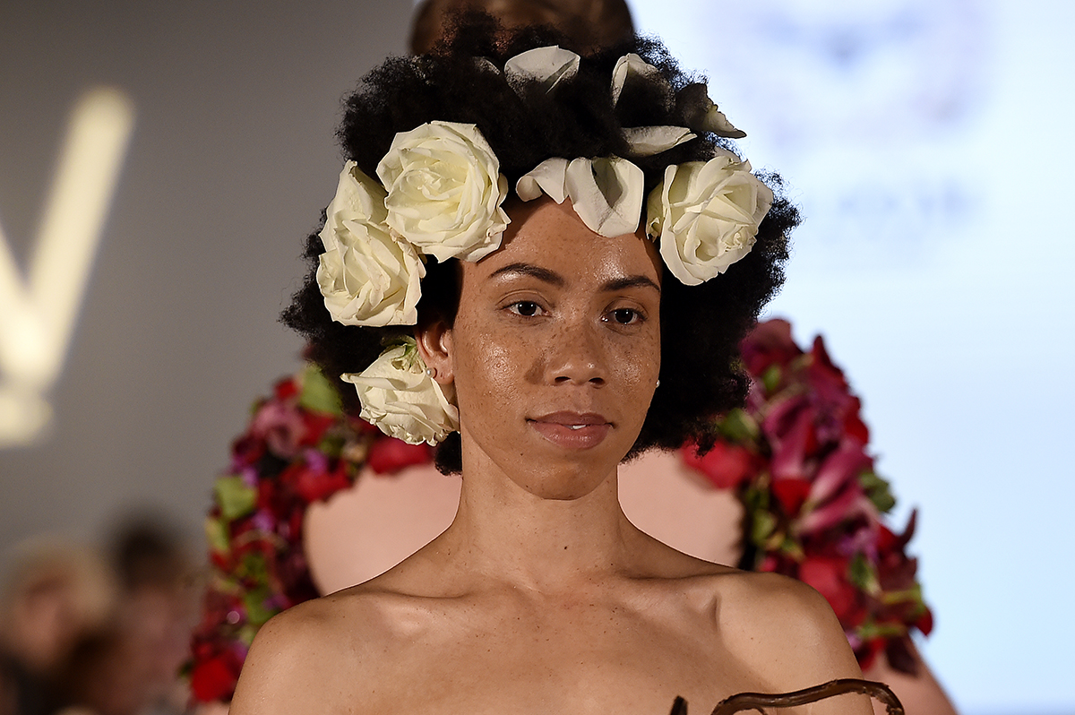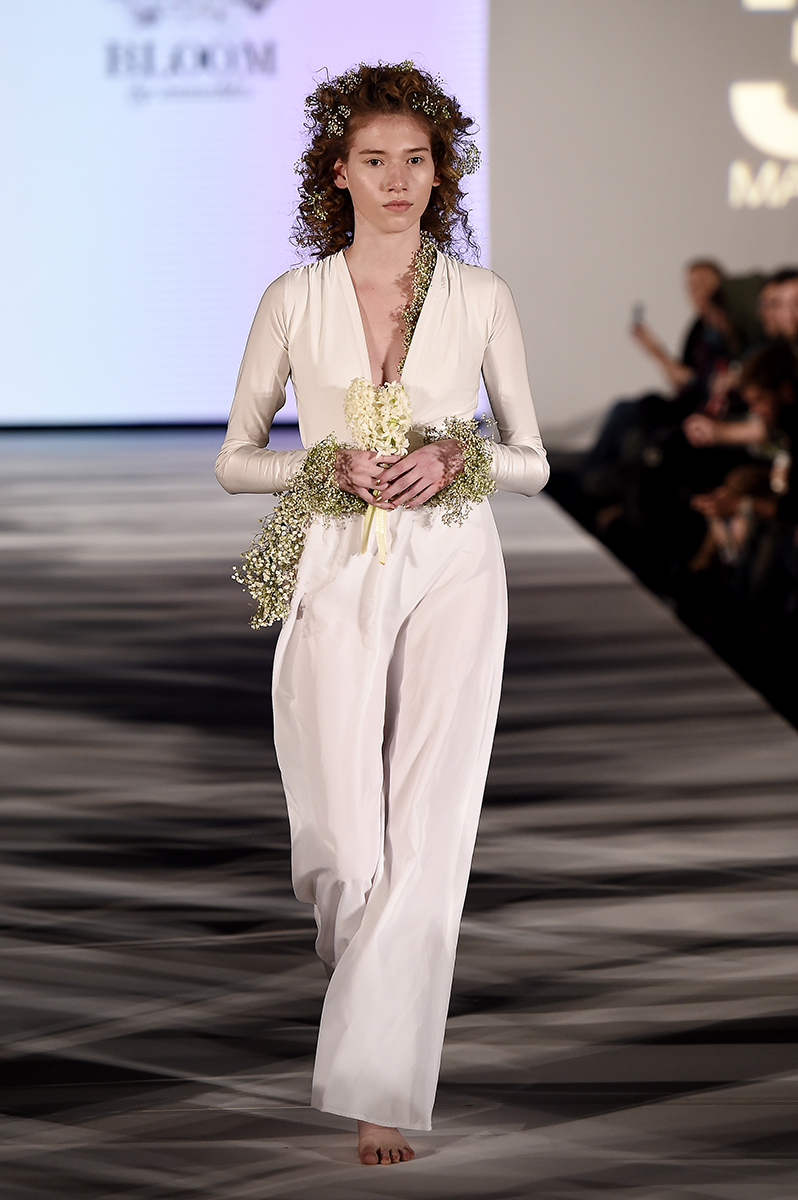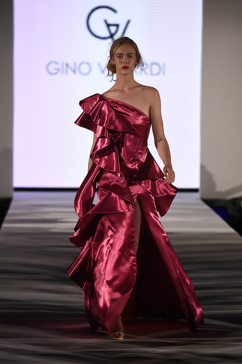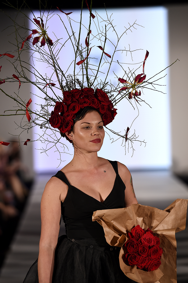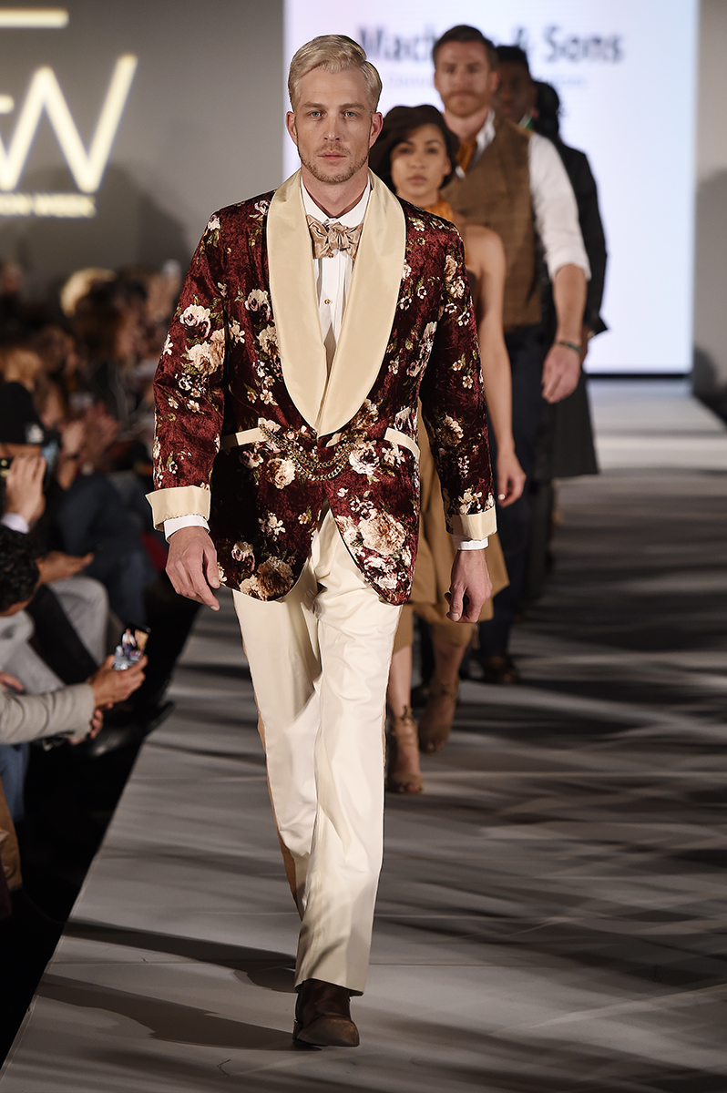 After a brief intermission, and several more awards, the night returned with Gino Velardi. The local designer is known for his glamorous apparel, which he showed off with cocktail and party dresses perfect for a reception. Several of his pieces though, like his fuschia gown made of cascading ruffles, might be better for a wedding crasher as they are bound to steal the spotlight. Denver Bespoke By Machete & Sons followed suit with elaborate menswear that would easily make the groom the center of attention. Luxurious satin smoking jackets, jewel-toned ascots and a hint of steampunk marked the unique runway segment. Last but not least, we had Bloom. Although not traditionally a clothing shop, the team of florists used their creativity to mastermind avant-garde looks that revolved around traditional wedding flowers and gorgeous foliage. There was a rose petal bustier, suit cuffs made of baby’s breath and orchid accents. Each made with living flowers, Bloom’s pieces were a literal breath of fresh air.