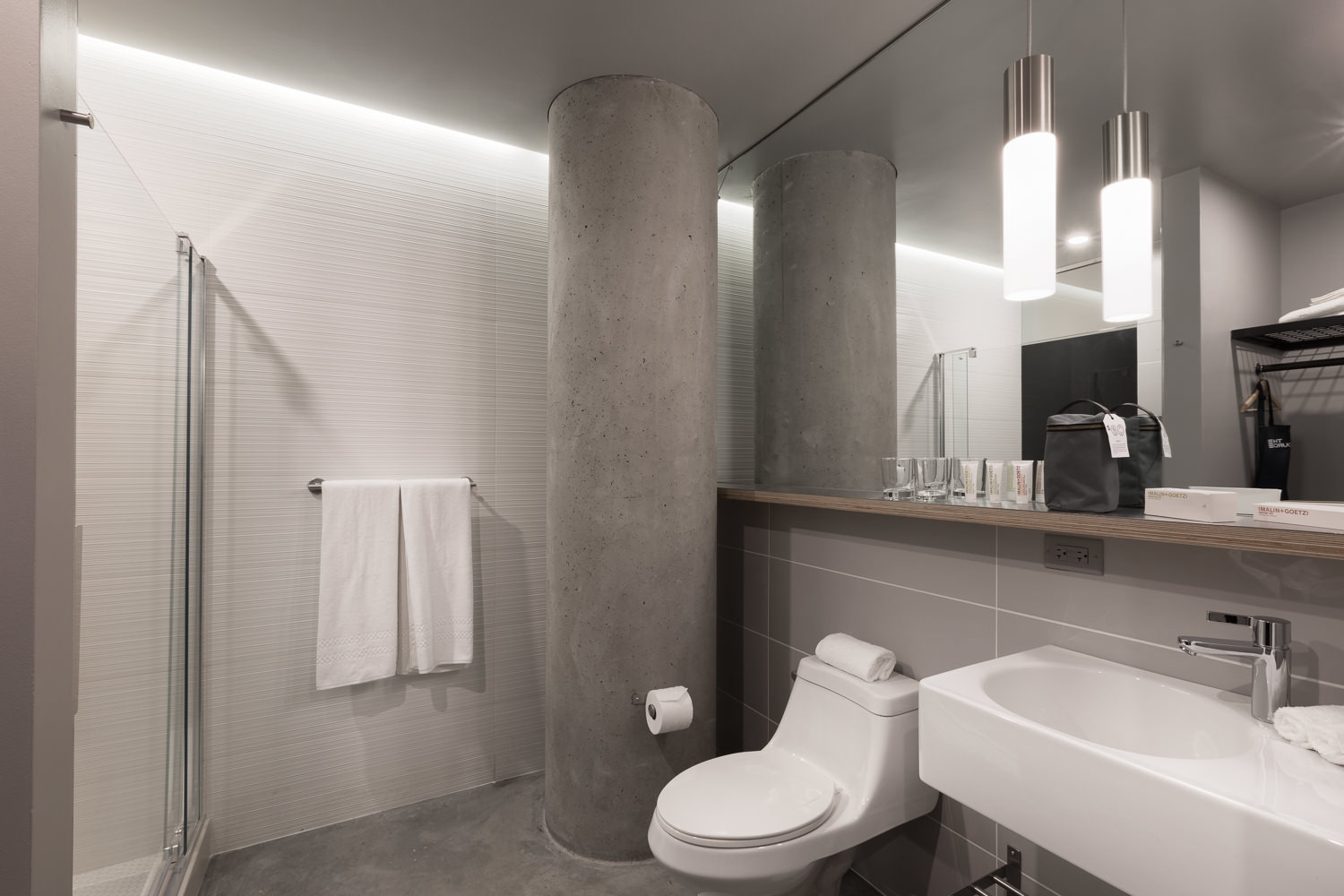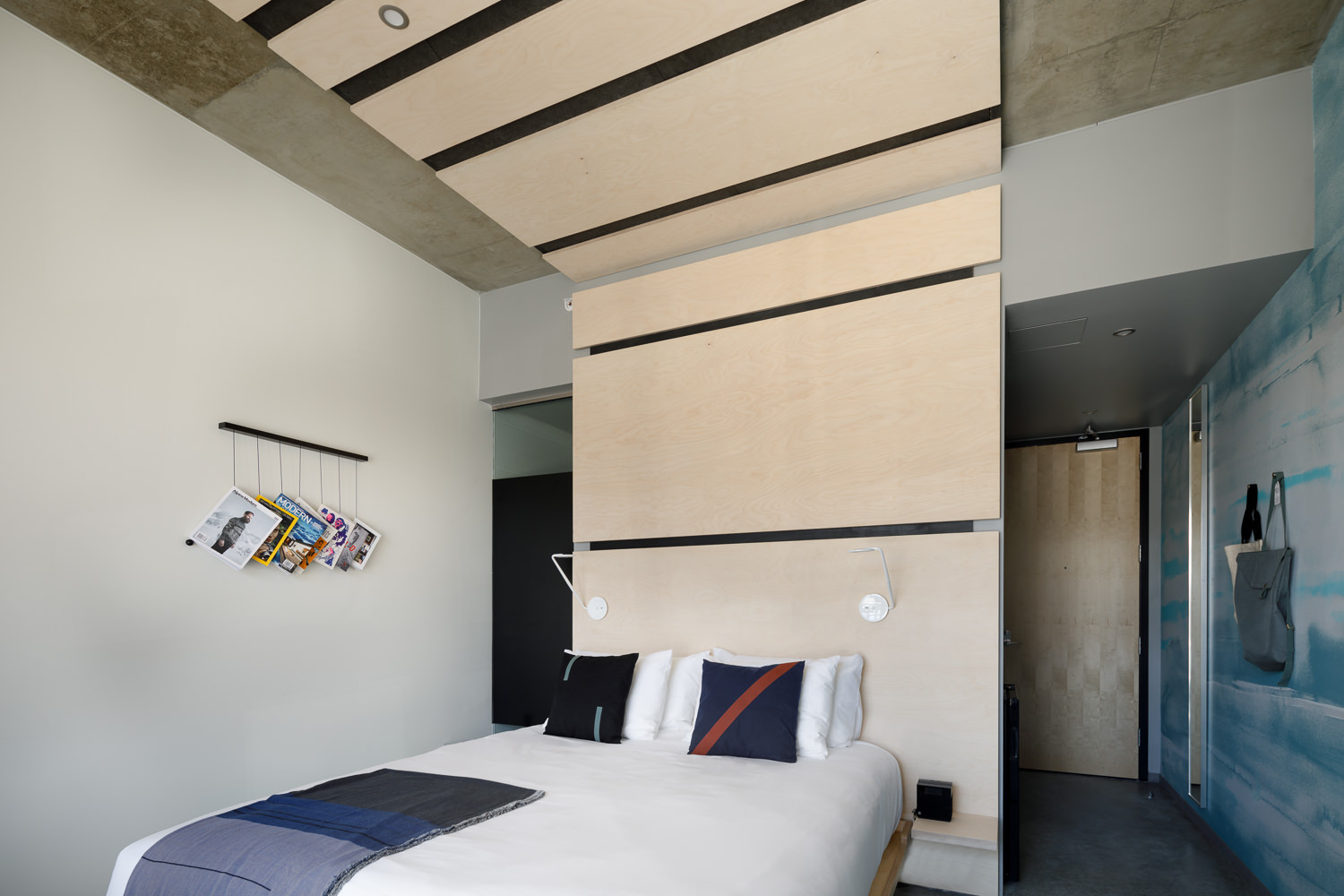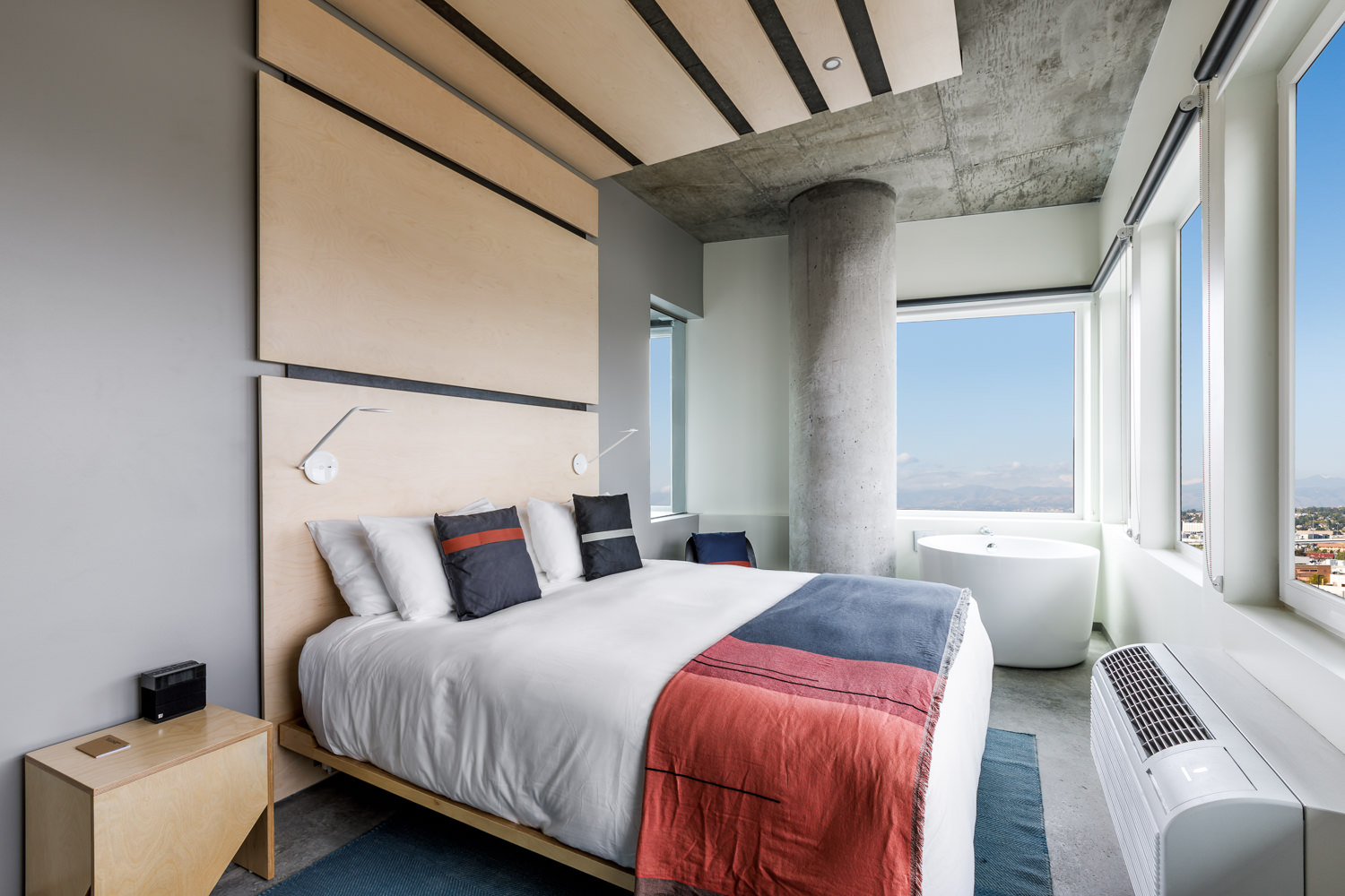 After you pass through the lobby, with a barber shop, the aforementioned restaurants and a 2,300 square-foot event space (also with sweeping views and open-air garage doors, you’ll reach the hotel rooms.
