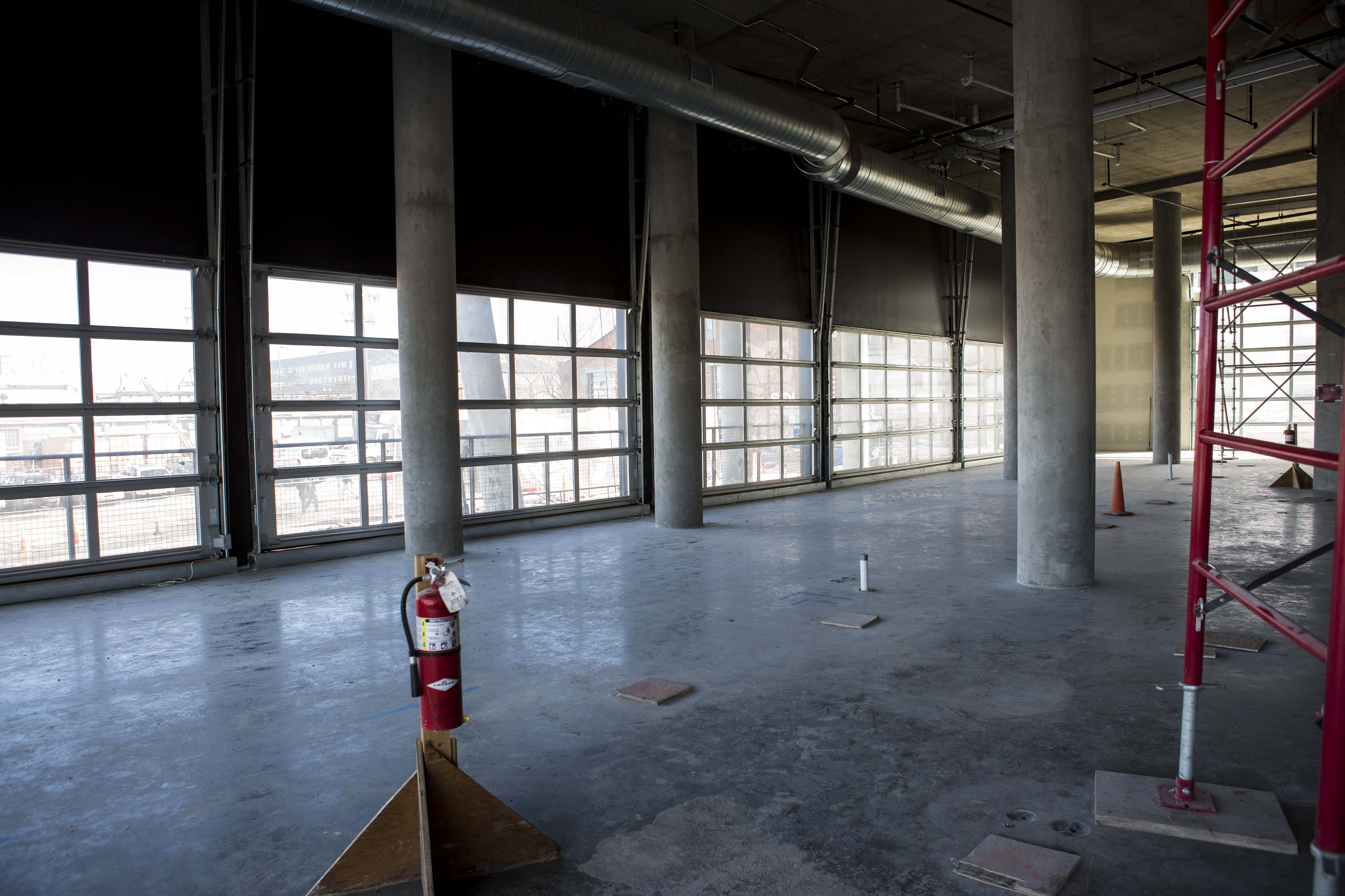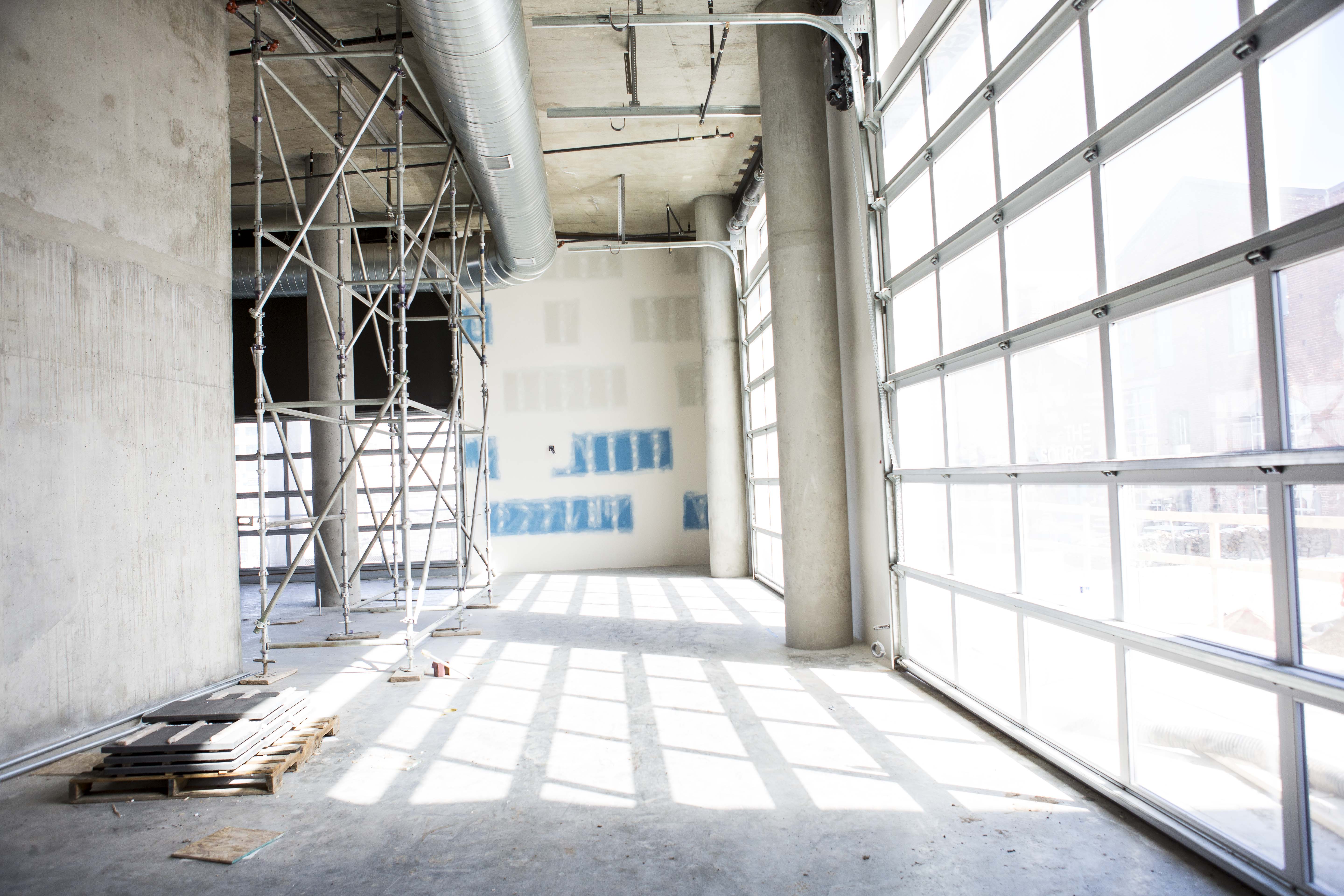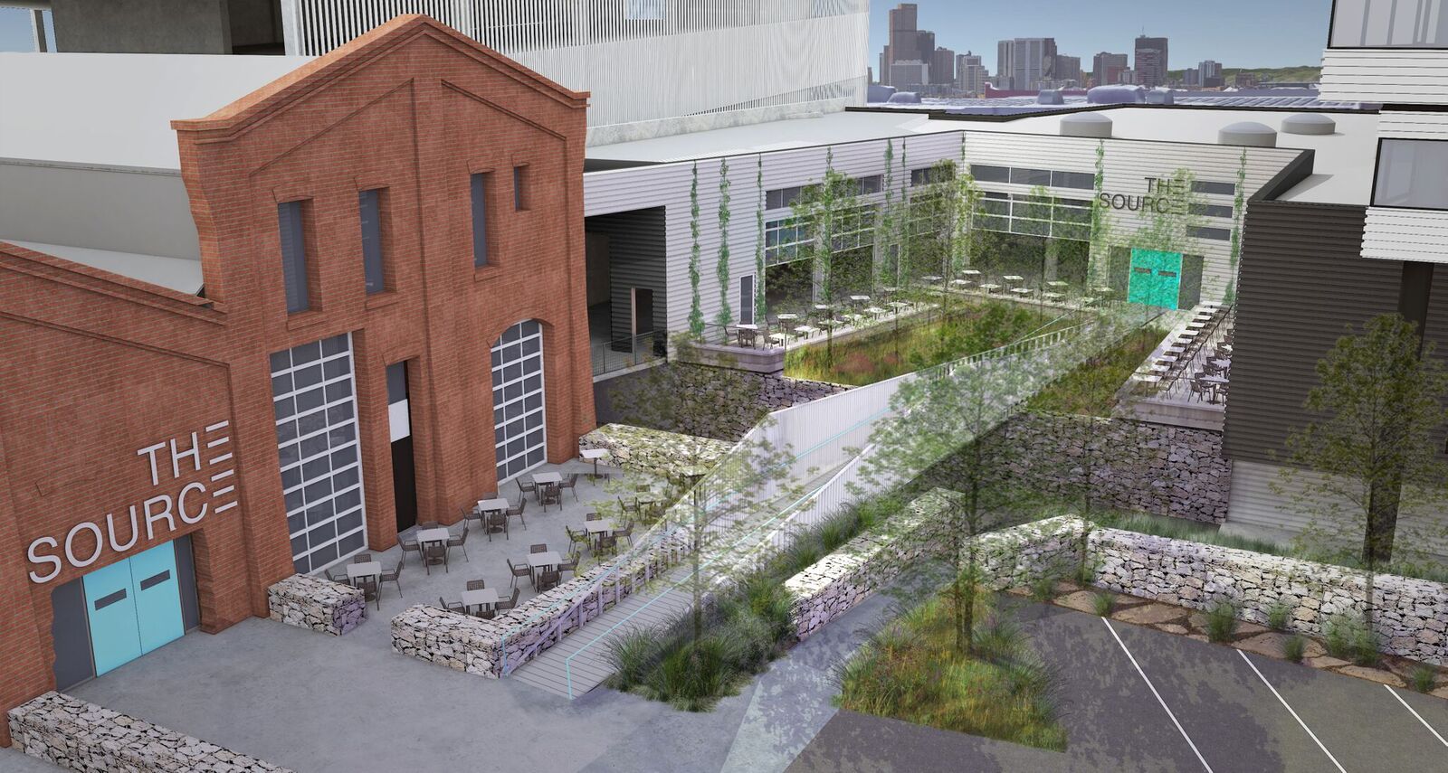 Interior plans were drawn to match the metal and brick notes of The Source while also adding modern touches of concrete and lots of natural light. Most of the 100 hotel rooms will feature floor-to-ceiling windows, but — most notably — about 20 rooms will have raiseable garage doors on the far wall to open the space up completely.